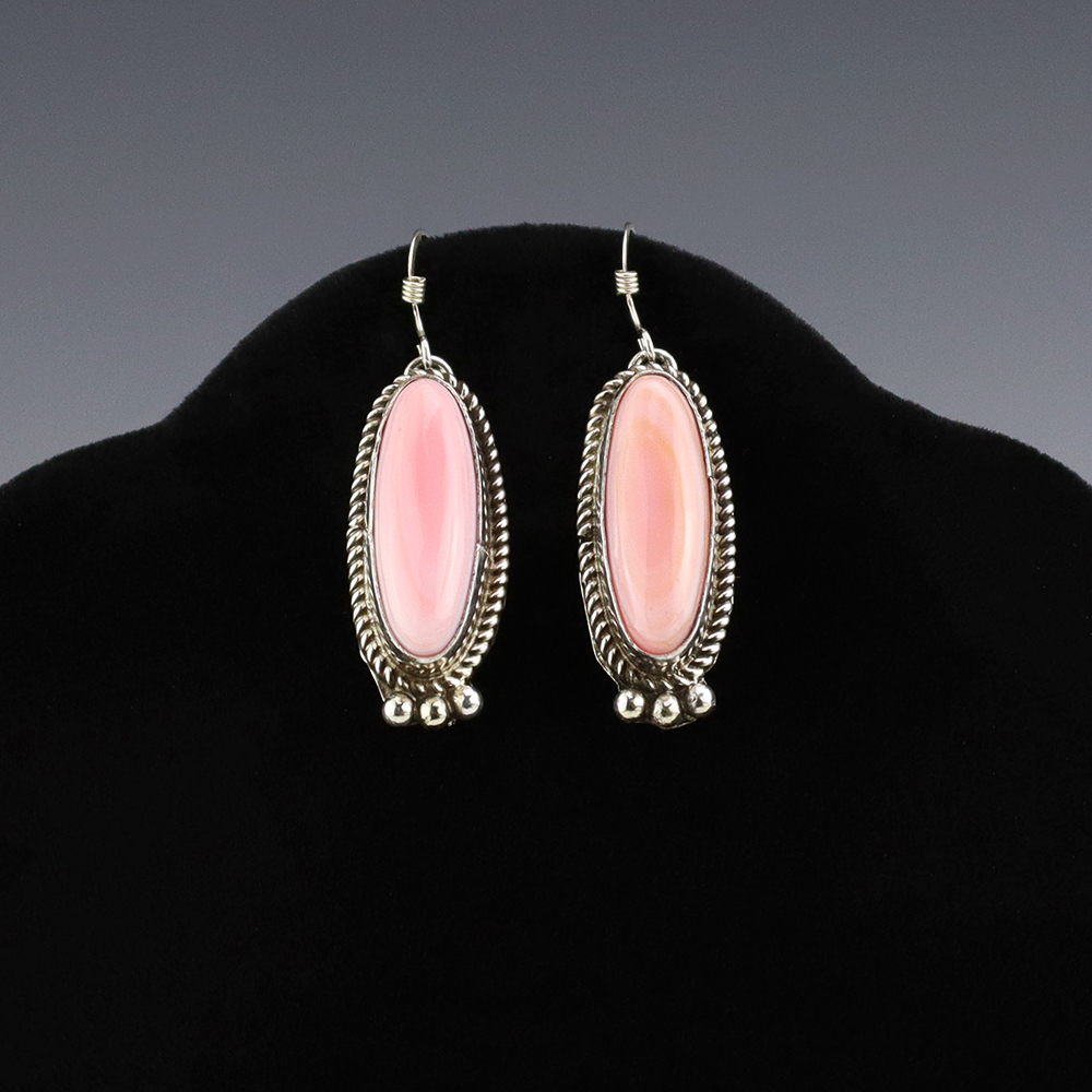 Beautiful earrings hand made out of sterling silver and Pink Conch by Navajo silversmith Priscilla Smith. These wonderful earrings will become a versatile accessory in your jewelry collection. Weighs 8 grams. Signed