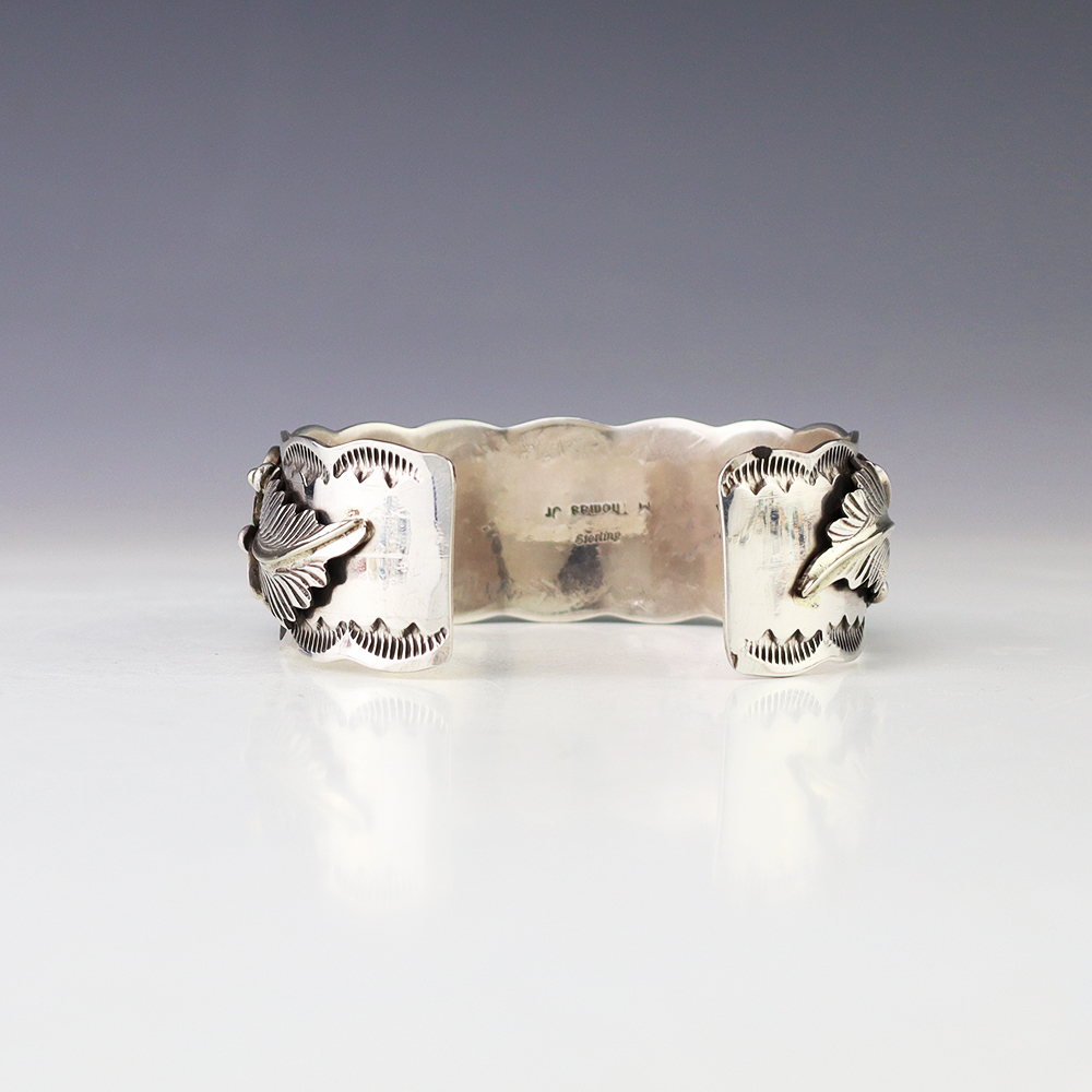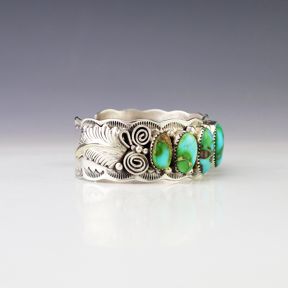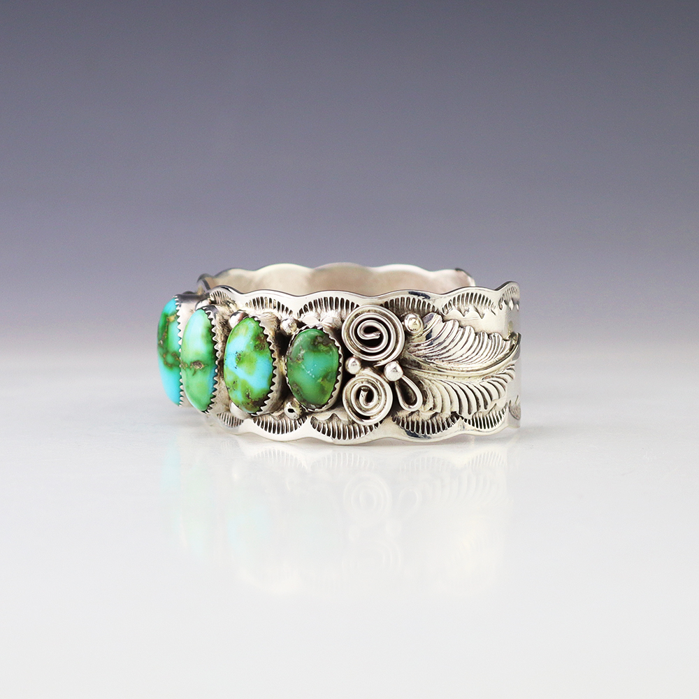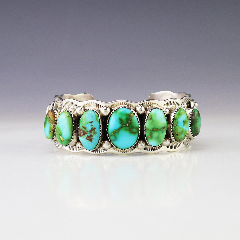 The Navajos began working with silver in the 19th century, and began making things like buckles, bridles, buttons, rings, canteens, hollow beads, earrings, crescent-shaped pendants (called “najas”), bracelets, crosses, powder chargers, tobacco canteens, and conchos (for belts). Their silversmithing skills has evolved and changed throughout the years, and in about 1880 Navajo silversmiths started to set turquoise in their silver work. Traditionally, Navajo artists worked with jewelry techniques like repousee and stamp work, but today they explored in other Native American jewelry making techniques like Zuni inlay work and Hopi overlay work