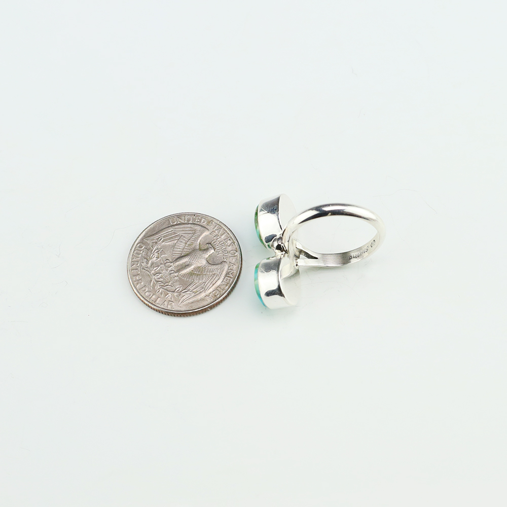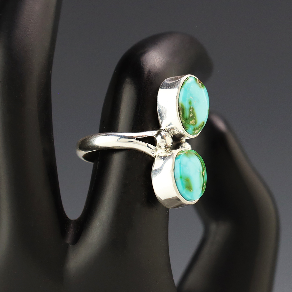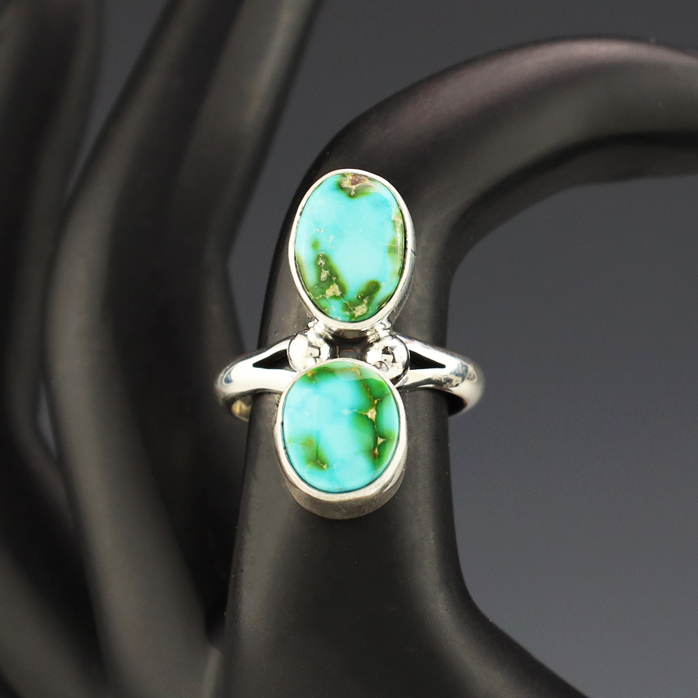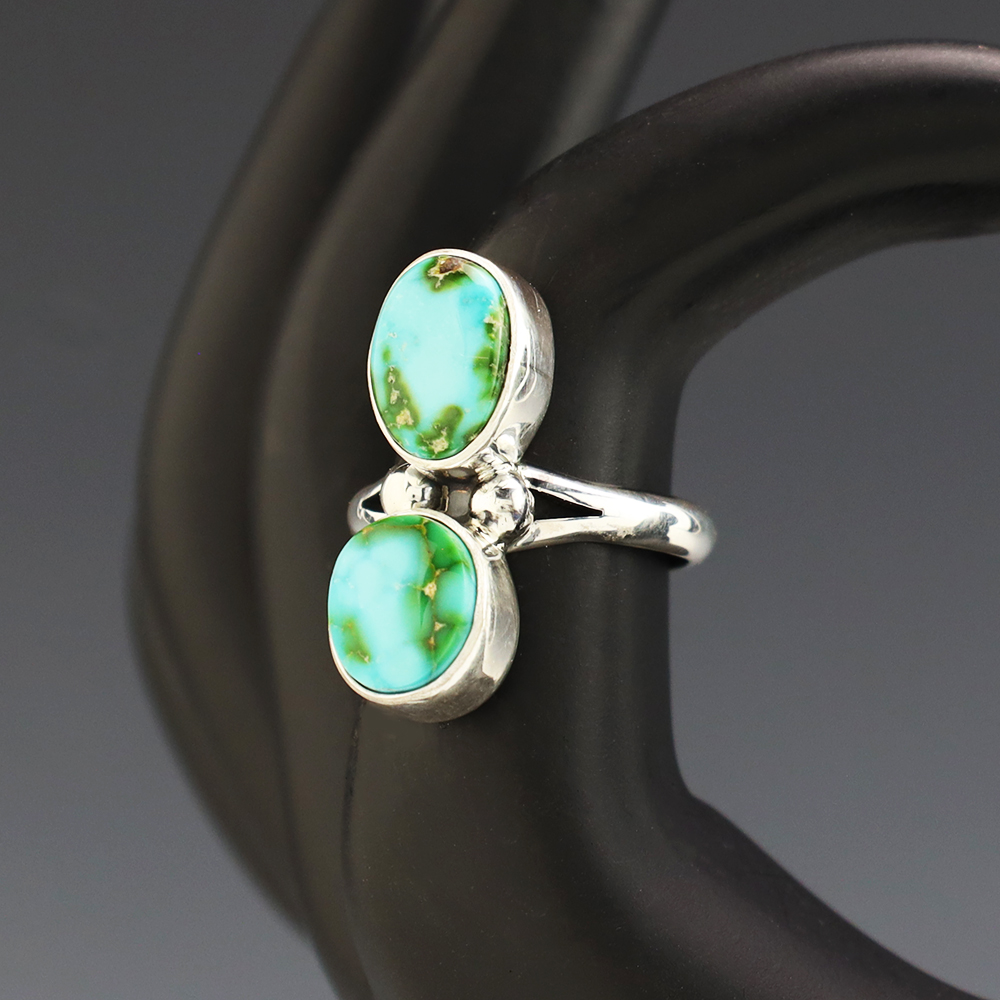 This beautiful ring was hand made out of sterling silver with Sonoran Gold Turquoise stones. It is a great representation of hand made Navajo jewelry. Size 7. Weighs 8 grams. Signed