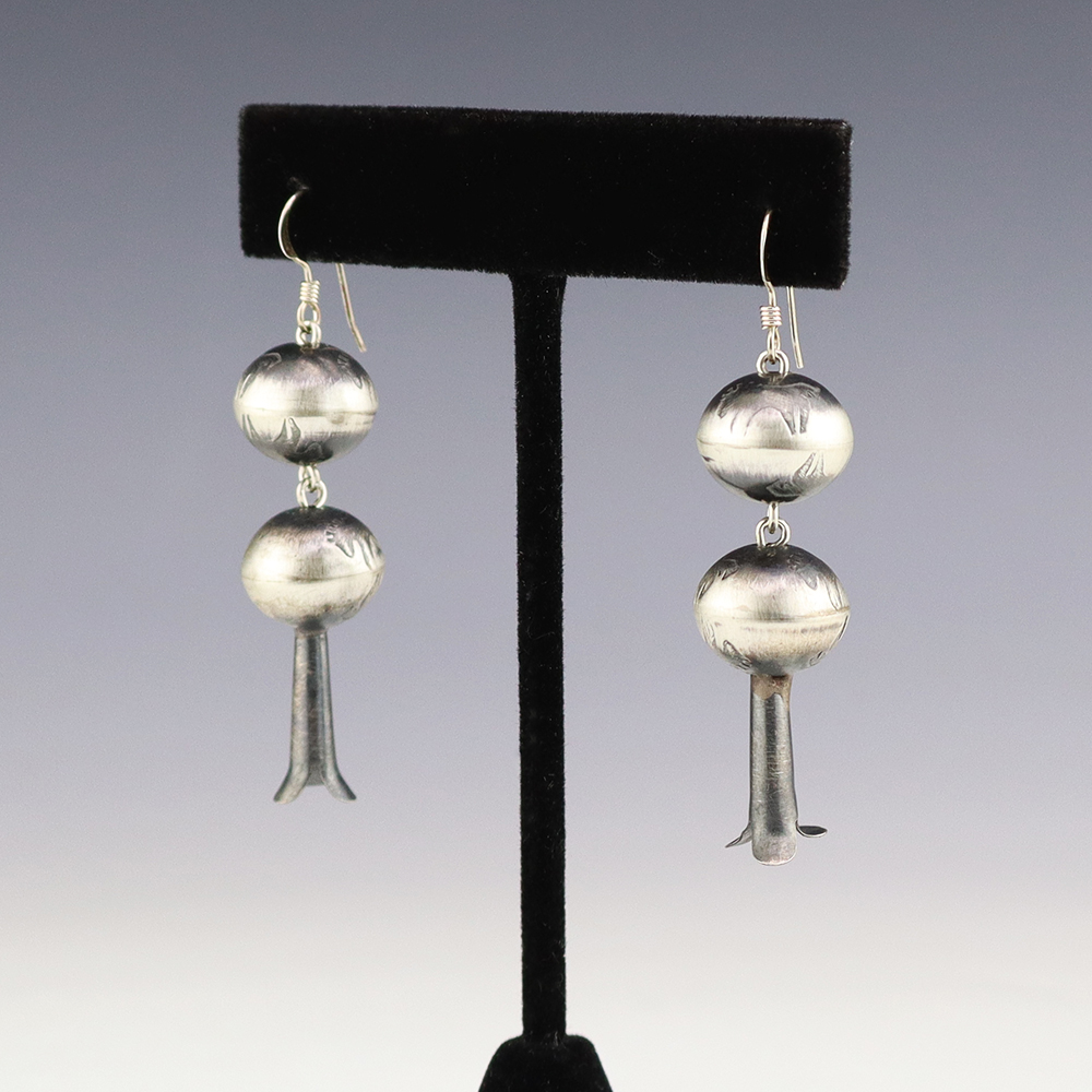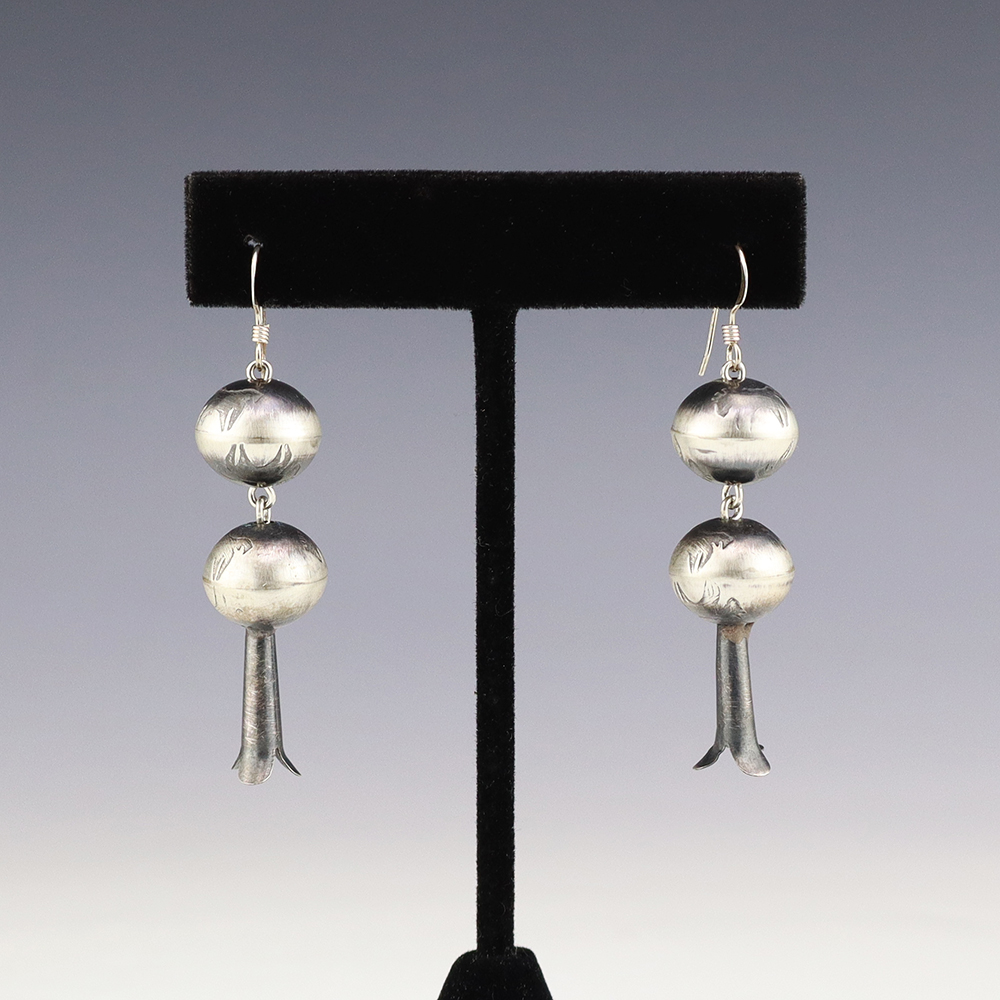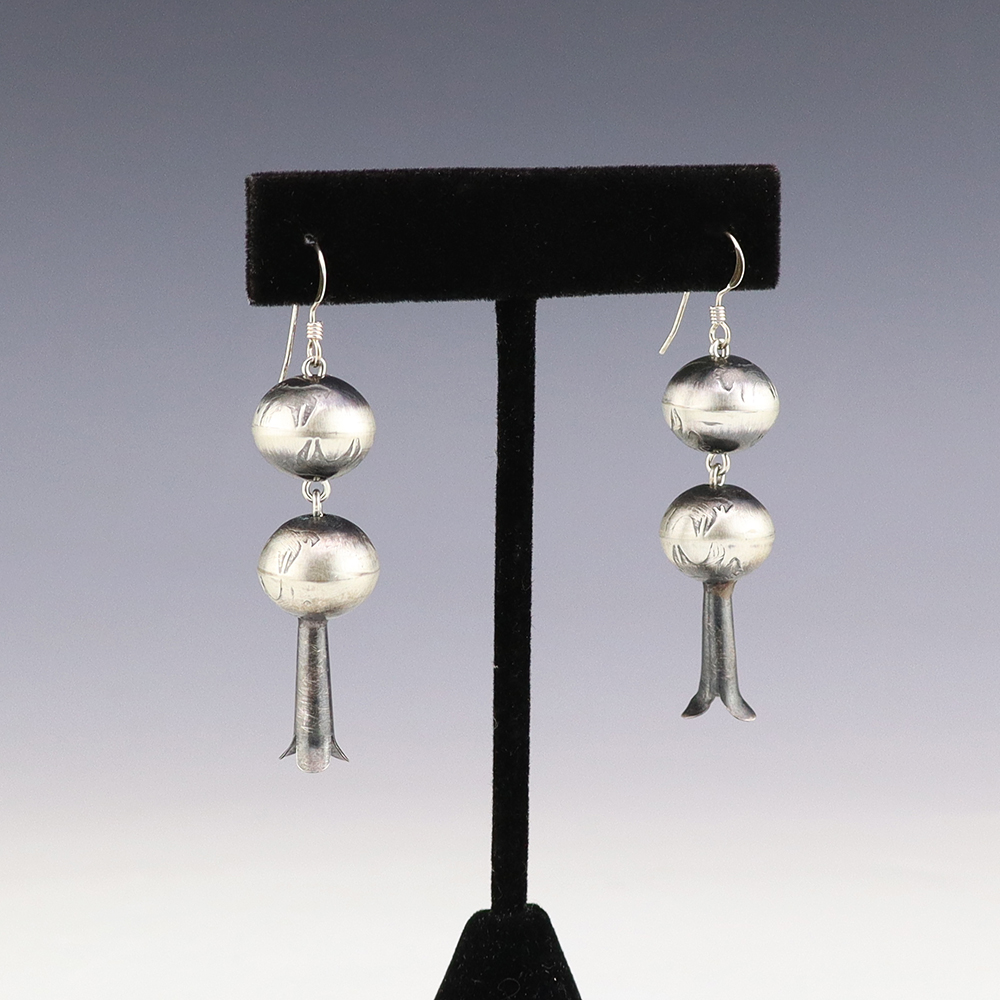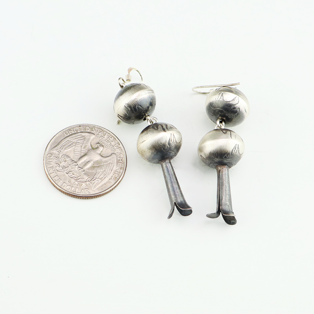 Beautiful squash blossom earrings hand made out of sterling silver. Hand made by Navajo silversmith Preston Haley. These fabulous earrings will become a versatile accessory in your jewelry collection. Weighs 8 grams.