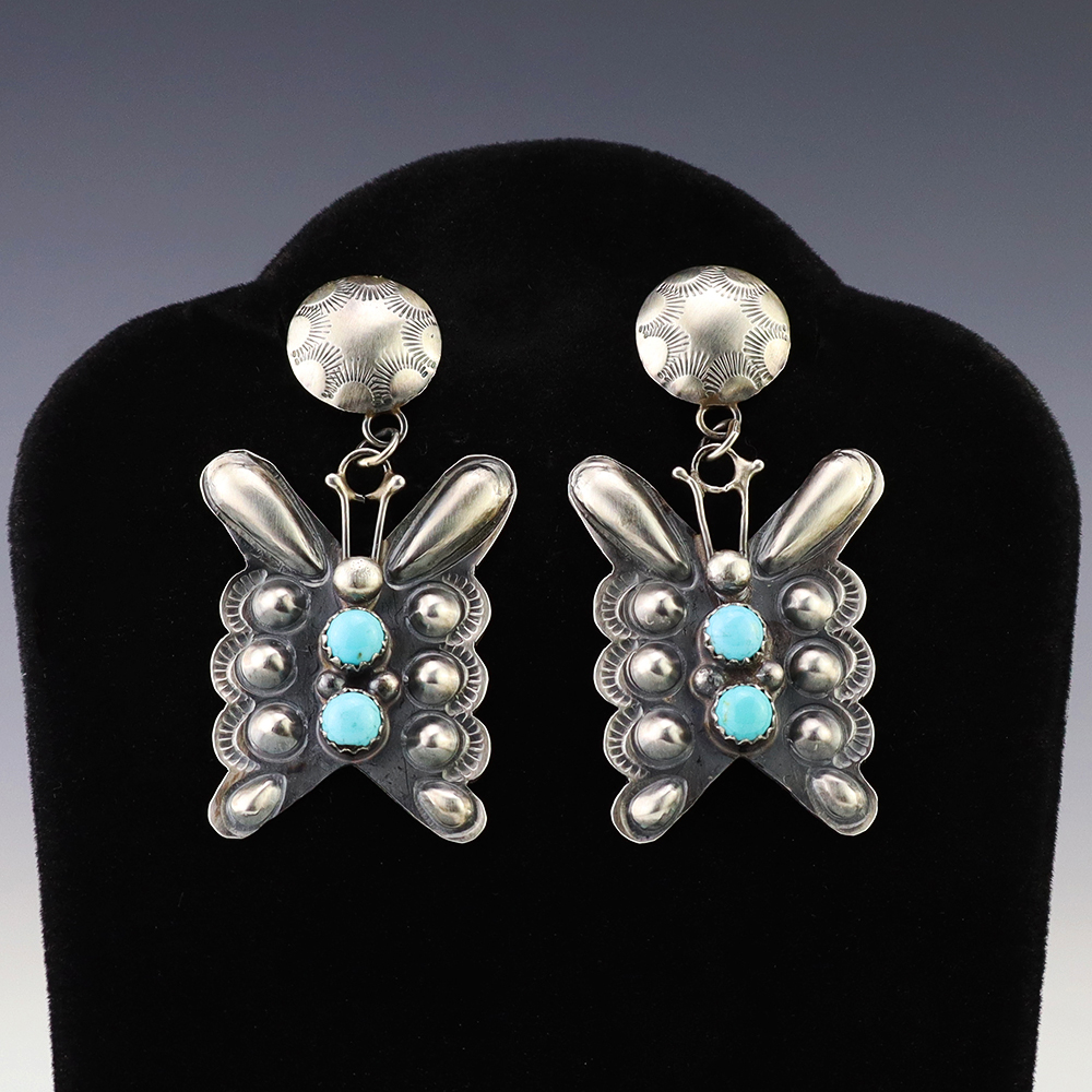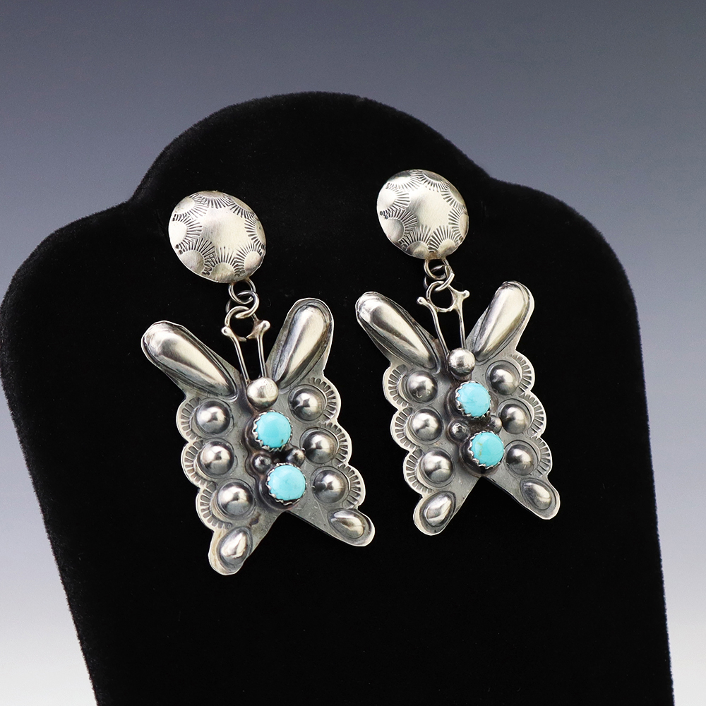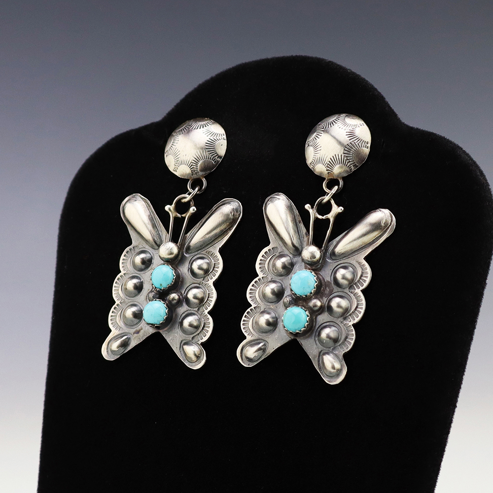 Beautiful Butterfly earrings hand made out of sterling silver and Turquoise by Navajo artist Tim Yazzie. Great repousee design and satin finish! These fabulous earrings will become a versatile accessory in your jewelry collection. Weighs 12 grams. Signed