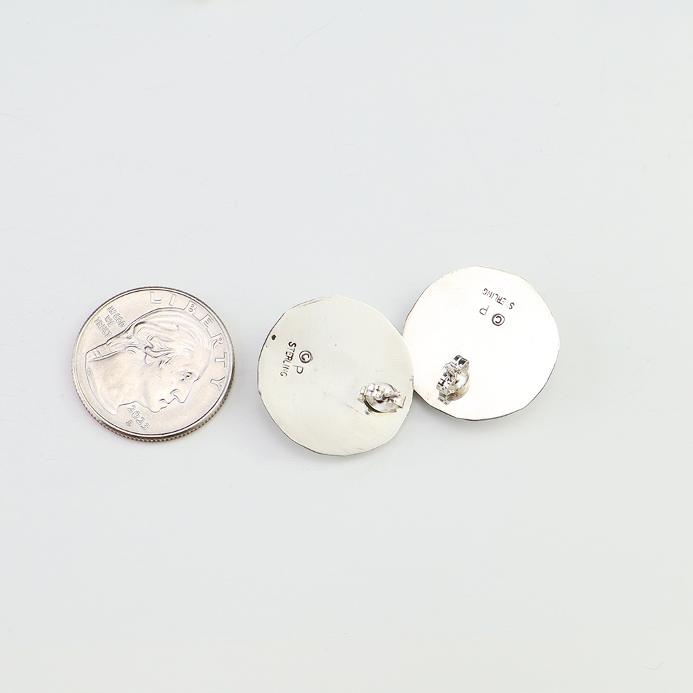 Outstanding sterling silver earrings with Mother of Pearl Shell and Turquoise inlay. Hand crafted by Zuni jewelry makers, Nancy and Sheldon Westika. The Westikas have been making jewelry since the 1970’s and they are known for their fine inlay work. Weighs 6 grams. Signed 7/8” wide x 7/8” tall 1 ...