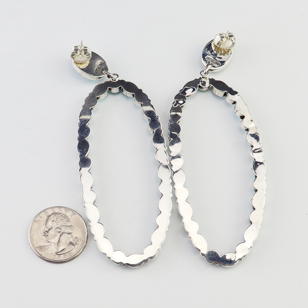 Zuni artist, Diane Lonjose created these outstanding earrings. Made out of sterling silver and set with natural Serpentine stones. Zuni artists are known for their lapidary work. Weighs 18 gram. Signed 1 1/8″ wide x 2 3/8” tall Artist card included Zuni Pueblo is the largest pueblo in New Mexico,...
