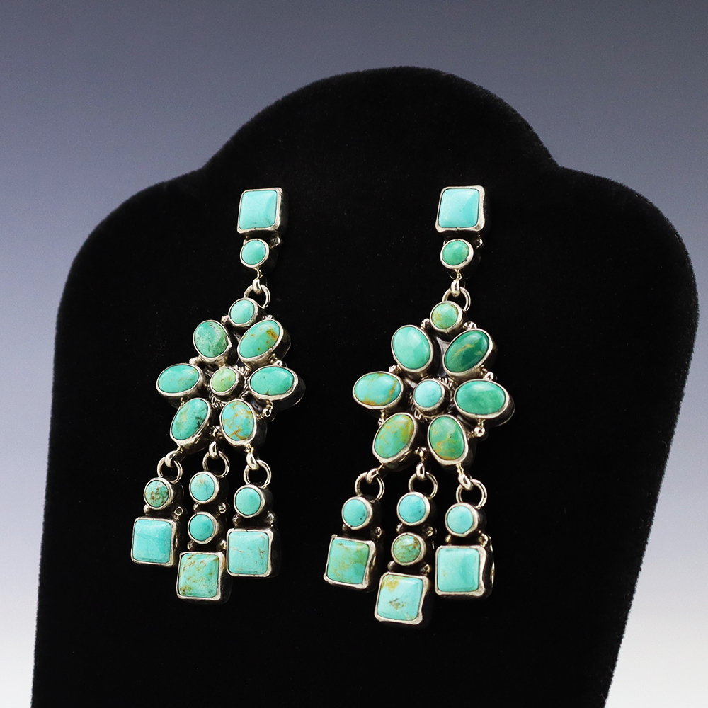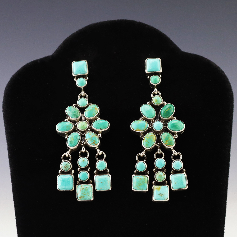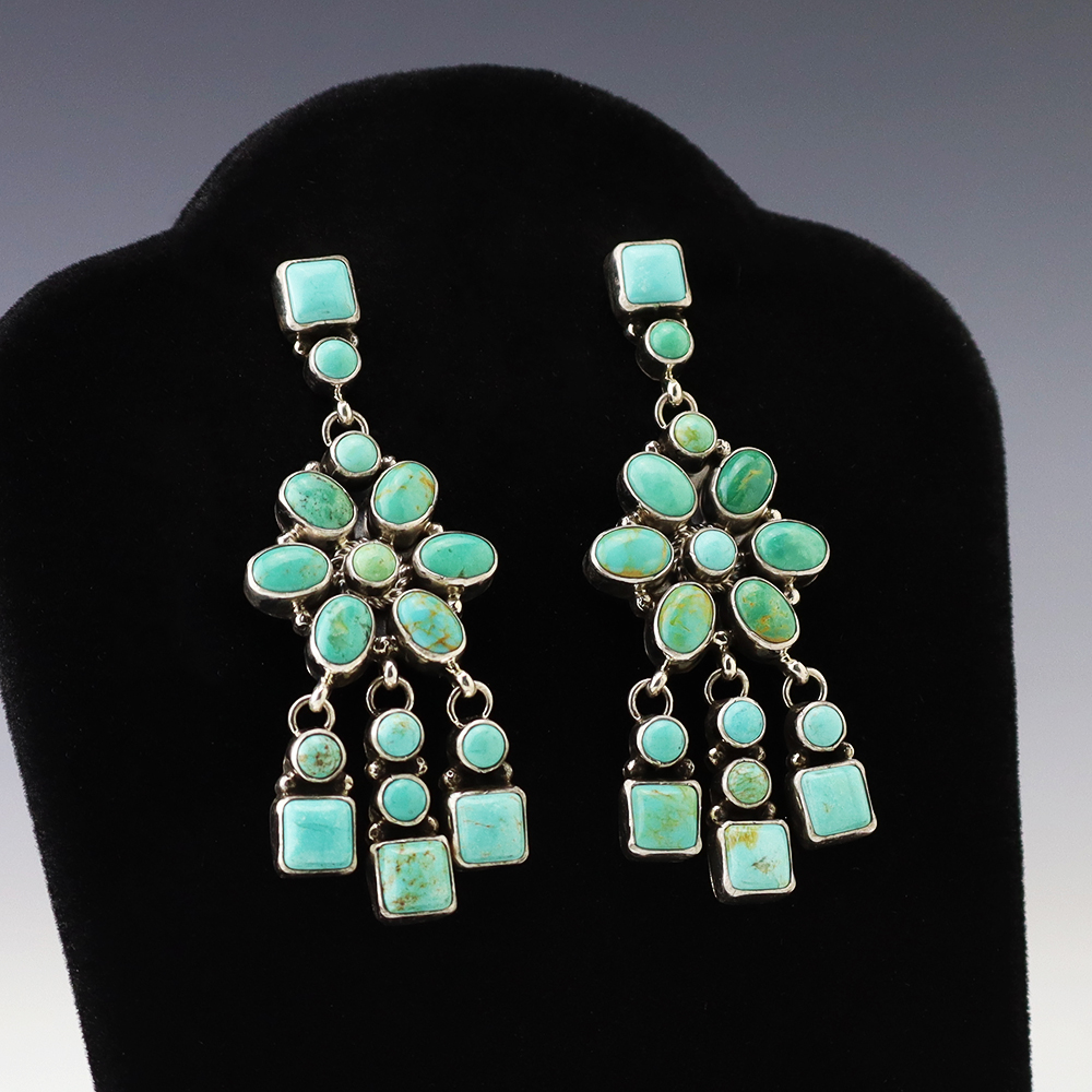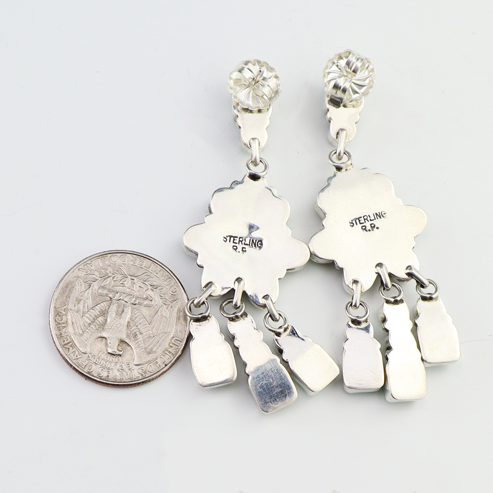 Gorgeous dangle earrings made out of sterling silver and set with Turquoise stones. Hand made by Navajo artist Renell Perry. These fabulous earrings will become a versatile accessory in your jewelry collection. Weighs 16 grams. Signed.