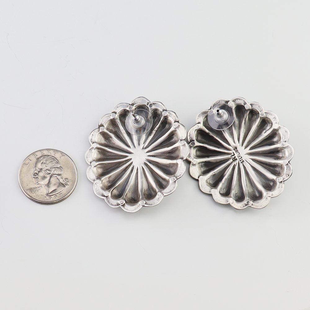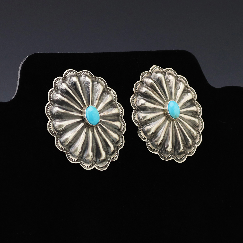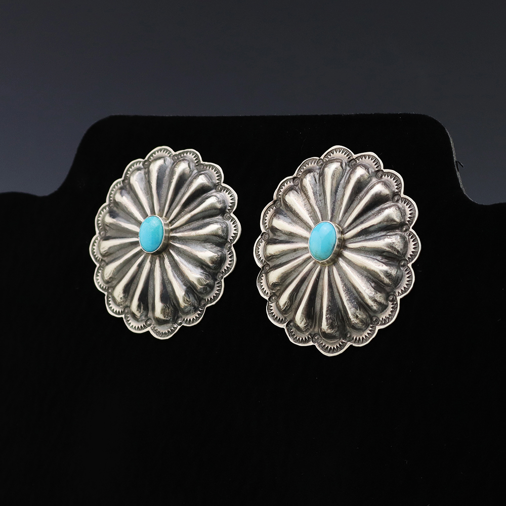 Beautiful earrings hand made out of sterling silver and Turquoise by Navajo artist Rita Lee. Great repousee design and satin finish! These fabulous earrings will become a versatile accessory in your jewelry collection. Weighs 14 grams. Signed