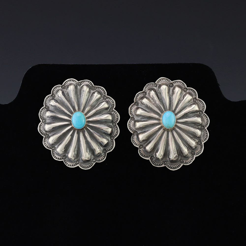 Beautiful earrings hand made out of sterling silver and Turquoise by Navajo artist Rita Lee. Great repousee design and satin finish! These fabulous earrings will become a versatile accessory in your jewelry collection. Weighs 14 grams. Signed