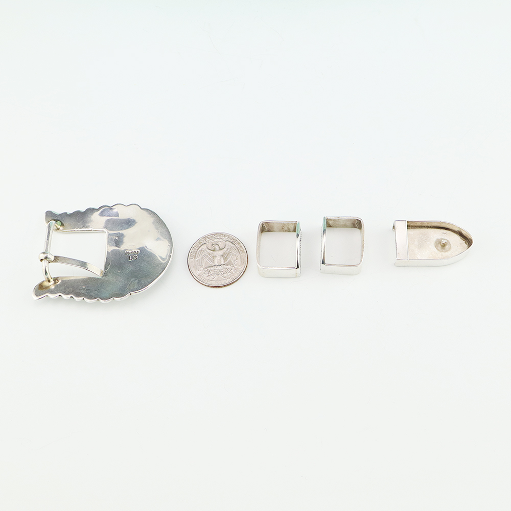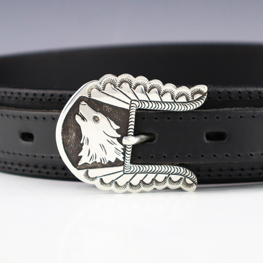 Navajo artist Lee Charley made this magnificent ranger set. Great wolf design! Made out of sterling silver. A representation of great hand made Navajo jewelry. Weighs 50 grams. Fits a 3/4” belt. (Belt not included) Signed