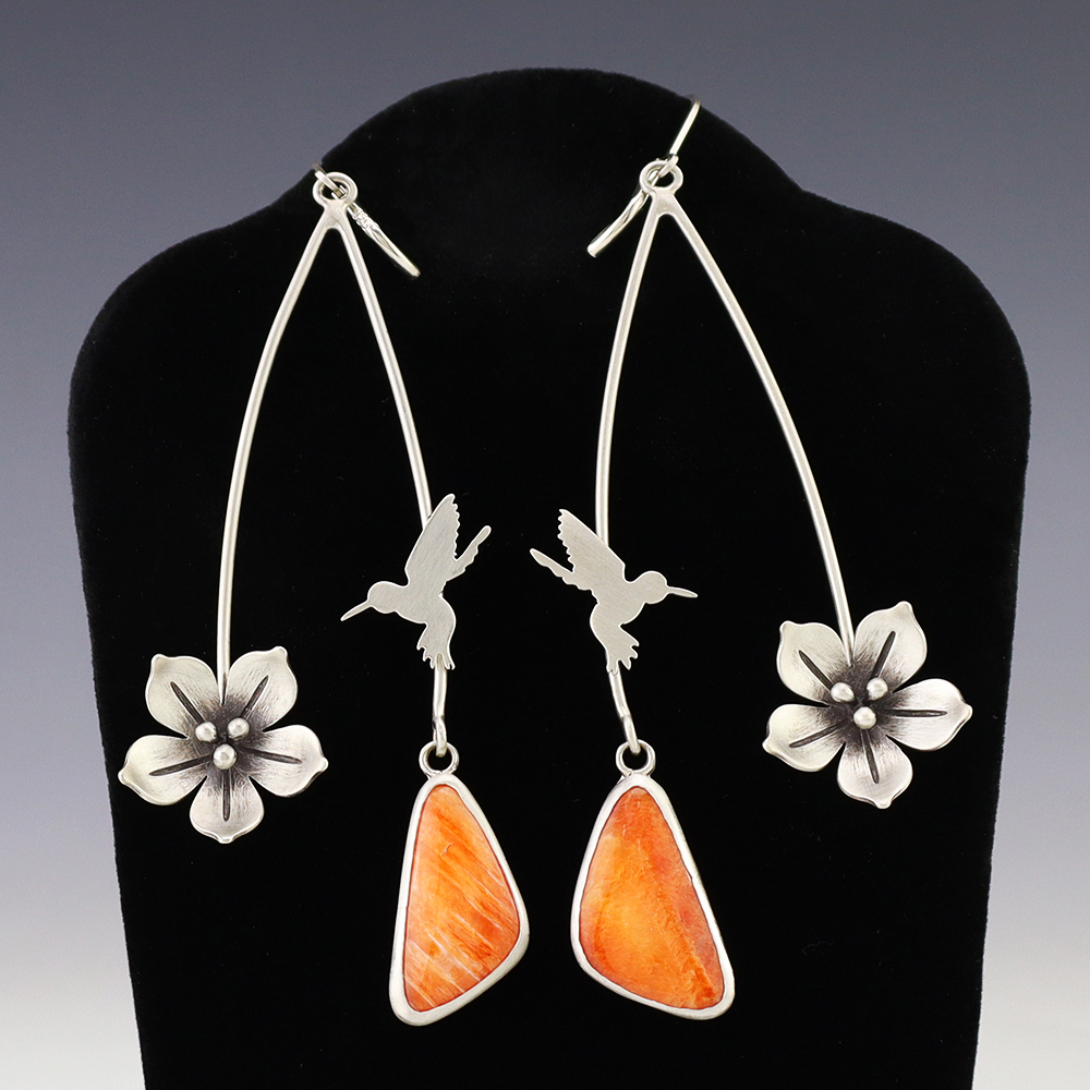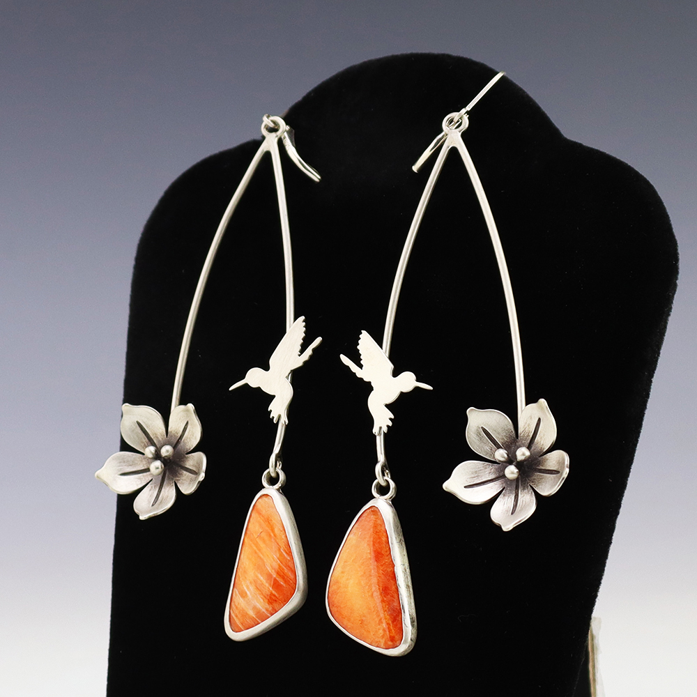 Gorgeous hummingbird earrings made out of sterling silver and set with vibrant Spiny Oyster. Hand made by Navajo/Hispanic silversmith Neeko Garcia. These fabulous earrings will become a versatile accessory in your jewelry collection. Weighs 18 grams. Signed.