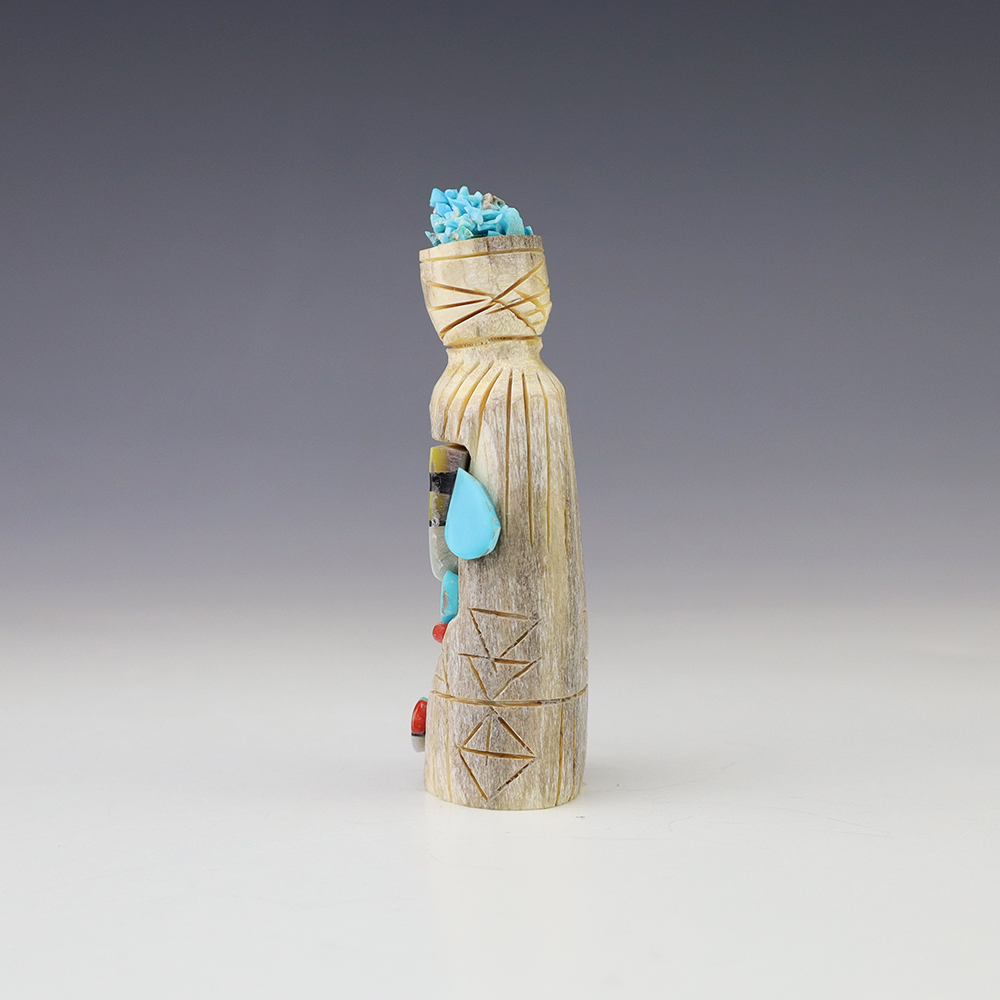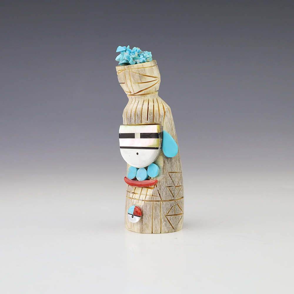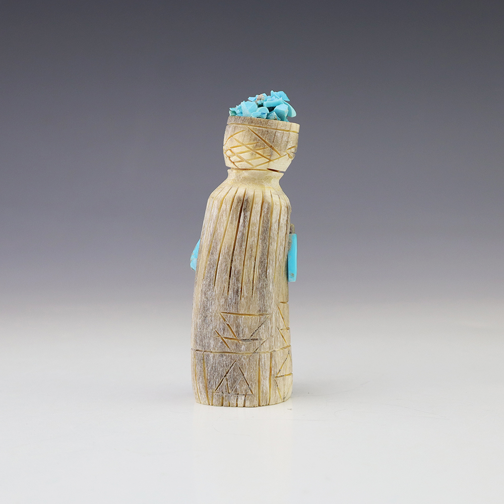 Zuni artist Gabe Sice hand carved this lovely maiden fetish. Made out of antler with intricate detail and inlaid with natural Sleeping Beauty Turquoise, Mediterranean Coral, and Penn Shell. (note-there is natural pits in the antler) This maiden would make a great addition to your Native American or Zuni fetish...