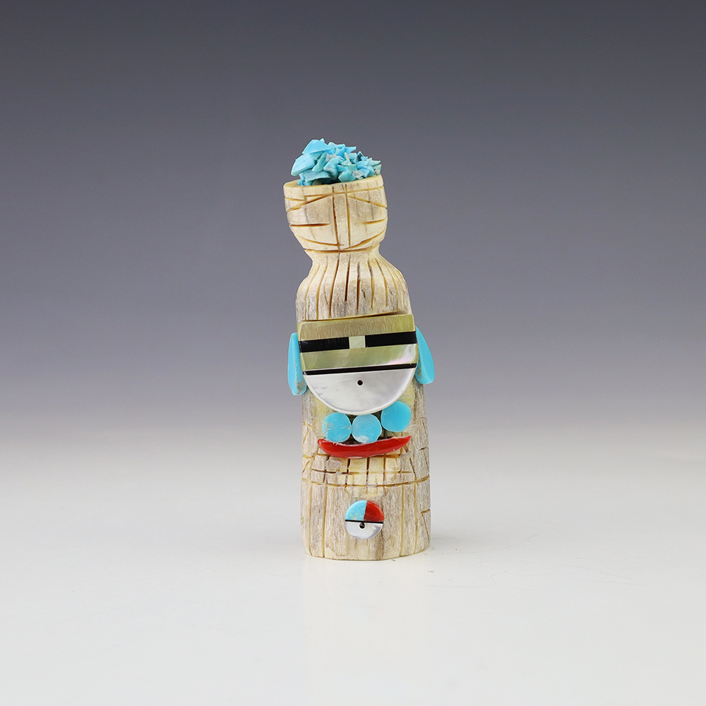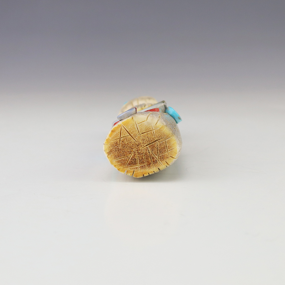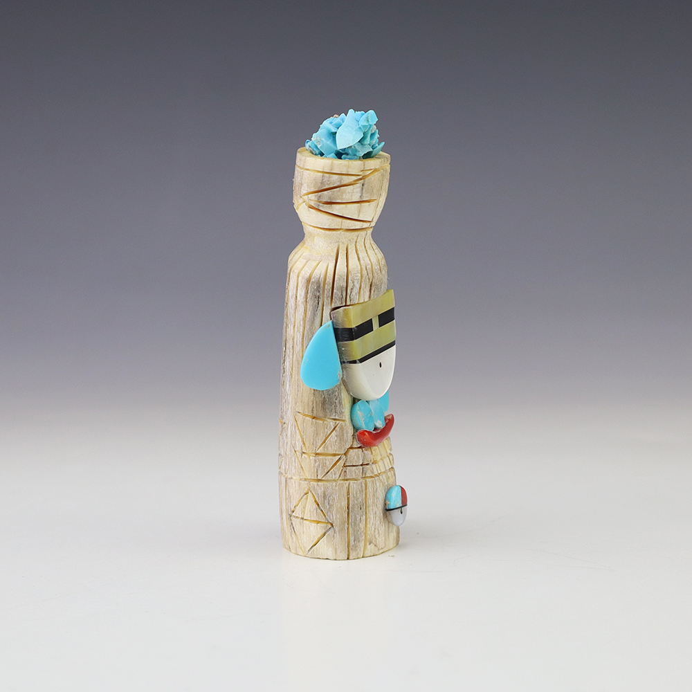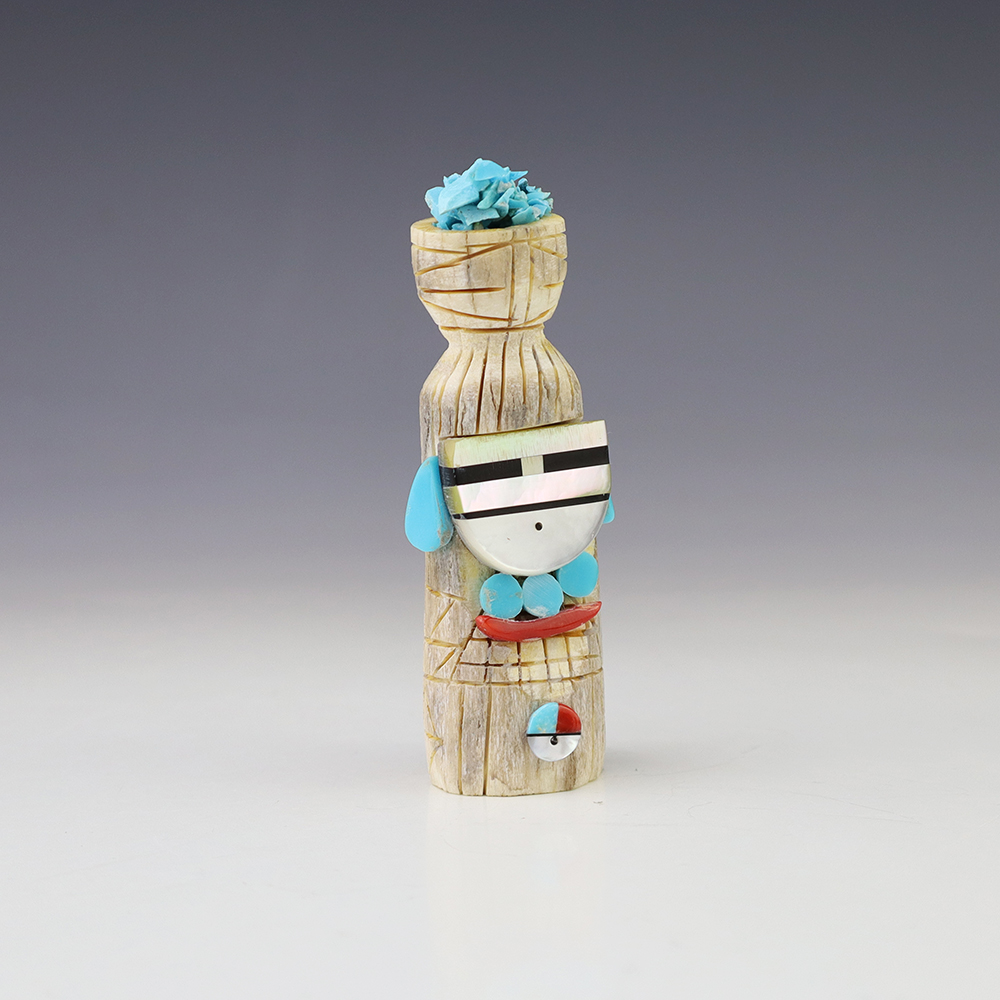 Zuni artist Gabe Sice hand carved this lovely maiden fetish. Made out of antler with intricate detail and inlaid with natural Sleeping Beauty Turquoise, Mediterranean Coral, and Penn Shell. (note-there is natural pits in the antler) This maiden would make a great addition to your Native American or Zuni fetish...