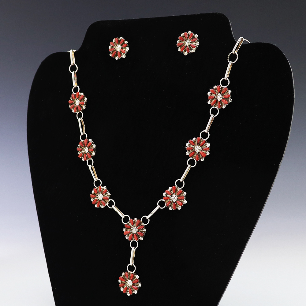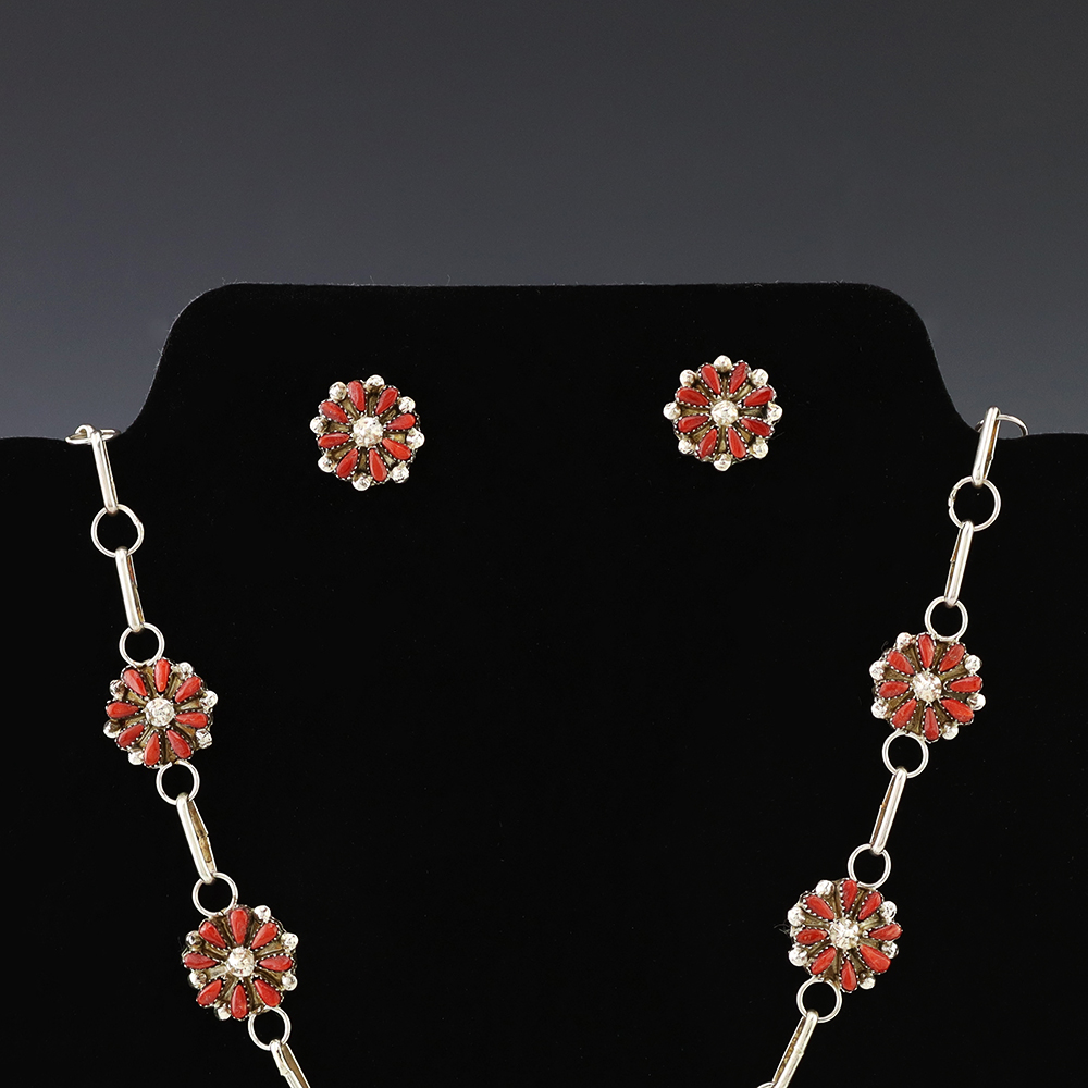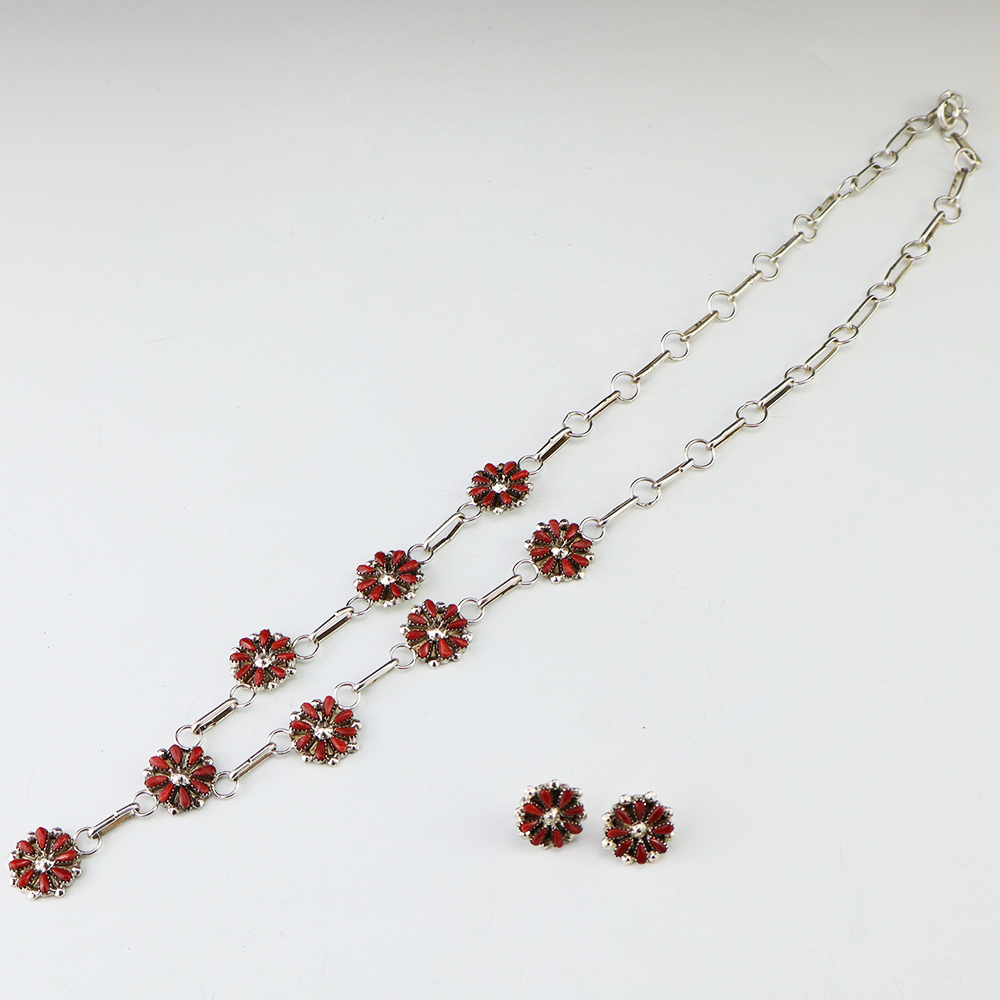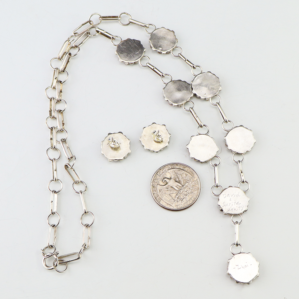 Zuni artists David and Sarita Leekity made this beautiful necklace and earring set. Sterling silver and set with Coral. An exquisite statement piece that you will enjoy for many years. The necklace weighs 22 grams. The earrings weighs 4 grams. Signed