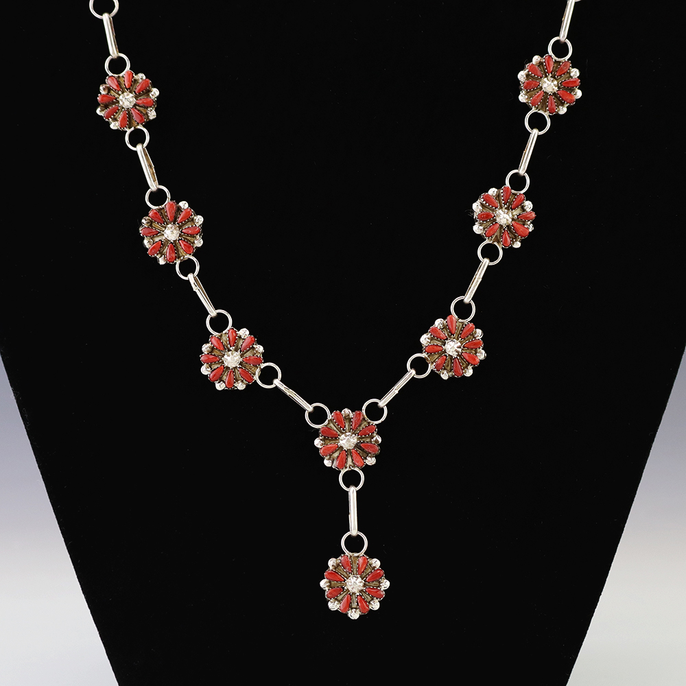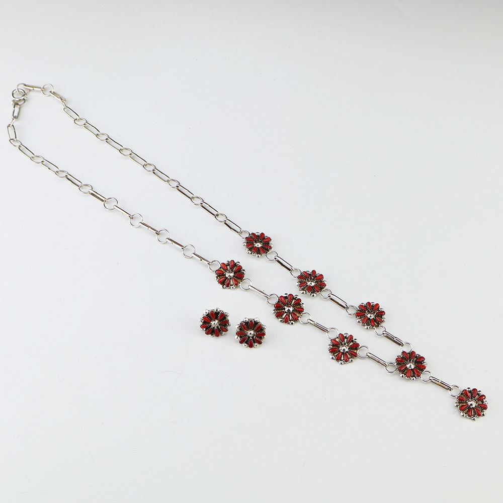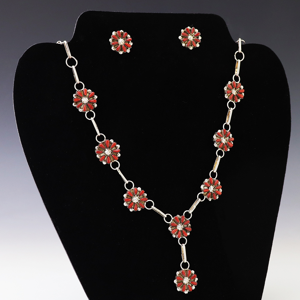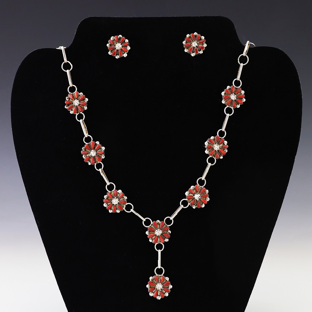 Zuni artists David and Sarita Leekity made this beautiful necklace and earring set. Sterling silver and set with Coral. An exquisite statement piece that you will enjoy for many years. The necklace weighs 22 grams. The earrings weighs 4 grams. Signed