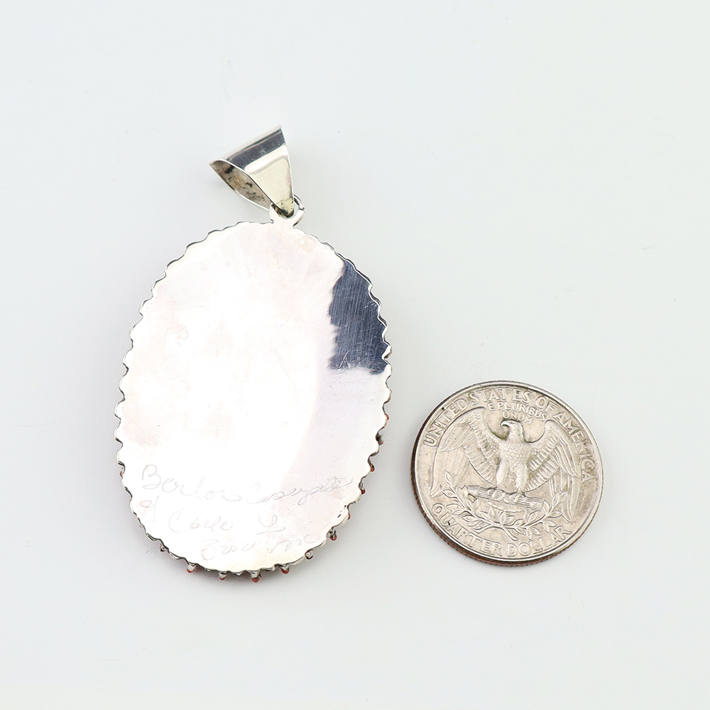 Exquisite pendant that features Turquoise, Coral, Jet, and Mother of Pearl Shell inlaid in a sterling silver setting. Hand made by Leslie and Gladys Lamy from the Zuni Pueblo. Weighs 14 grams. Signed 1 3/8” wide x 2 1/2” long Artist card included Zuni Pueblo is the largest pueblo in...