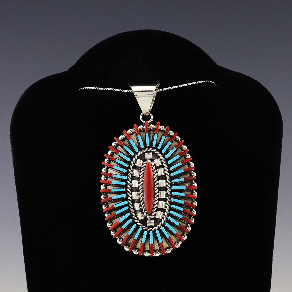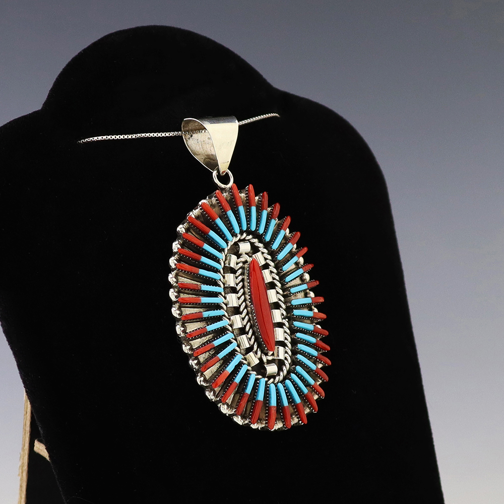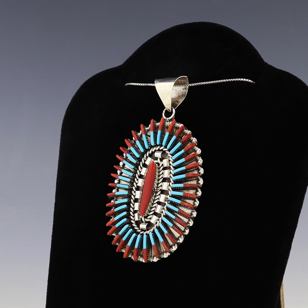 Zuni artist Barton Cooeyate hand crafted this stunning needle point pendant. Each stone is hand cut, polished, and set into a sterling silver setting. The pendant is set with Turquoise and Coral. (Chain not included) Weighs 10 grams. Signed