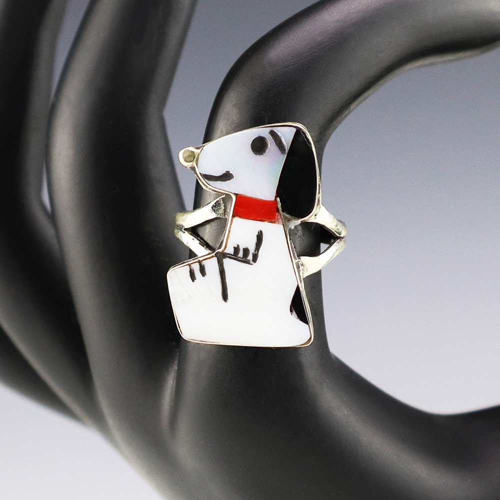 Zuni artist Shenel Poblano made this fabulous Snoopy ring. Zuni artists are known for their fine lapidary skills. Each stone is hand cut, polished, and set into a sterling silver setting. The ring is inlaid with Coral, Mother of Pearl Shell, and Jet. Weighs 4 grams. Size 7. Signed