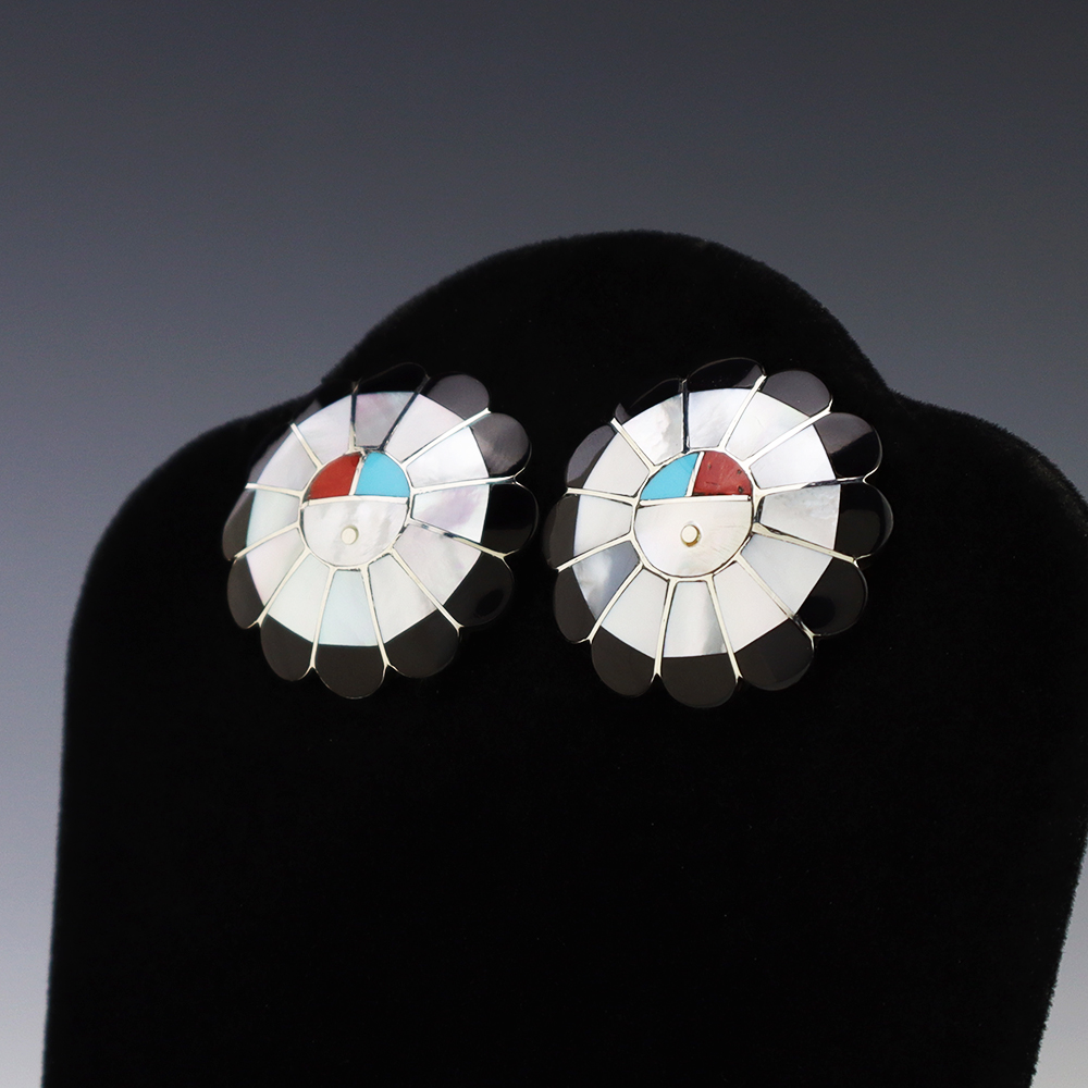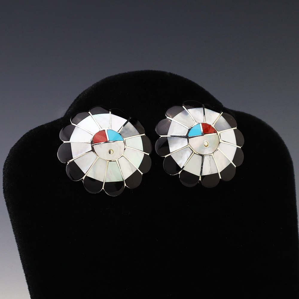 Zuni artists Denise and Fred Suitza created these lovely Sunface earrings. Made out of sterling silver and inlaid with Turquoise, Coral, Jet, and Mother of Pearl Shell. Weighs 14 grams. Signed