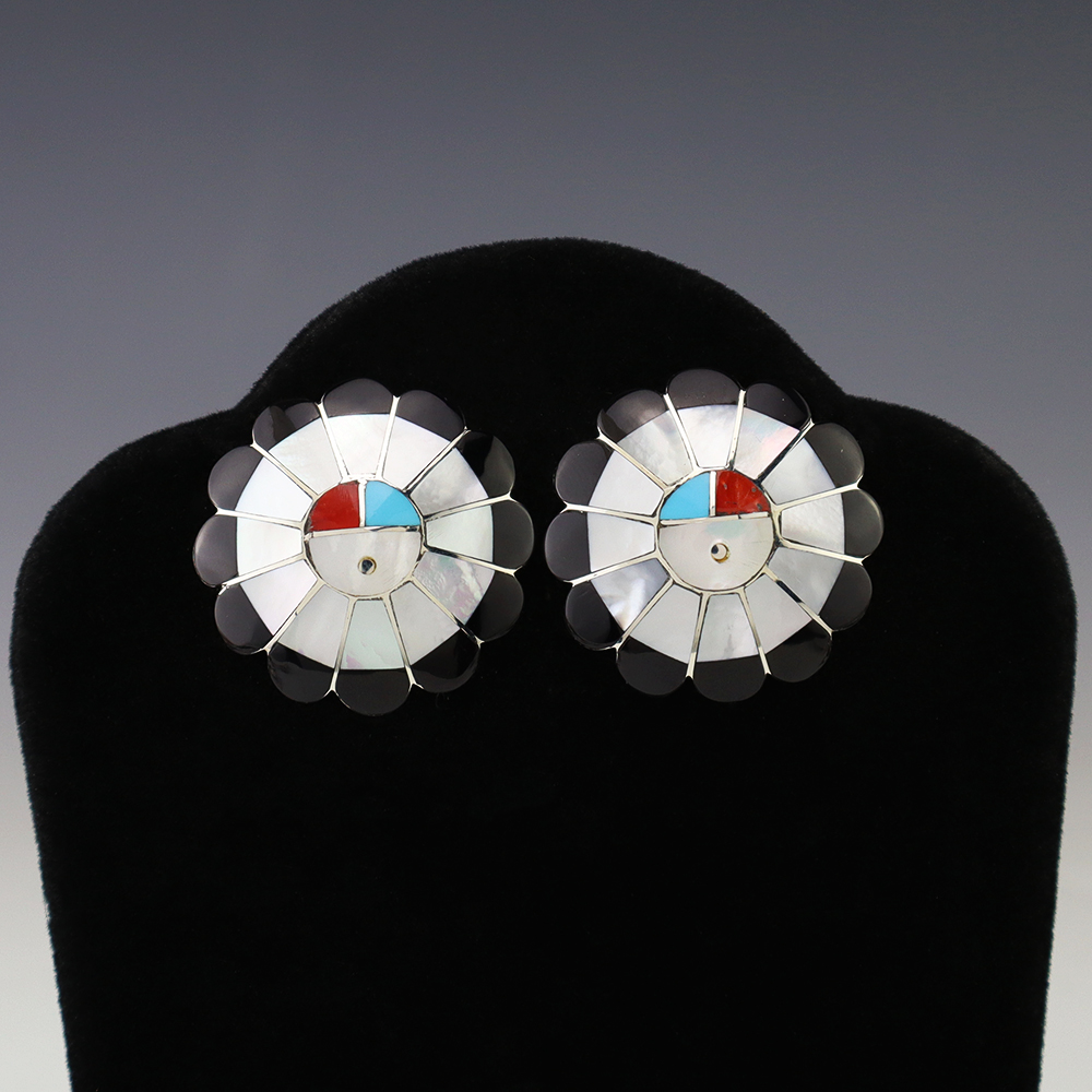 Zuni artists Denise and Fred Suitza created these lovely Sunface earrings. Made out of sterling silver and inlaid with Turquoise, Coral, Jet, and Mother of Pearl Shell. Weighs 14 grams. Signed