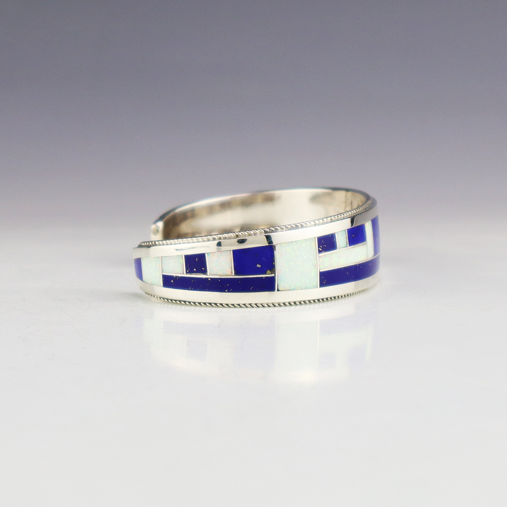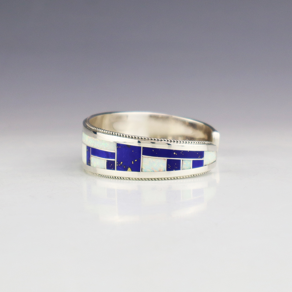 Zuni jewelry makers, Nancy and Sheldon Westika created this magnificent ring. Made out of sterling silver and inlaid with natural Lapis. Zuni artists are known for their lapidary work. The Westikas have been making jewelry since the 1970’s and they are known for their fine inlay work. Signed. Weighs 4...
