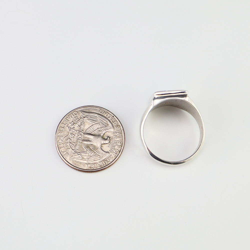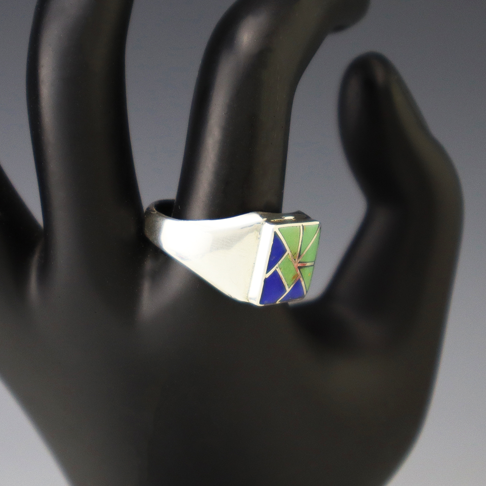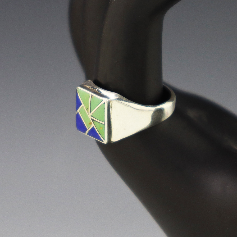 Amazing inlay work! Zuni jewelry makers, Nancy and Sheldon Westika created this magnificent ring. Made out of sterling silver and inlaid with Kingman Turquoise and Jet. Zuni artists are known for their lapidary work. The Westikas have been making jewelry since the 1970’s and they are known for their fine...
