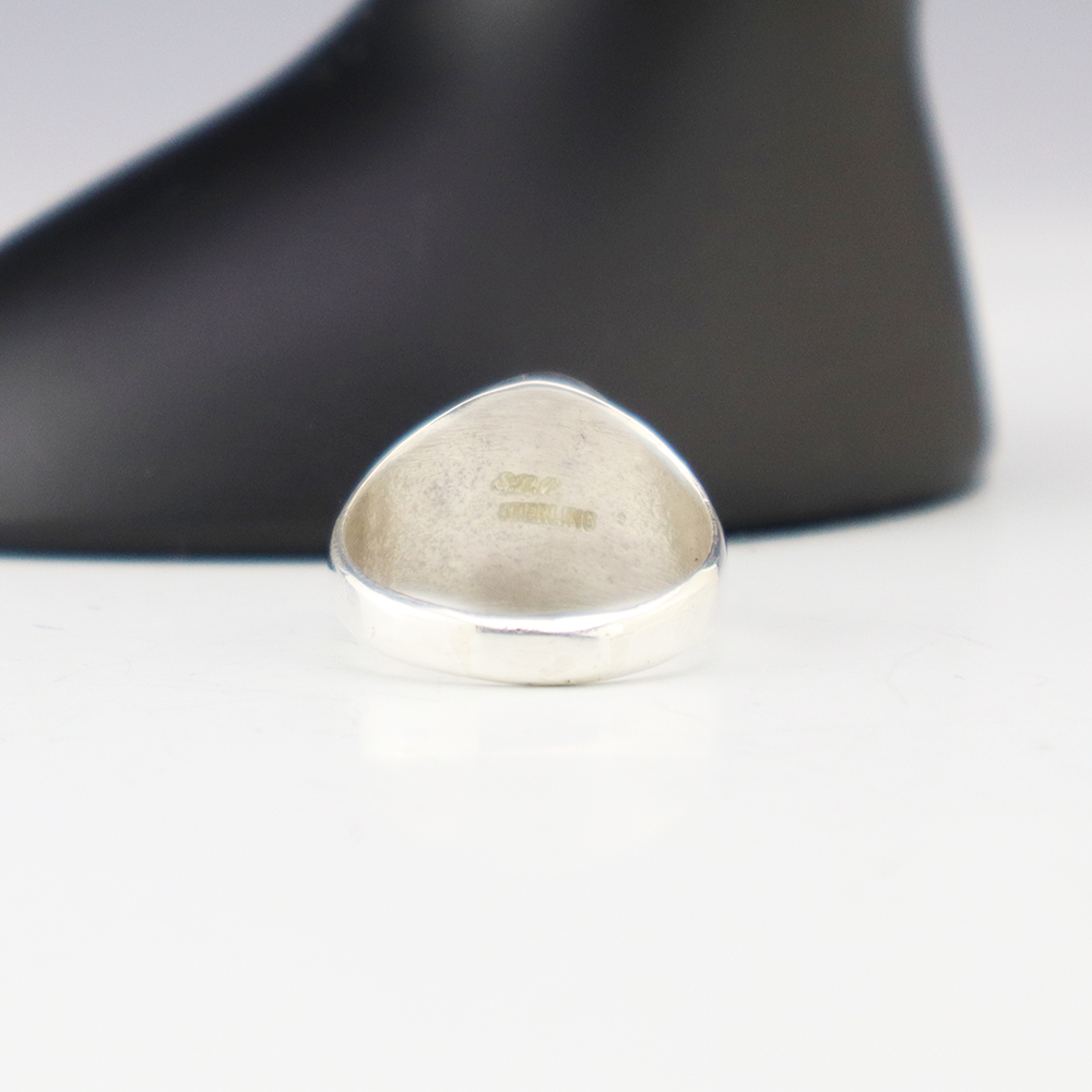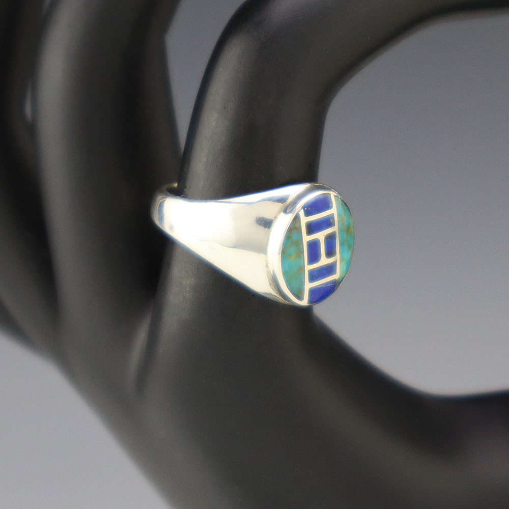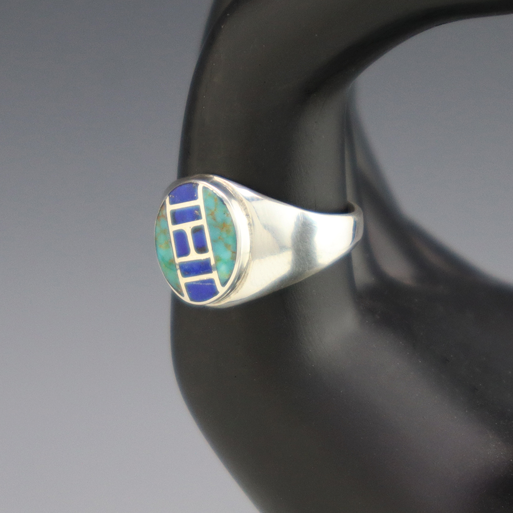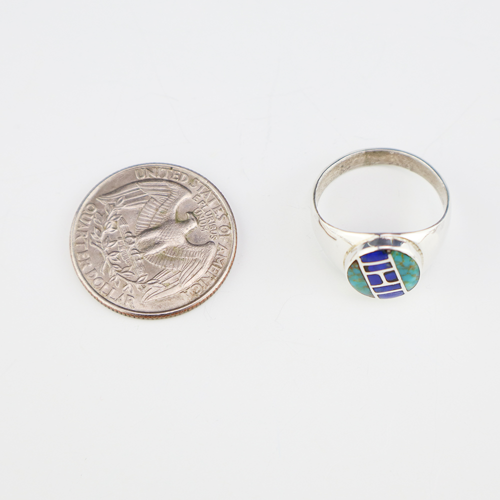 Amazing inlay work! Zuni jewelry makers, Nancy and Sheldon Westika created this magnificent ring. Made out of sterling silver and inlaid with Kingman Turquoise and Jet. Zuni artists are known for their lapidary work. The Westikas have been making jewelry since the 1970’s and they are known for their fine...