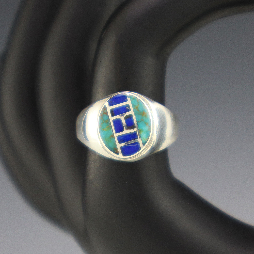 Amazing inlay work! Zuni jewelry makers, Nancy and Sheldon Westika created this magnificent ring. Made out of sterling silver and inlaid with Kingman Turquoise and Jet. Zuni artists are known for their lapidary work. The Westikas have been making jewelry since the 1970’s and they are known for their fine...