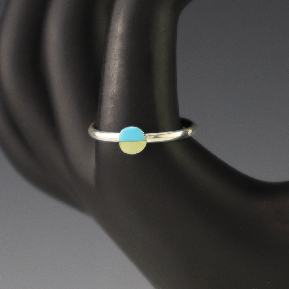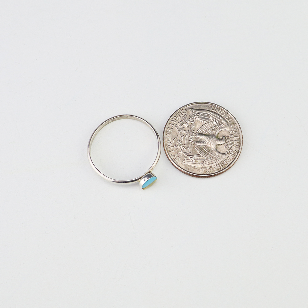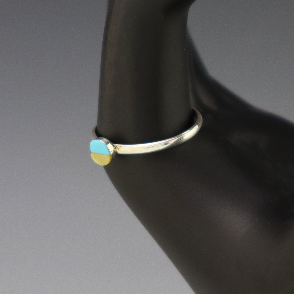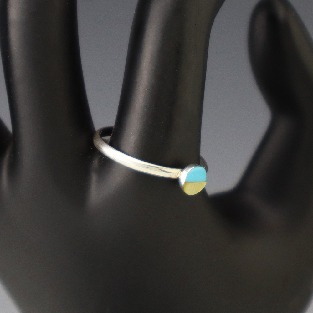 Zuni artists are known for their fine lapidary skills. Each stone is hand cut, polished, and set into a sterling silver setting. The ring is set with Turquoise and Mother of Pearl Shell stones. Hand made by Zuni artist Gloria Angie Rosetta. Weighs 2 grams. Size 10 1/2.