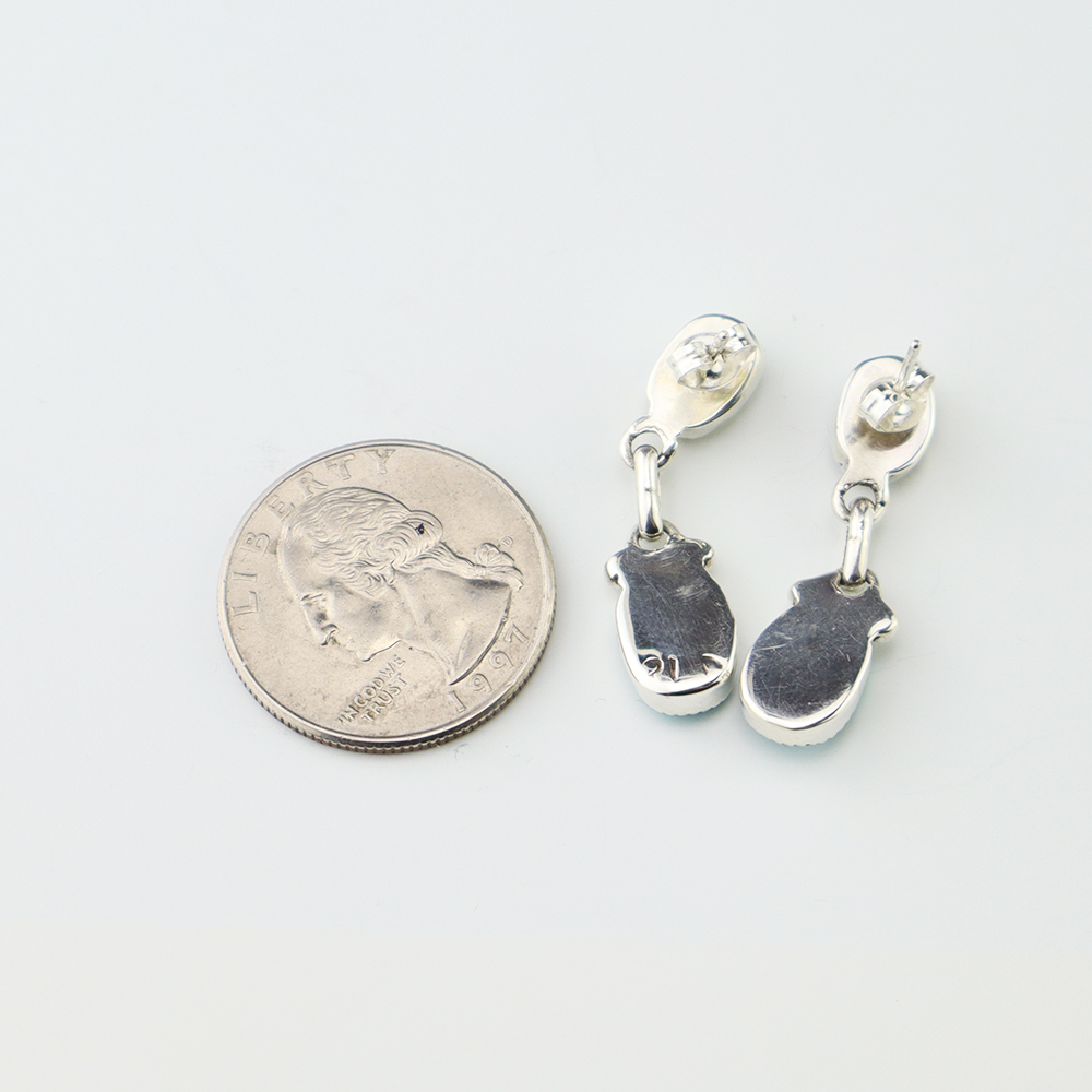 Zuni artist, Diane Lonjose made these beautiful earrings. Made out of sterling silver and set with natural Kingman Turquoise and Mother of Pearl Shell. The components are all hand fabricated, and the stones are all natural. Diane comes from a family of Zuni jewelers. She is the daughter of Alice and Duane Quam, and grandchild of Doris and Warren Ondelacy. Weighs 4 grams. Signed