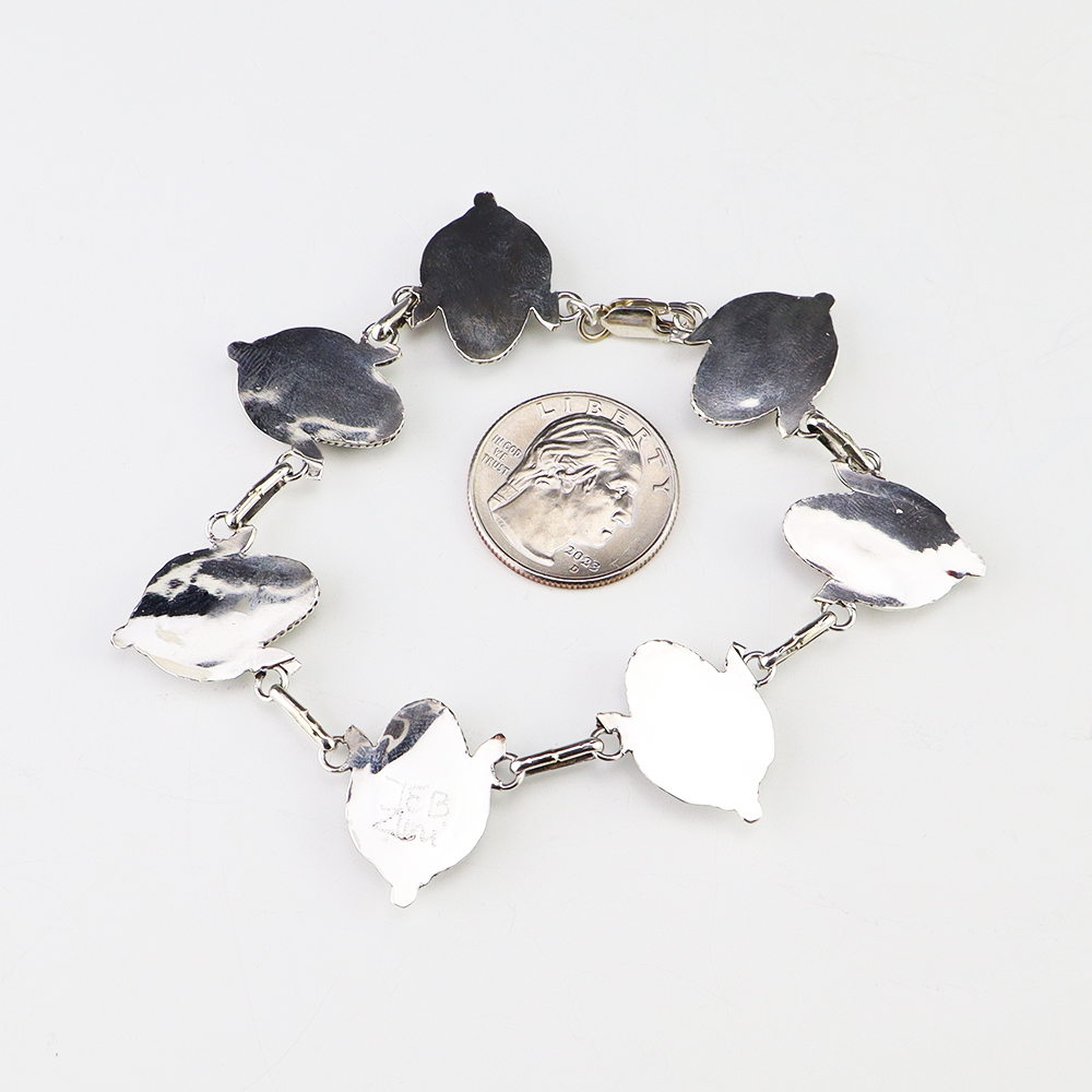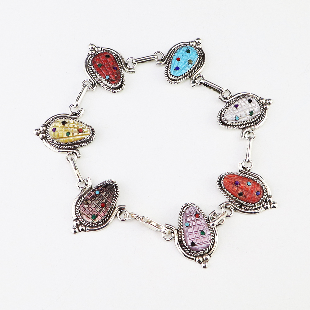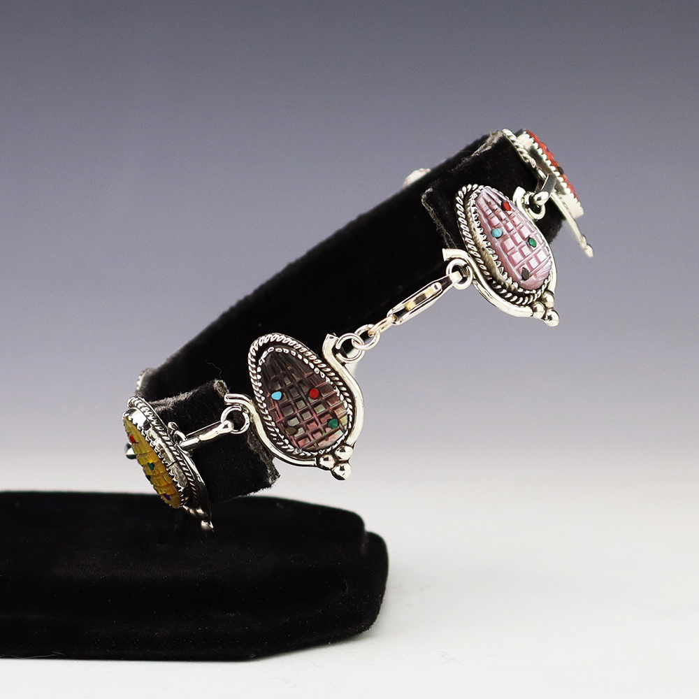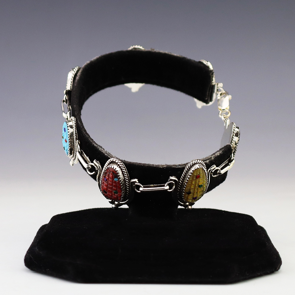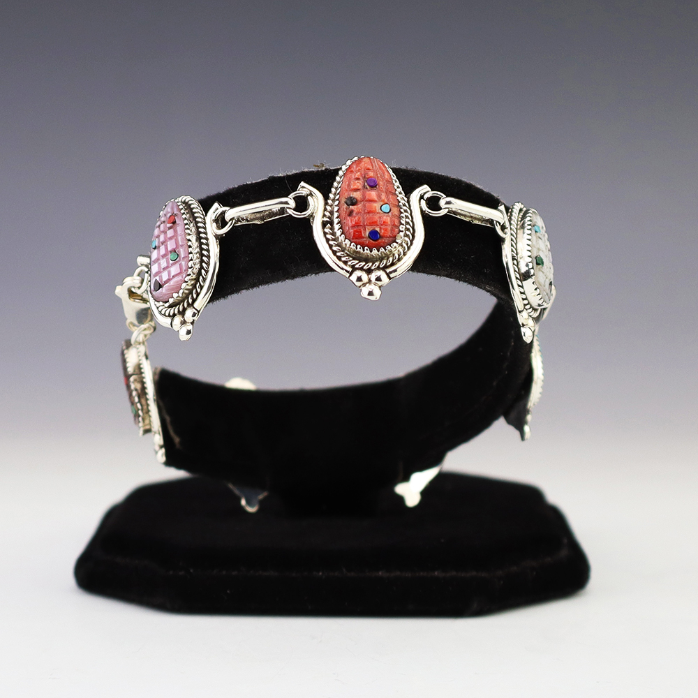Zuni artist Tracy Bowekaty made this lovely link bracelet. The bracelet is sterling silver and is set with Turquoise, Mother of Pearl Shell, Spiny Oyster, Coral, Malachite, Jet, and Lapis stones. Weighs 22 grams. Signed.