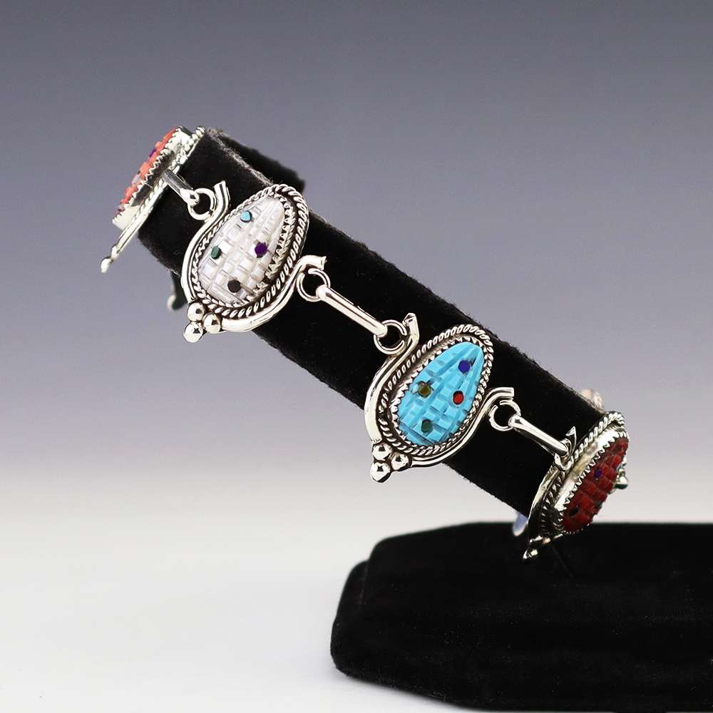 Zuni artist Tracy Bowekaty made this lovely link bracelet. The bracelet is sterling silver and is set with Turquoise, Mother of Pearl Shell, Spiny Oyster, Coral, Malachite, Jet, and Lapis stones. Weighs 22 grams. Signed.