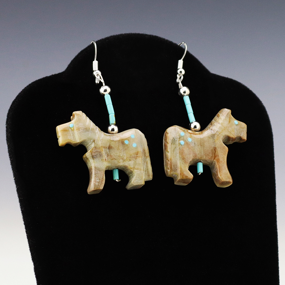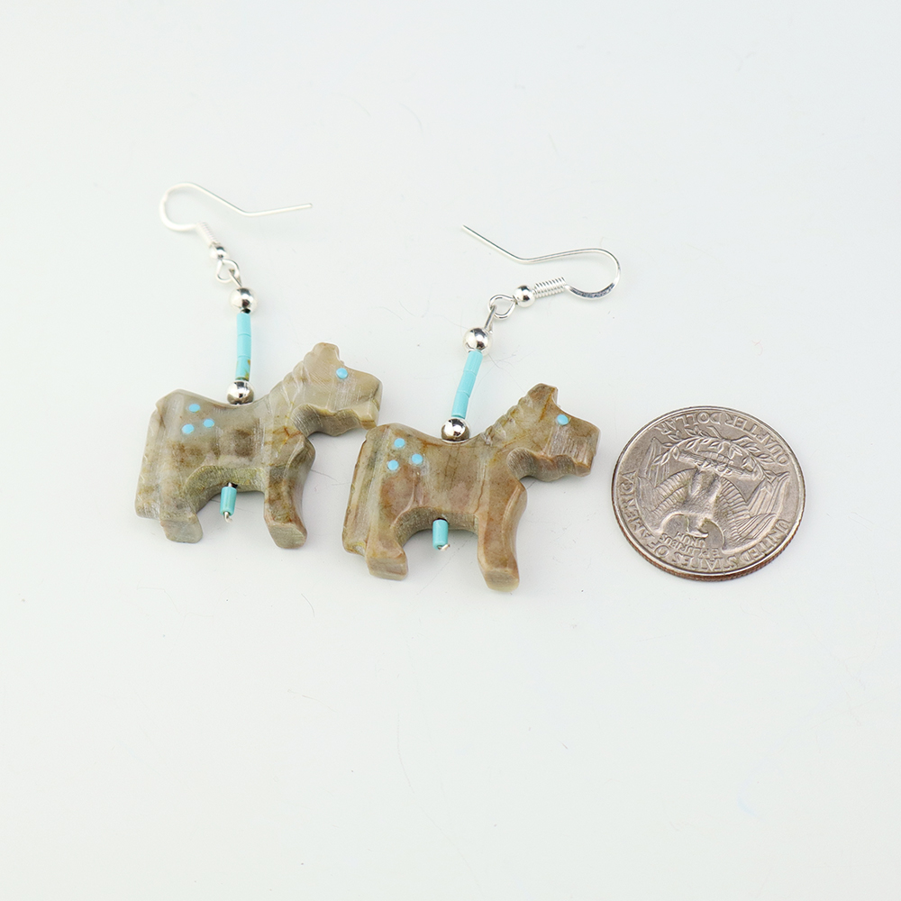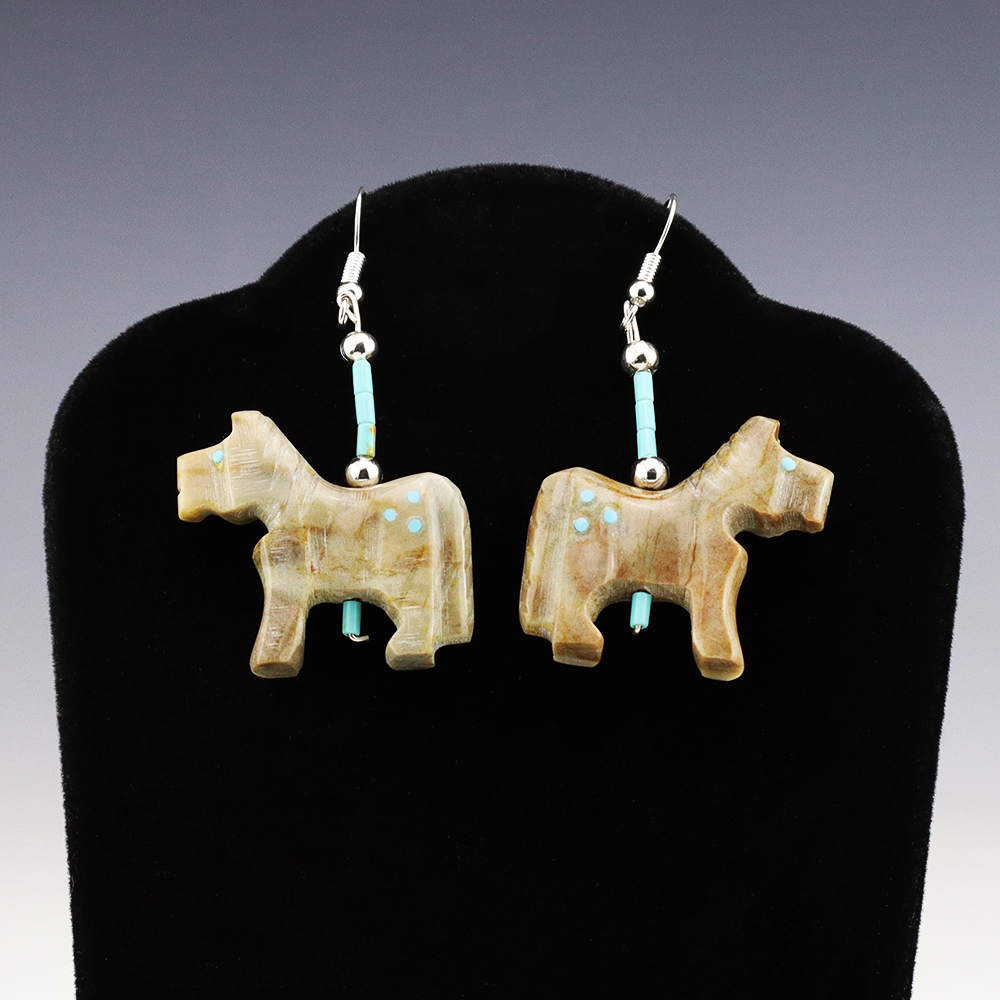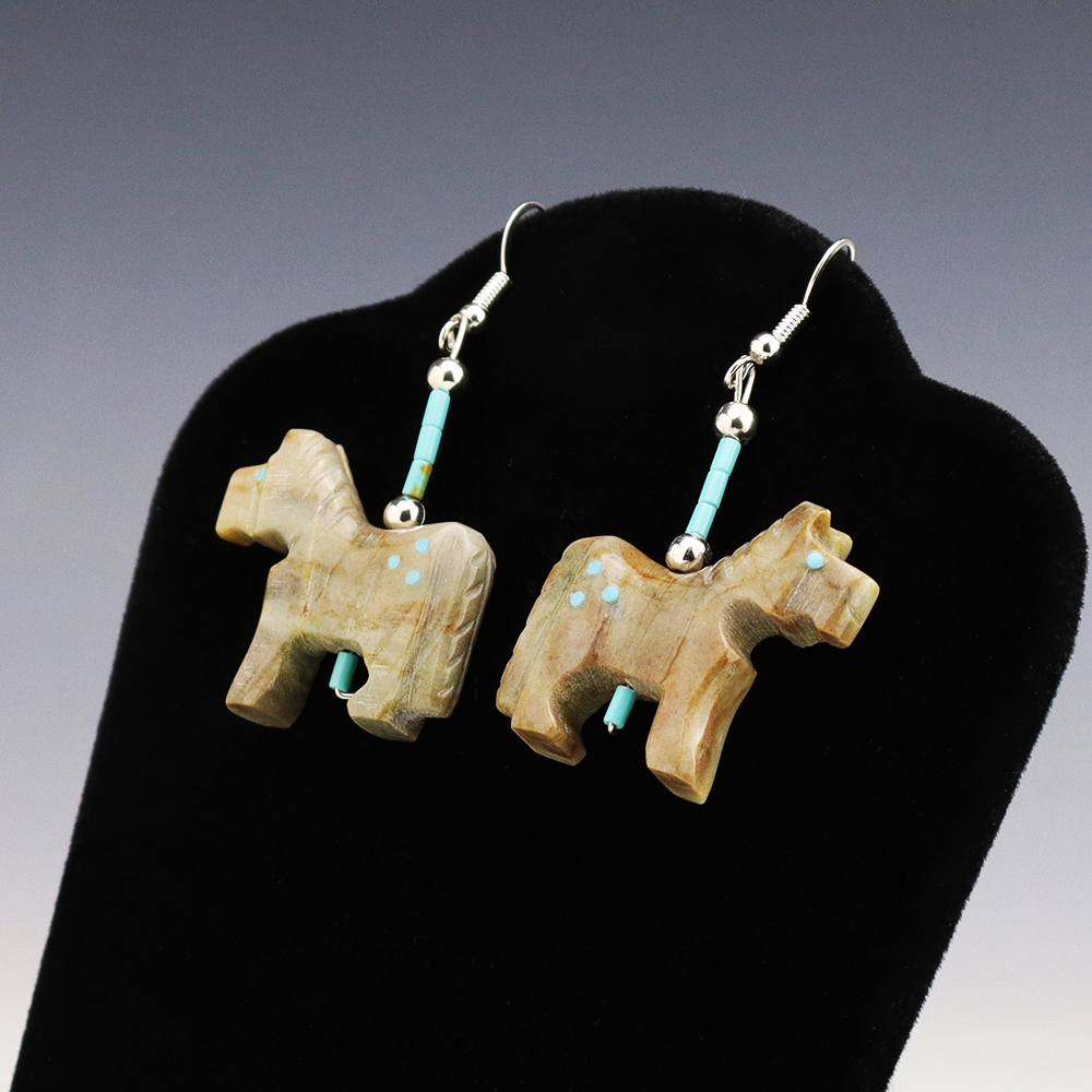 Wonderful horse fetish earrings made out of Turquoise and Picasso Marble. Hand made by Todd Etsate. These earrings will become a versatile accessory in your jewelry collection. Weighs 12 grams.
