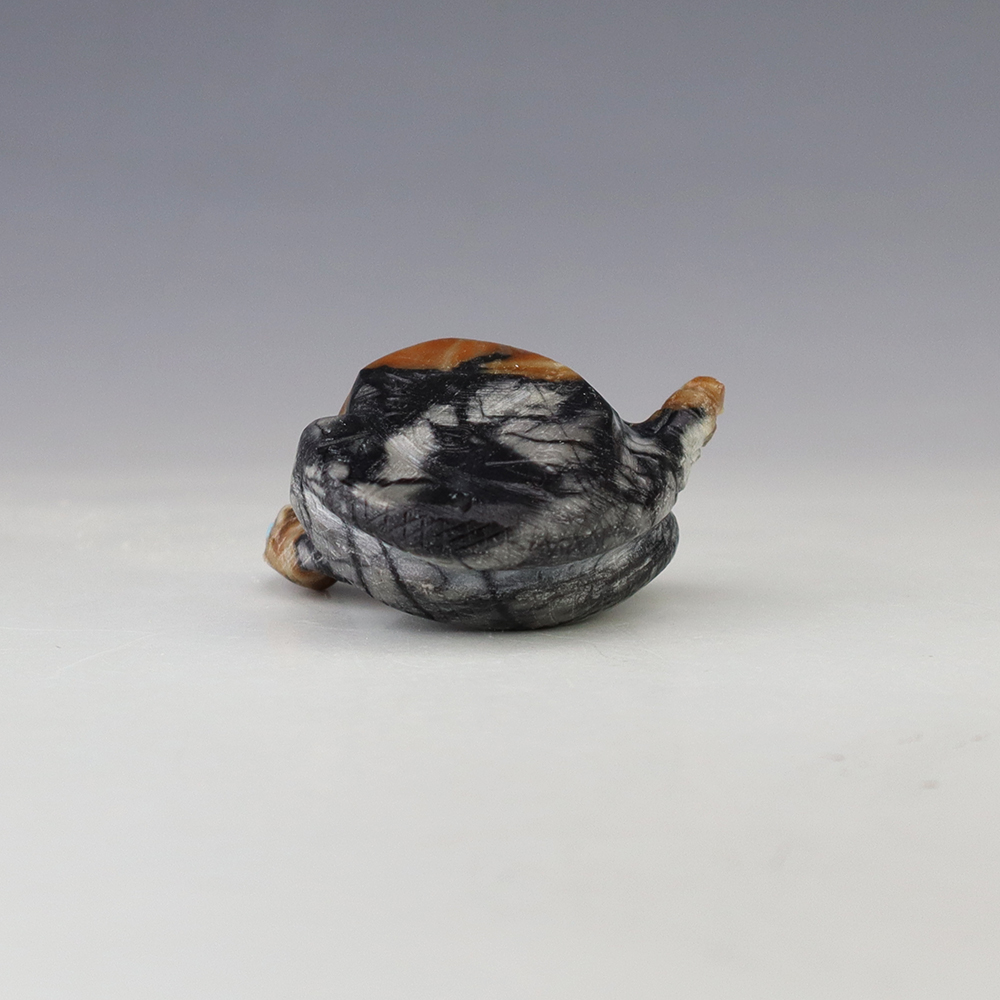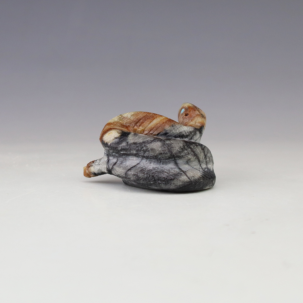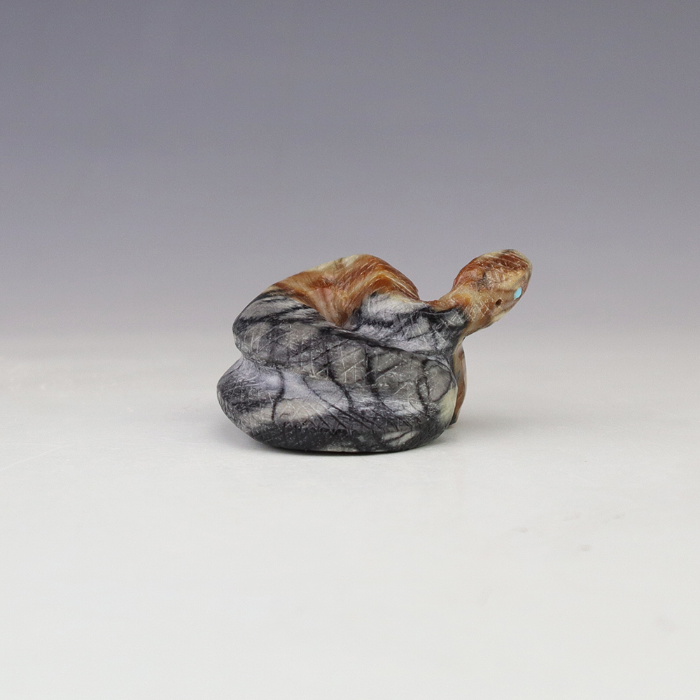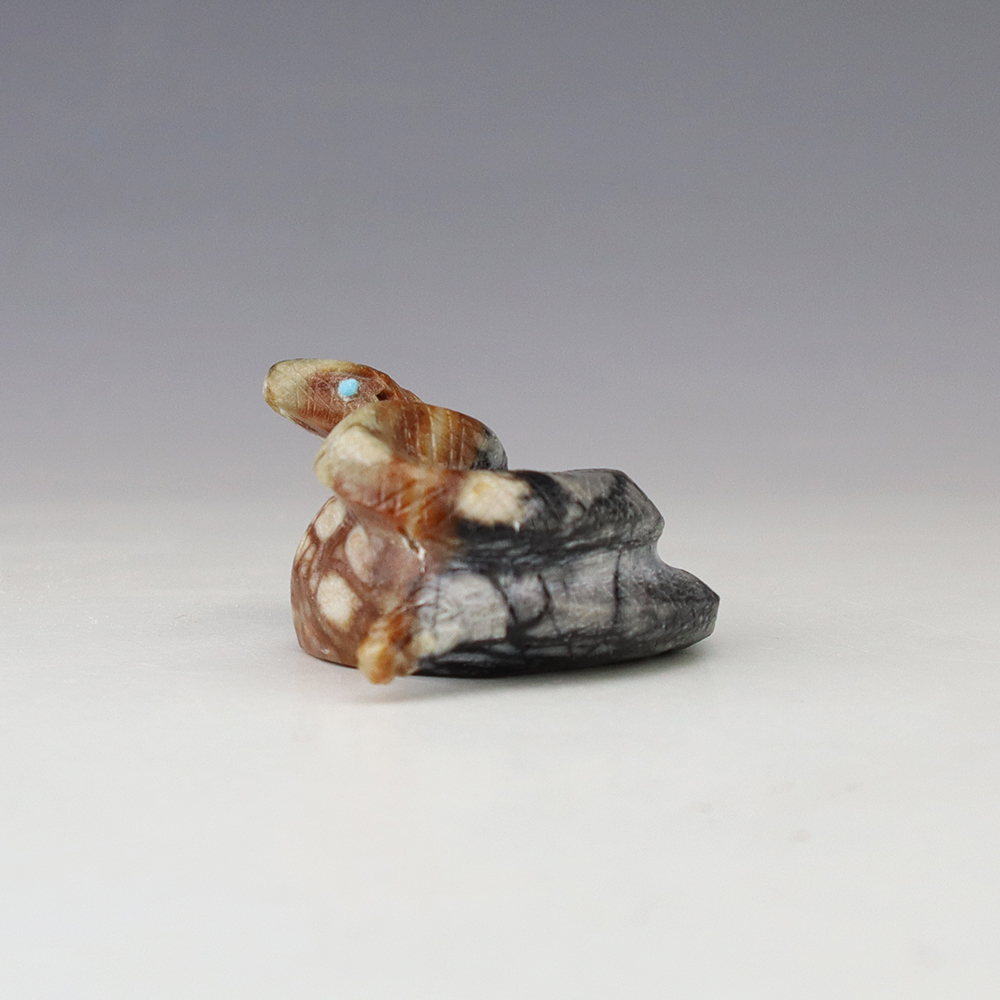 Zuni fetish artist Michael Coble made this wonderful Snake. Hand carved out of Picasso Marble with Turquoise eyes. The snake is very important in Zuni ceremonies. It represents primitive energy and helps us connect with greater powers. The snake also symbolizes life, death, and rebirth. Signed