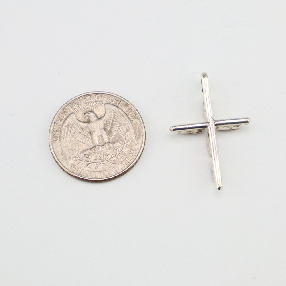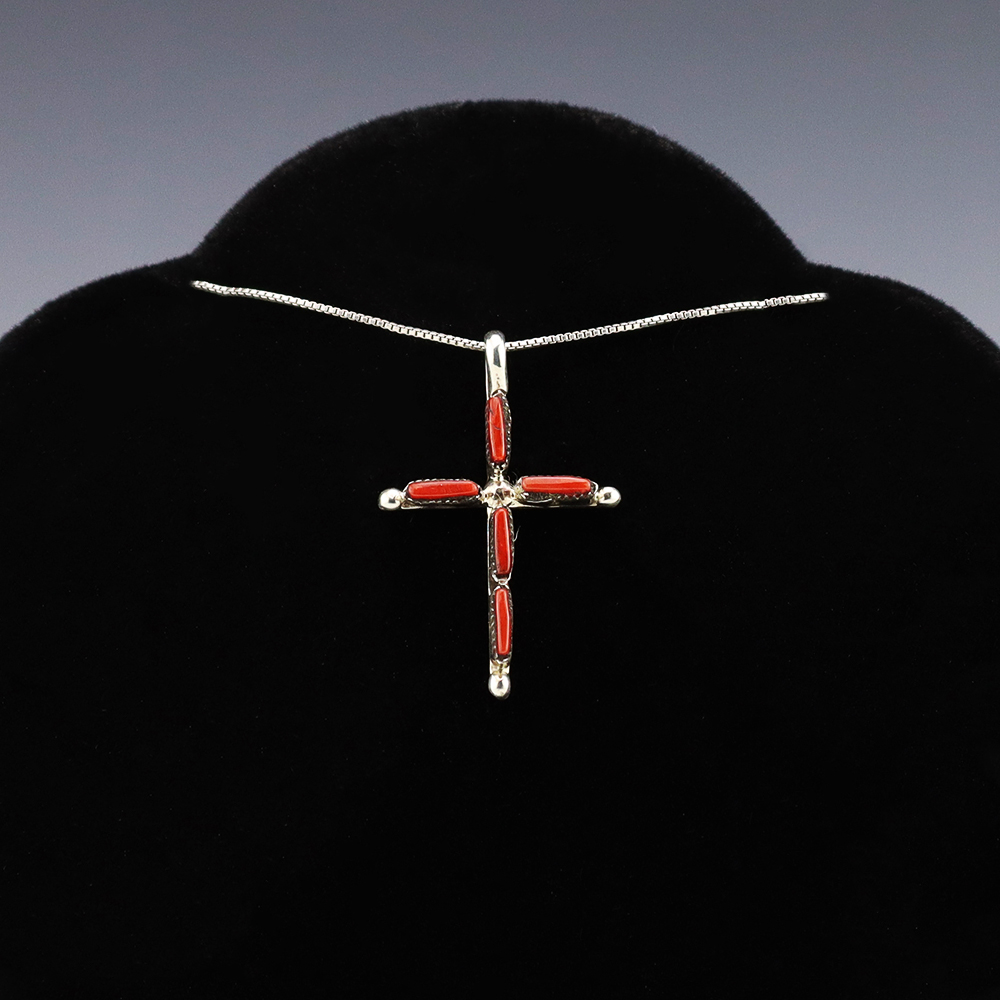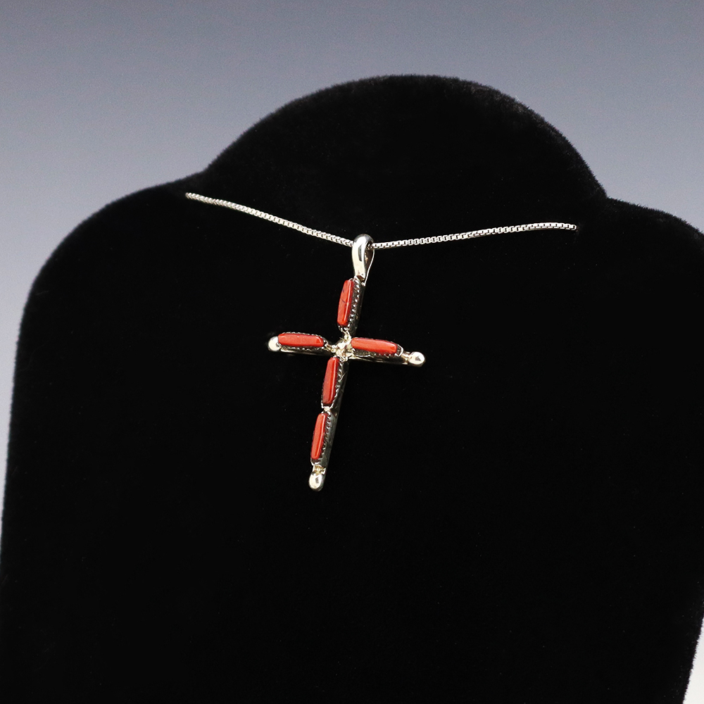 Lovely cross pendant made out of sterling silver and Coral by Zuni artist Jill Peywa. Zuni artists are known for their fine lapidary skills. Each stone is hand cut, polished, and set into a sterling silver setting. Weighs 2 grams. (Chain not included)