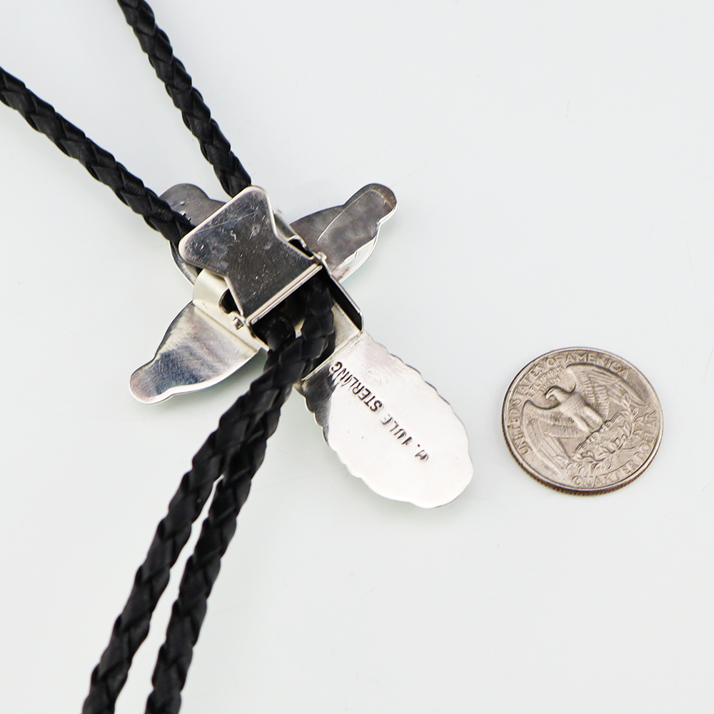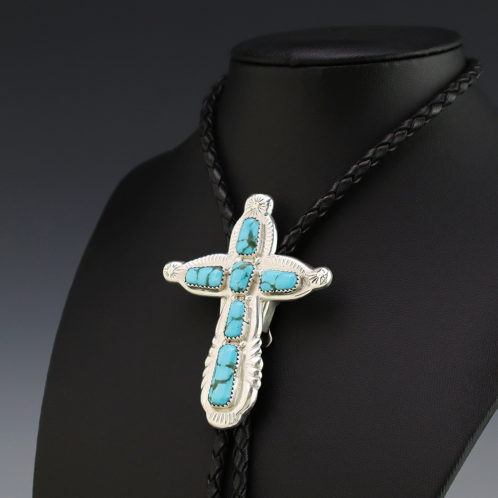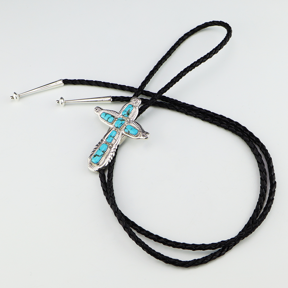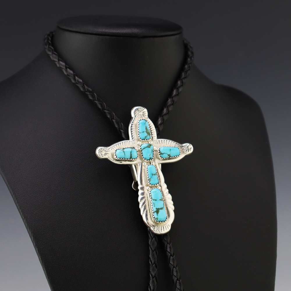 Zuni artist Wilbur Iule made this wonderful cross bolo tie. Sterling silver with Turquoise stones. This handsome bolo tie will look great on any shirt. Weighs 40 grams. Signed