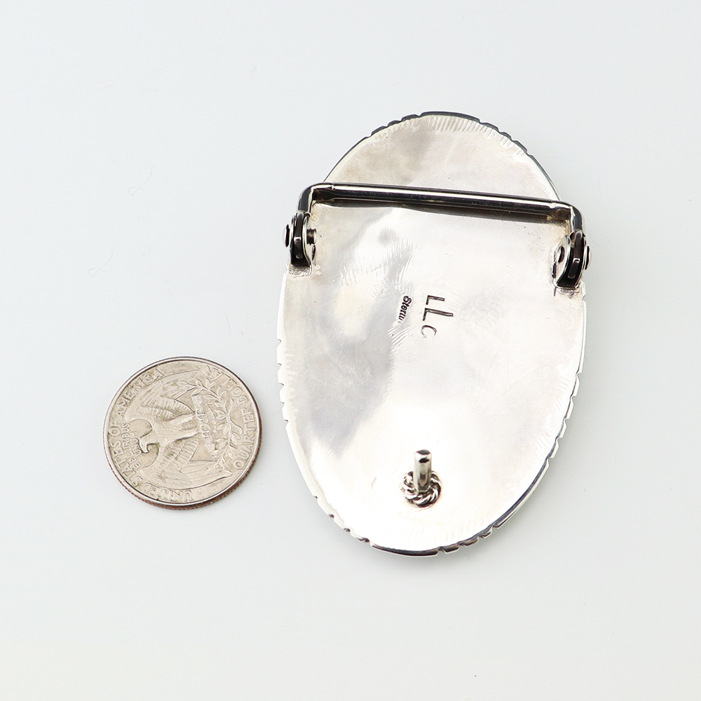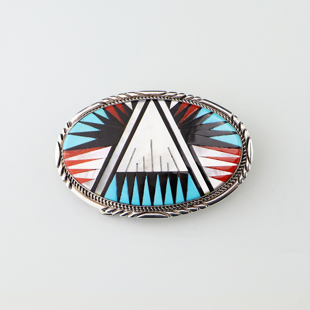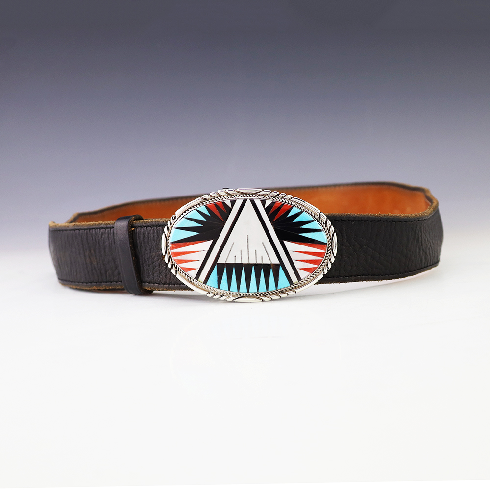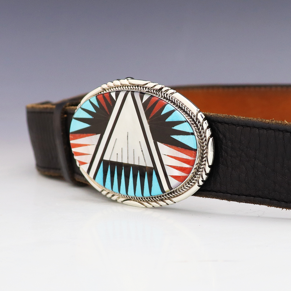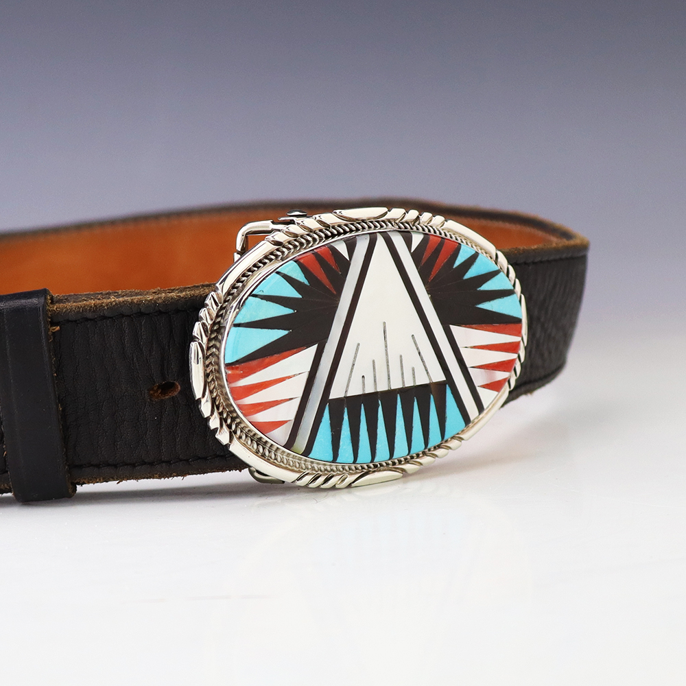 Exquisite buckle that features Turquoise, Coral, Jet, and Mother of Pearl Shell inlaid in a sterling silver setting. Hand made by Leslie and Gladys Lamy from the Zuni Pueblo. Outstanding design. High quality craftsmanship that is a great representation of the traditional Zuni inlay work. Weighs 46 grams. Fits a 1 1/2” belt. (Belt not included) Signed