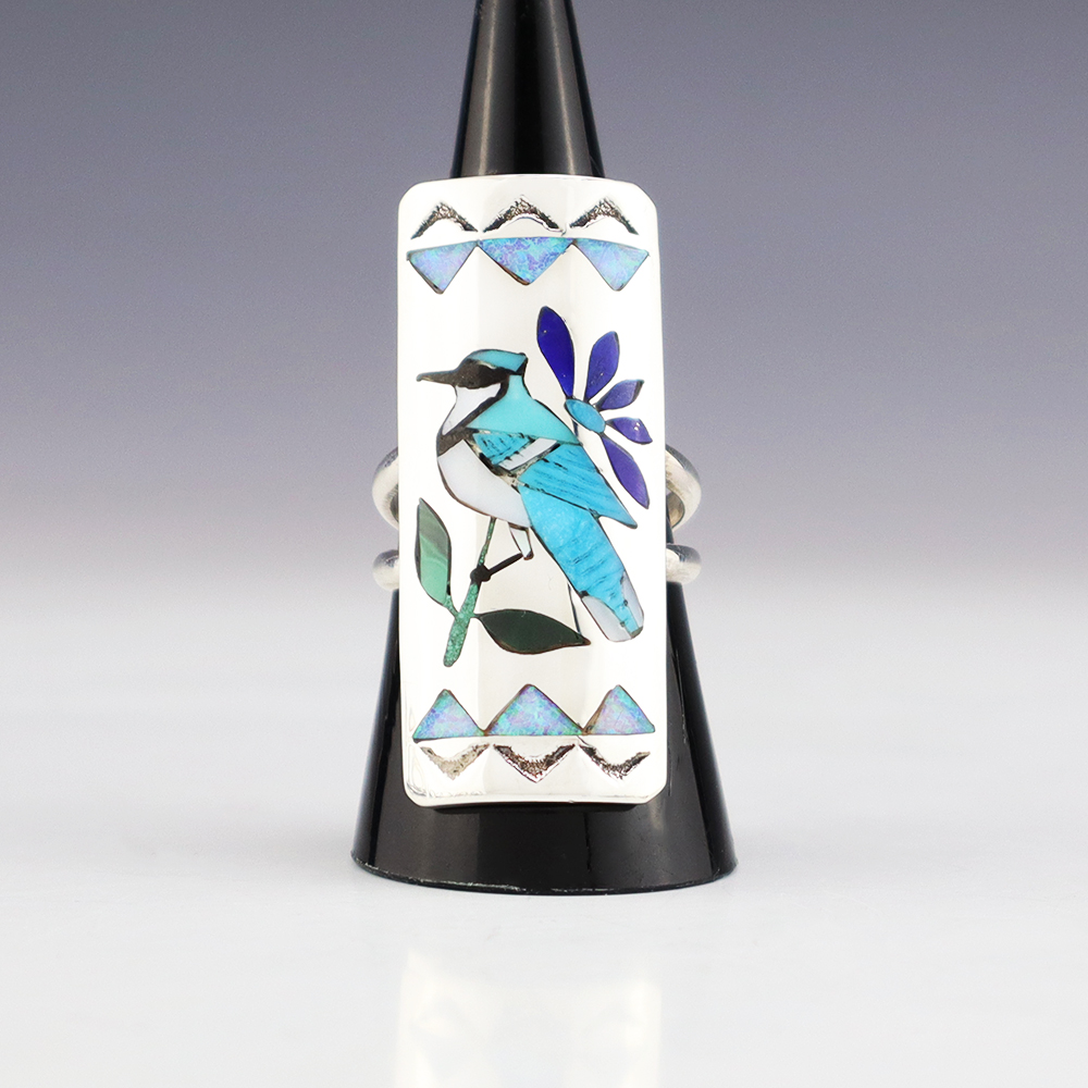 Zuni artist Quintin Quam made this beautiful Blue Jay ring. Zuni artists are known for their fine lapidary skills. Each stone is hand cut, polished, and set into a sterling silver setting. The ring is inlaid with Turquoise, Lapis, Malachite, Mother of Pearl Shell, Laboratory Opal, and Jet. Weighs 10 grams. Size 7 1/2. Signed