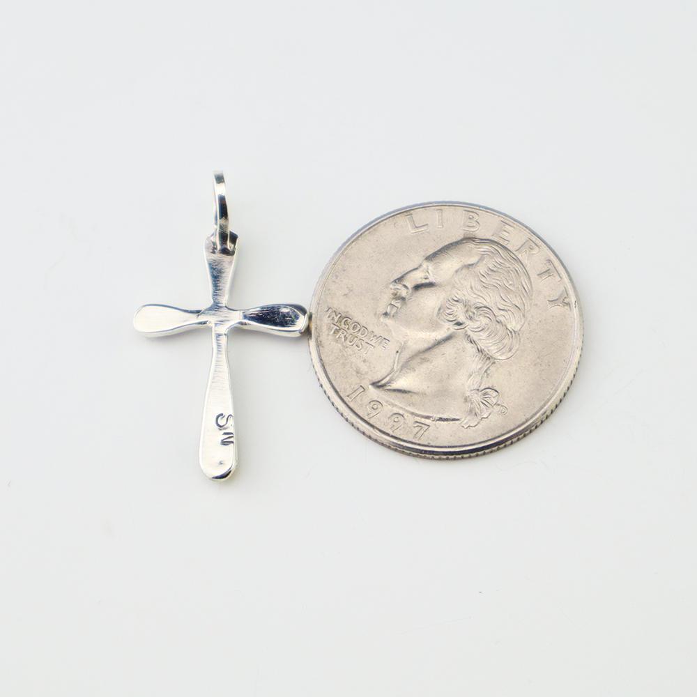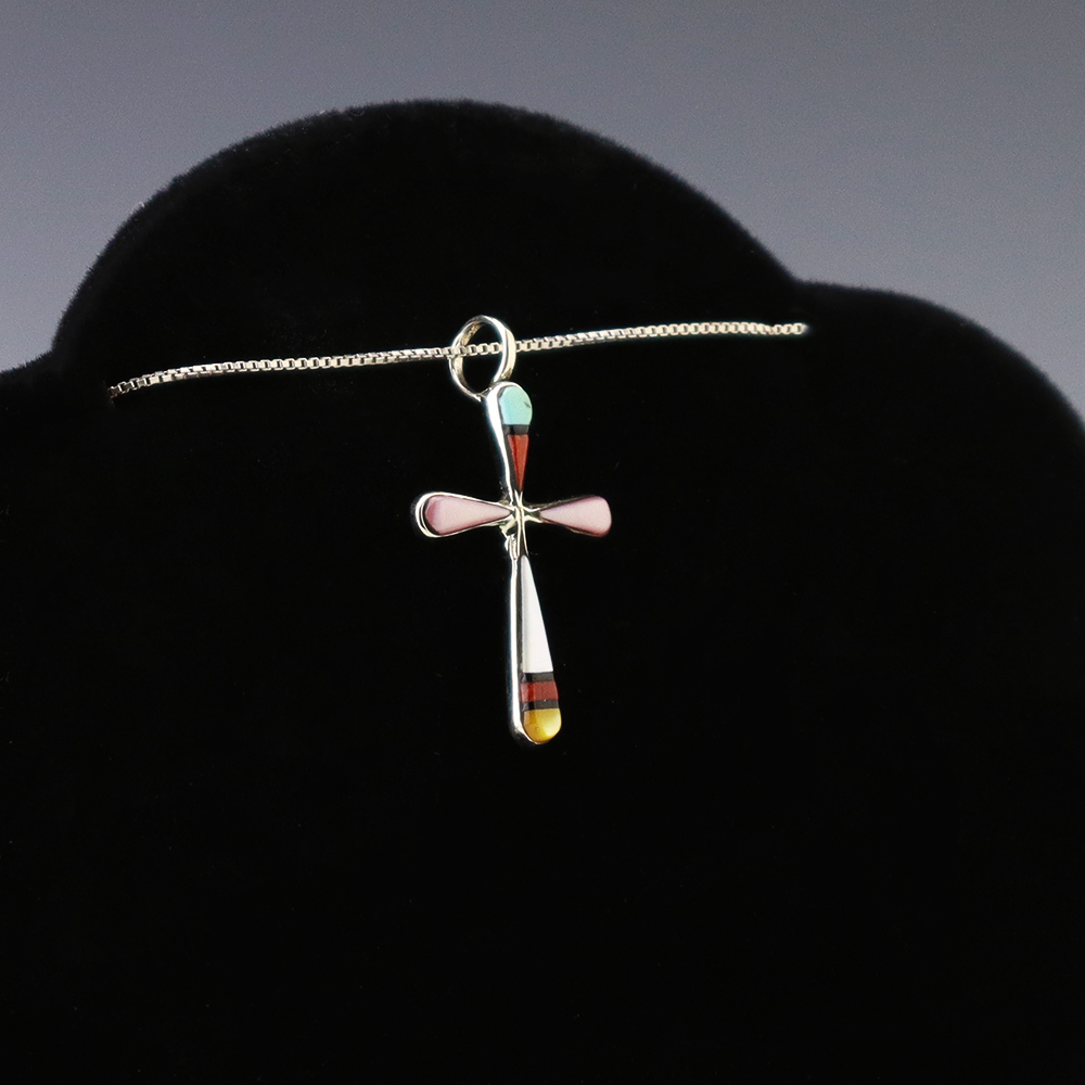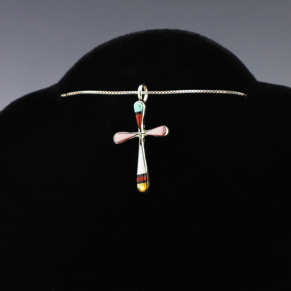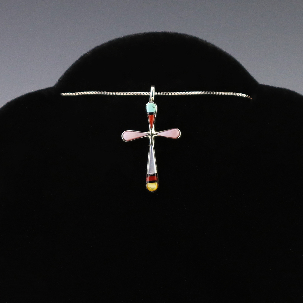 Zuni artists are known for their fine lapidary skills. This cross pendant is no exception. Zuni artist Sylvester Noche made this pendant out of sterling silver and inlaid it with Turquoise, Pink Mussel, Mother of Pearl Shell, Jet, and Coral. Weighs 2 grams. (Chain not included) Signed.