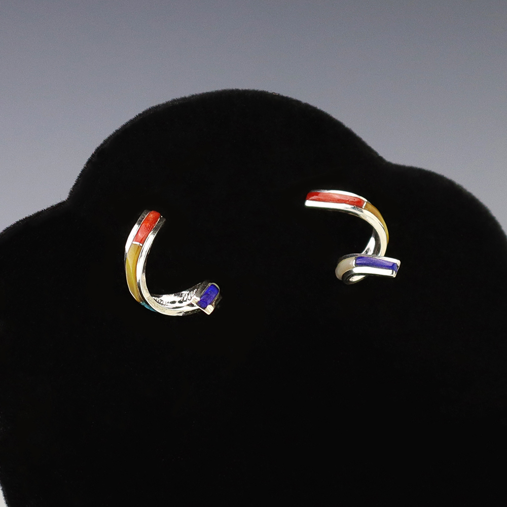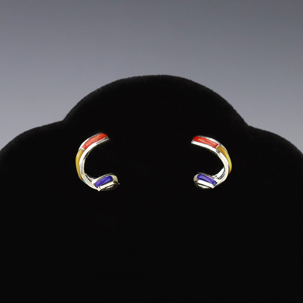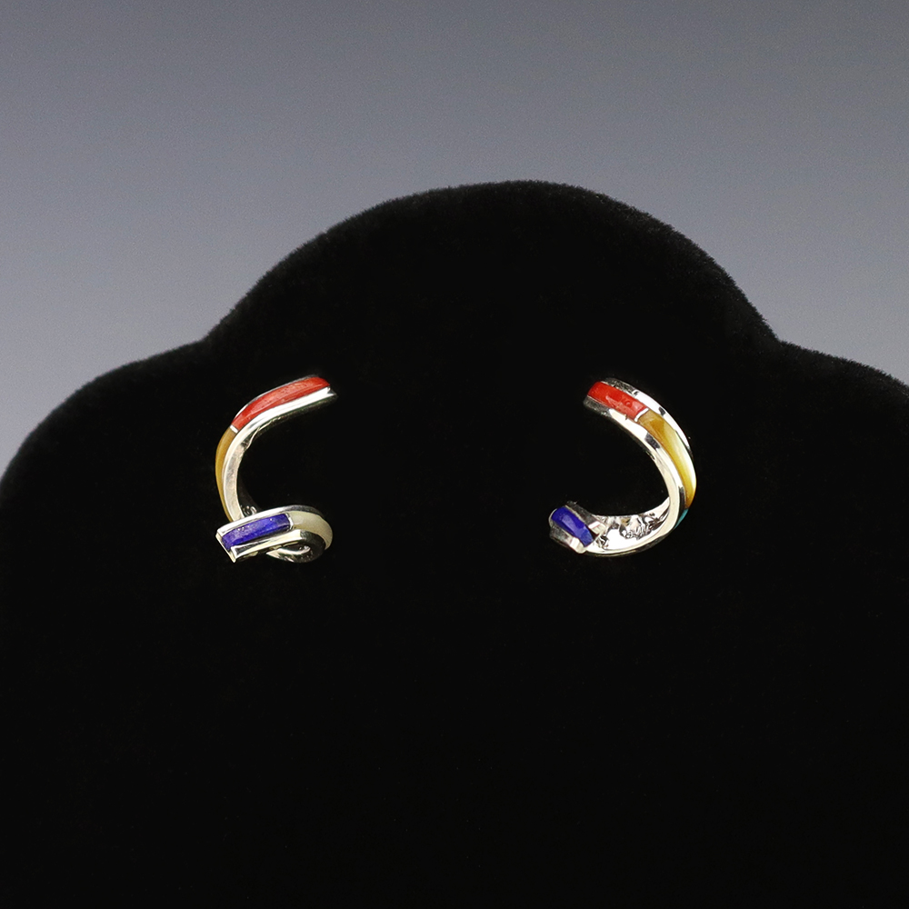 Each earring features Turquoise, Lapis, Mother of Pearl Shell, and Coral stones inlaid into a sterling silver setting. Hand made by Zuni jeweler Dentin Bobelu. These gorgeous earrings will become a versatile accessory in your jewelry collection. Weighs 4 grams. Signed