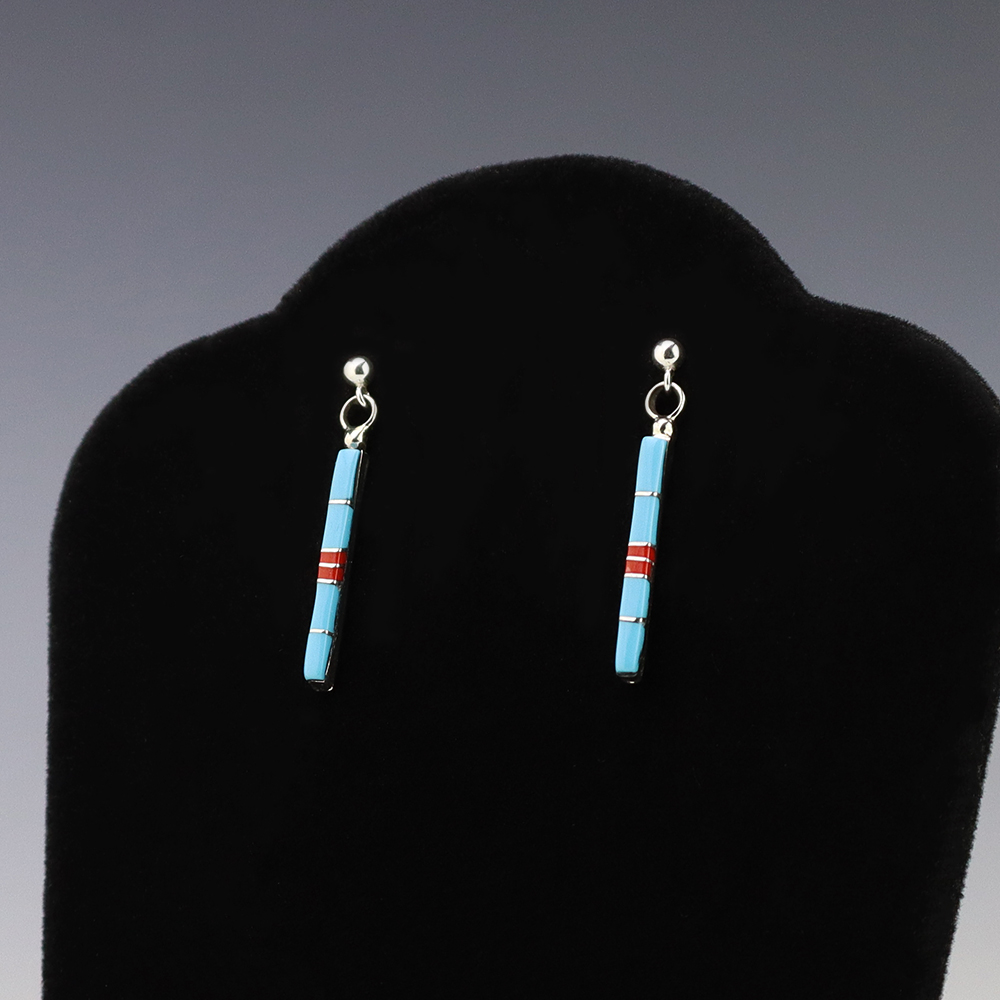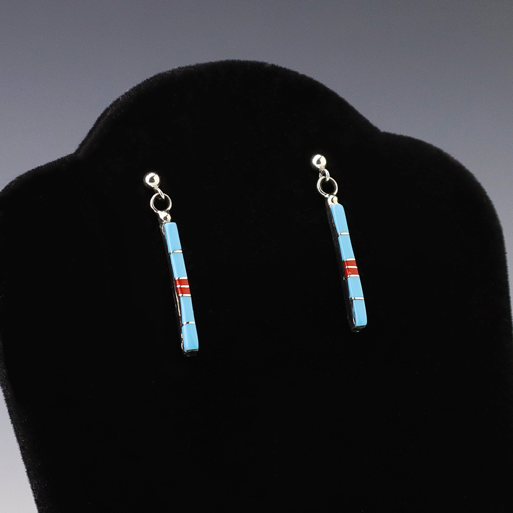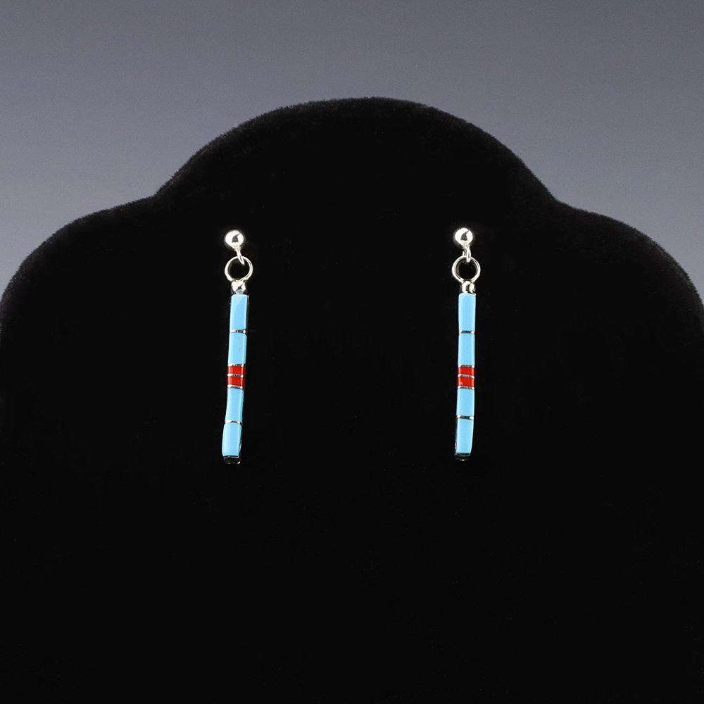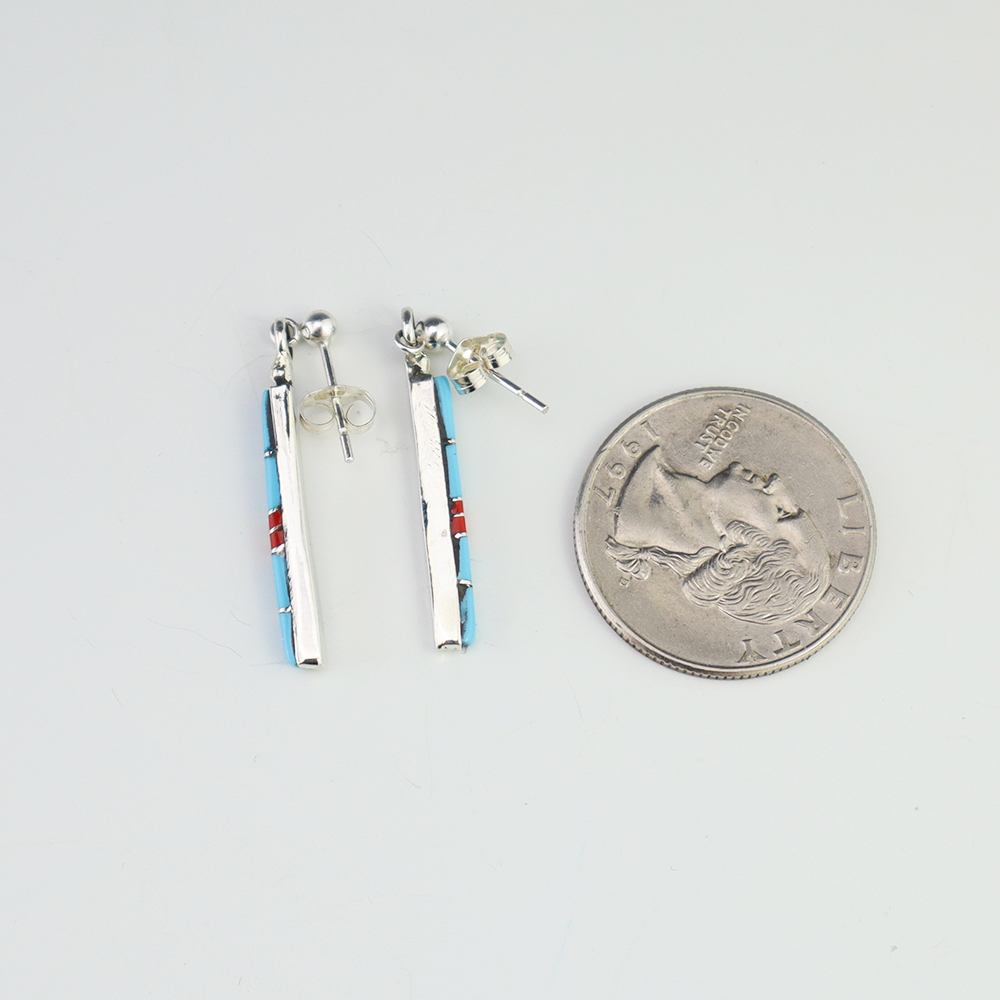 Zuni artist Roland Natachu made these beautiful earrings. Made out of sterling silver and inlaid with Turquoise and Coral. Weighs 2 grams.