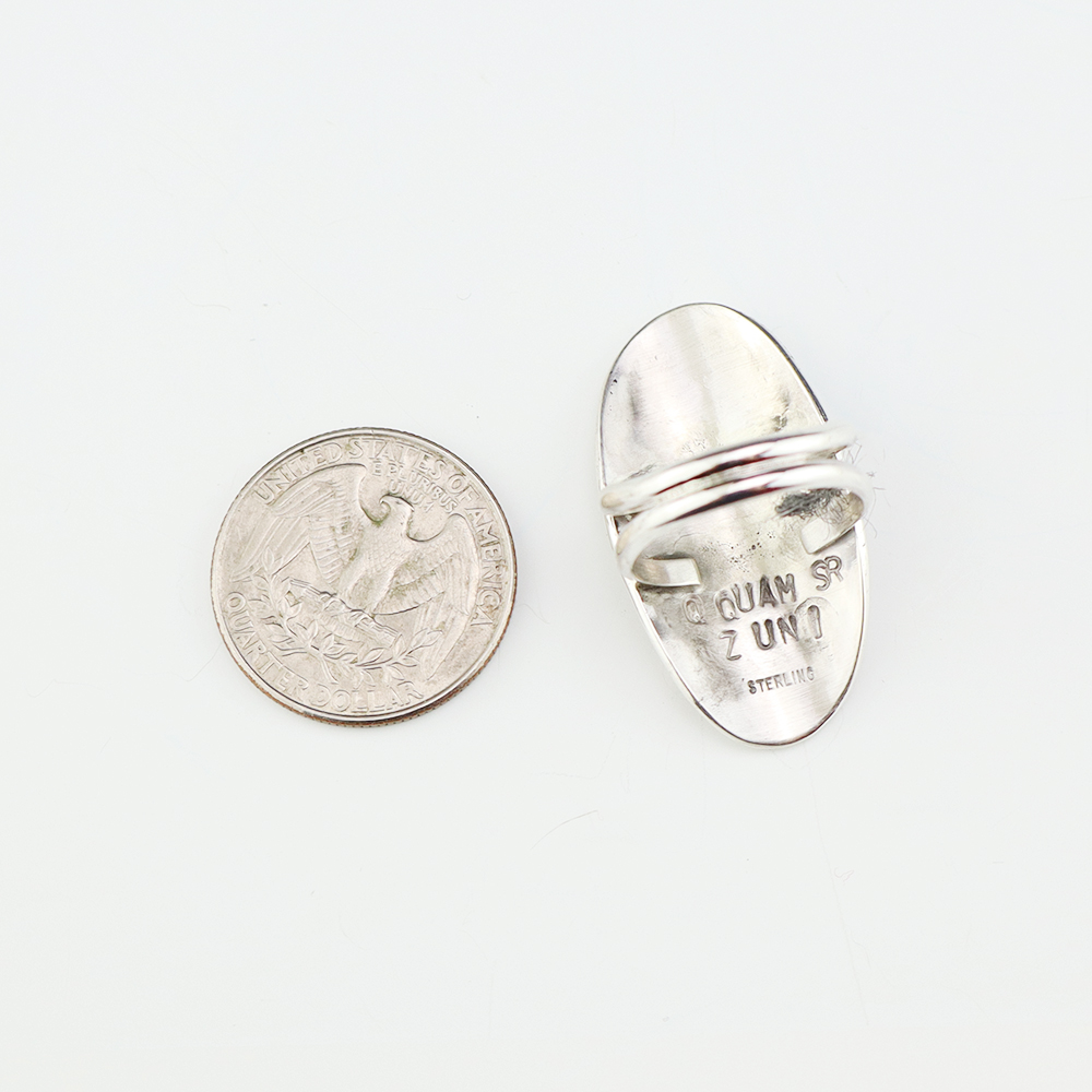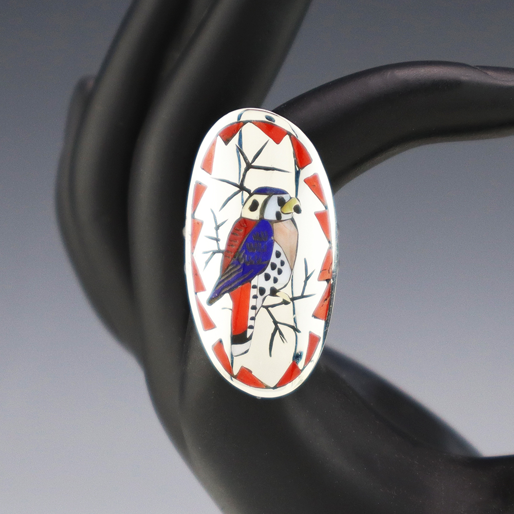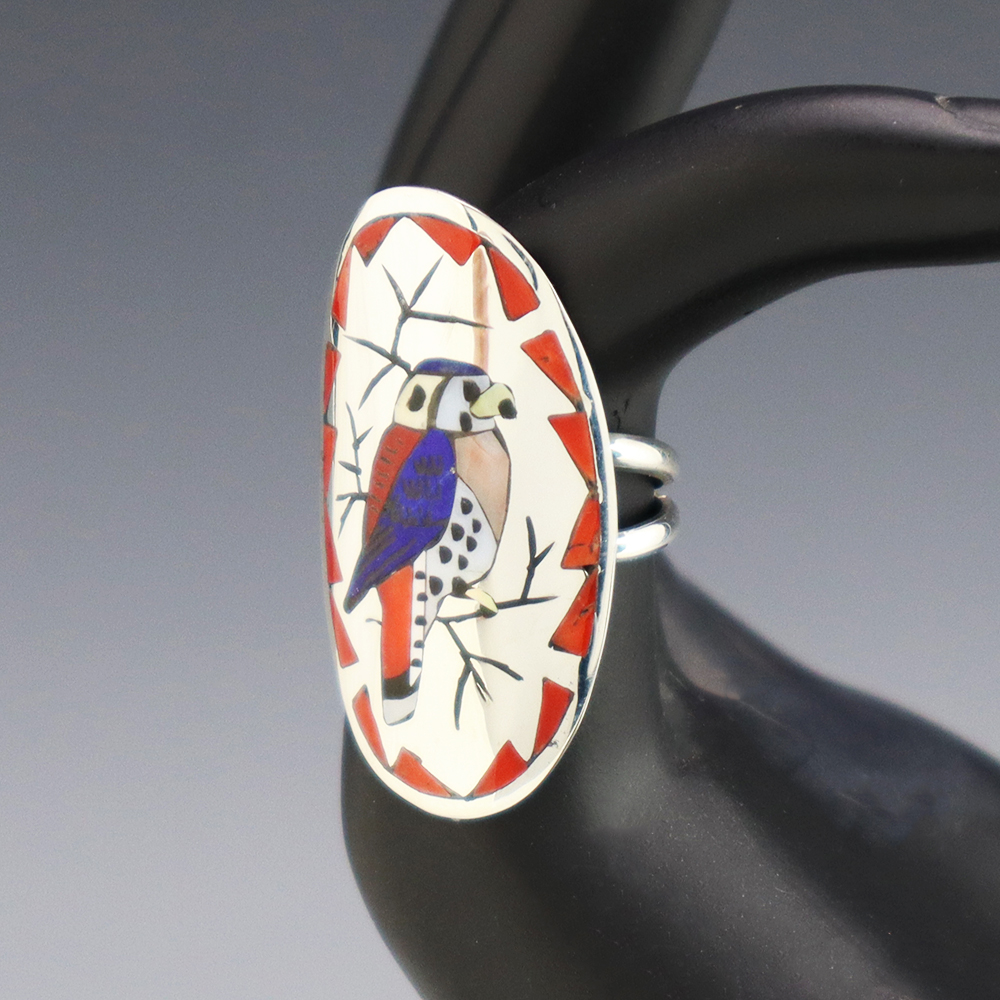 Zuni artist Quintin Quam made this outstanding Kestrel ring. Zuni artists are known for their fine lapidary skills. Each stone is hand cut, polished, and set into a sterling silver setting. The ring is inlaid with Coral, Lapis, Pink Mussel, Melon Shell, Mother of Pearl Shell, and Jet. Weighs 8 grams. Size 7Â 1/2. Signed