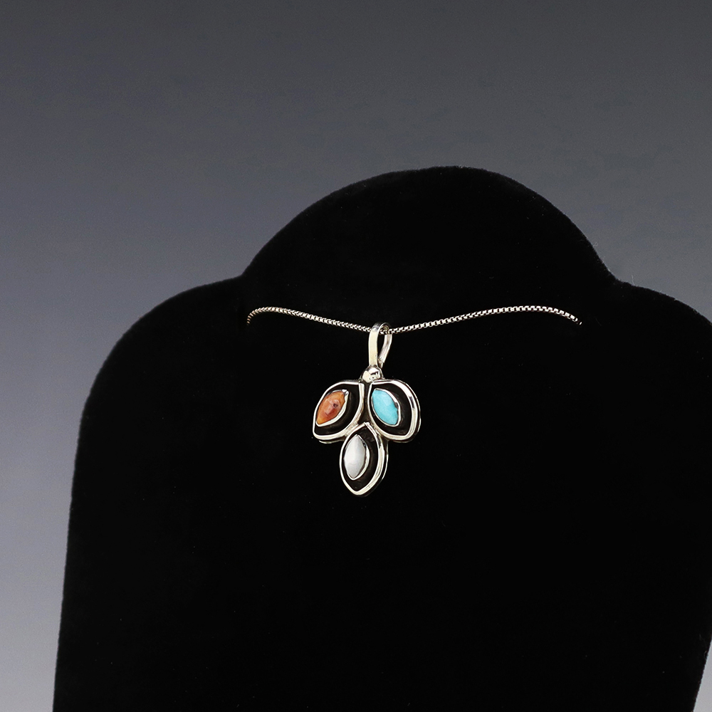 Exquisite pendant that features Turquoise, Coral, Jet, and Mother of Pearl Shell inlaid in a sterling silver setting. Hand made by Leslie and Gladys Lamy from the Zuni Pueblo. Weighs 14 grams. Signed 1 3/8” wide x 2 1/2” long Artist card included Zuni Pueblo is the largest pueblo in...