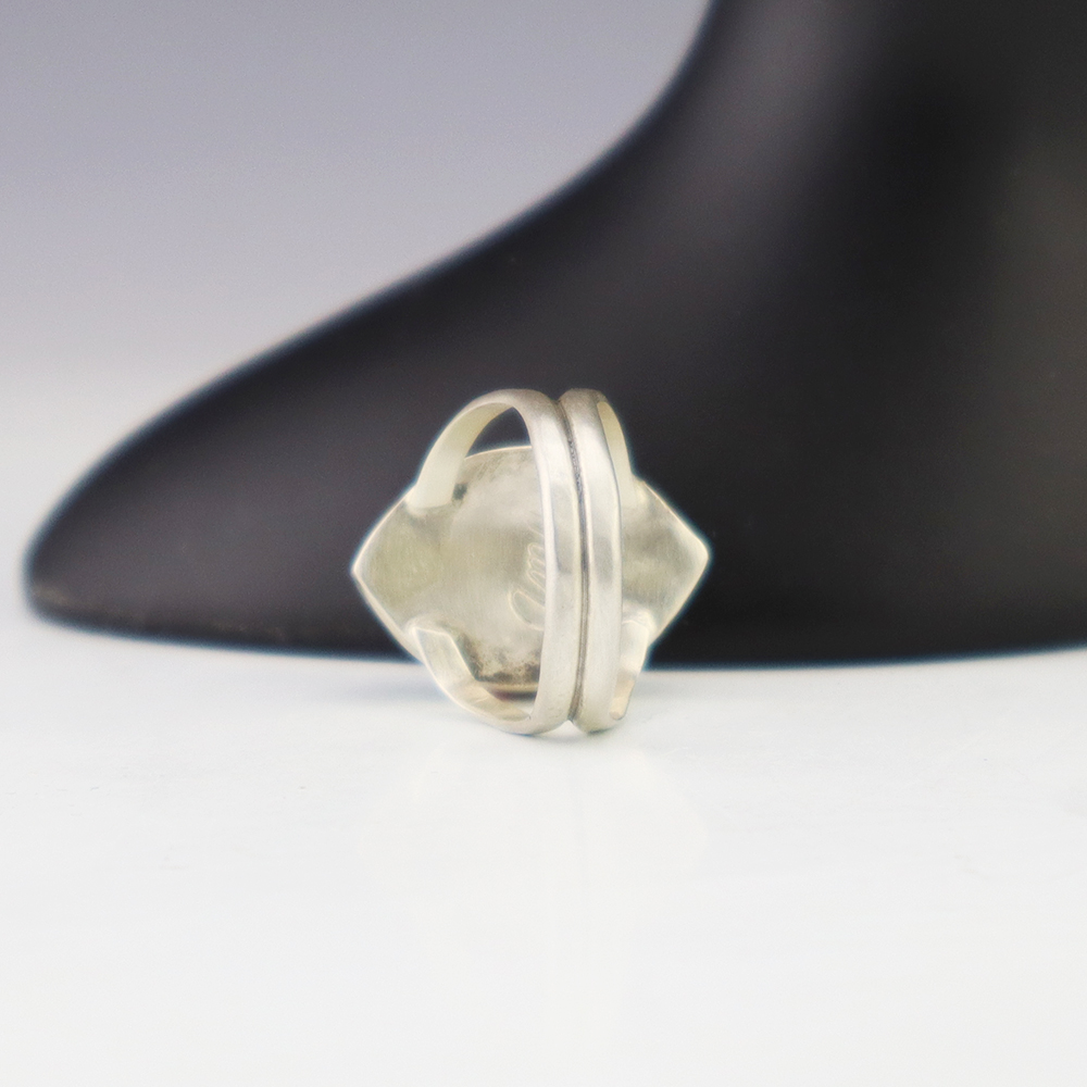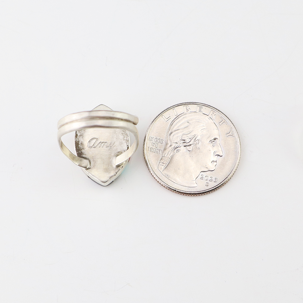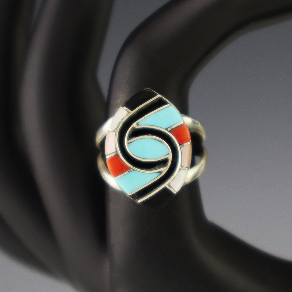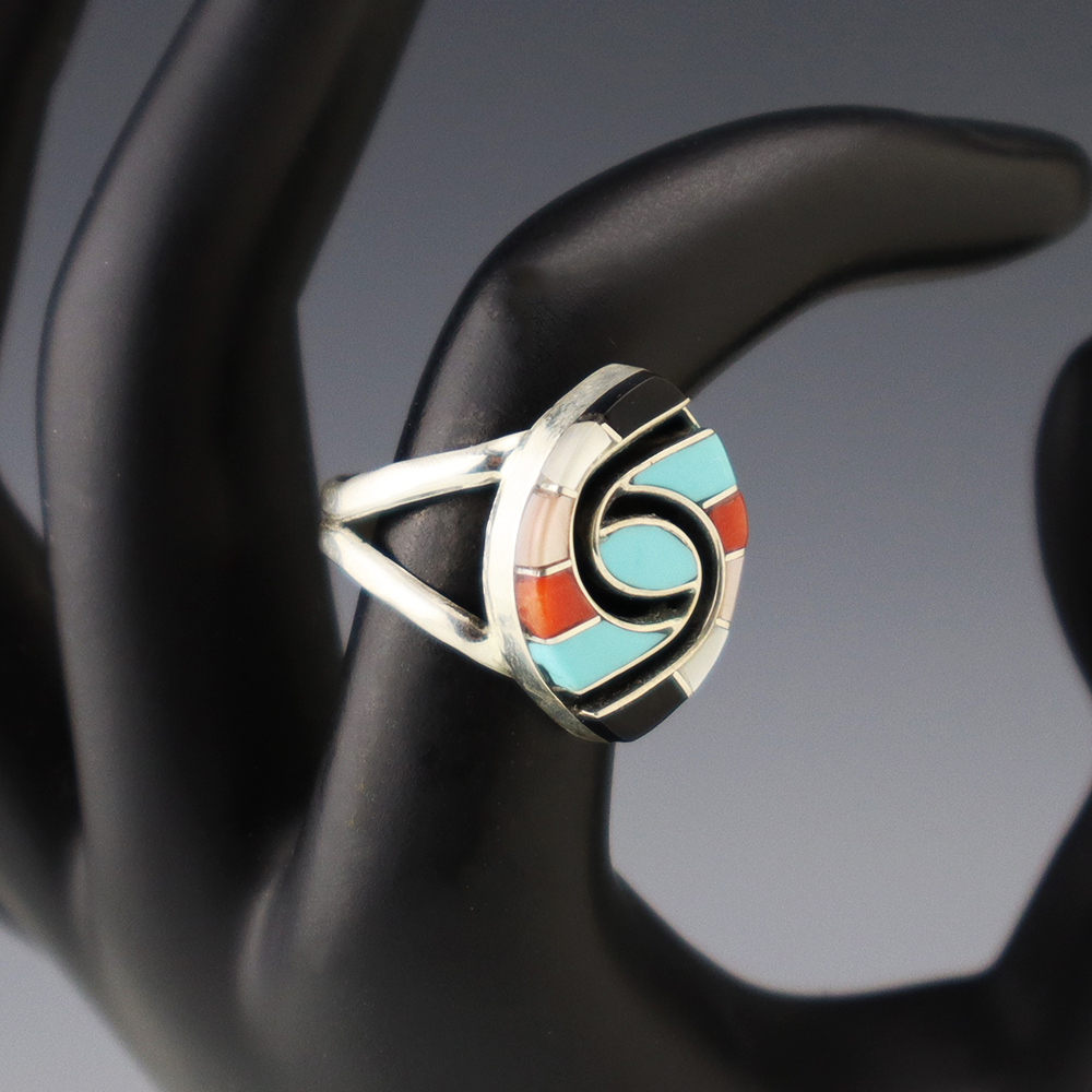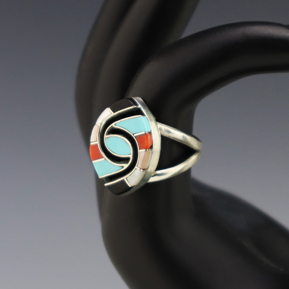 Zuni artist Amy Wesley made this outstanding ring. Made out of sterling silver and set with Turquoise, Coral, Jet, and Mother of Pearl Shell. Weighs 6 grams. Size 7. Signed.