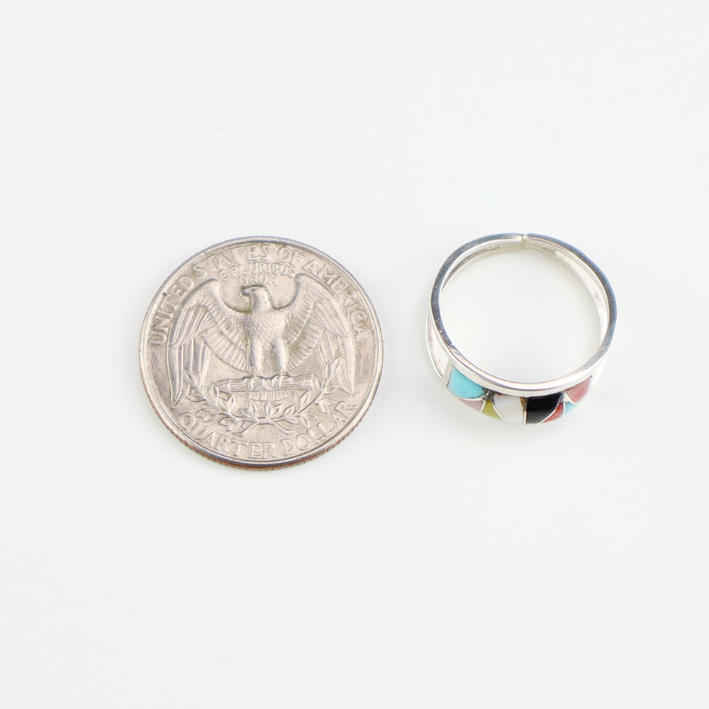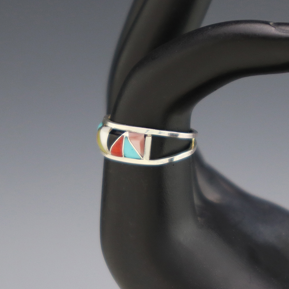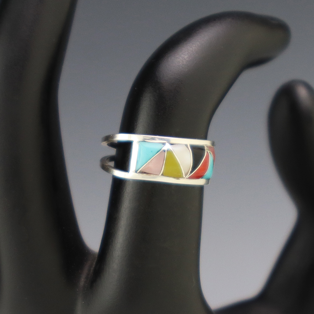Zuni artists are known for their fine lapidary skills. Each stone is hand cut, polished, and set into a sterling silver setting. The ring is set with and Mother of Pearl Shell, Jet, Coral, Pink Mussel, and Turquoise stones. Hand made by Zuni artist Gloria Tucson. Weighs 2 grams. Size 6. Signed