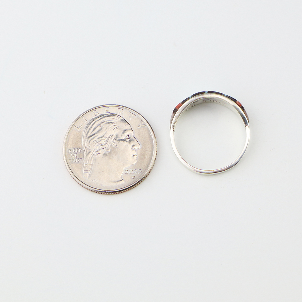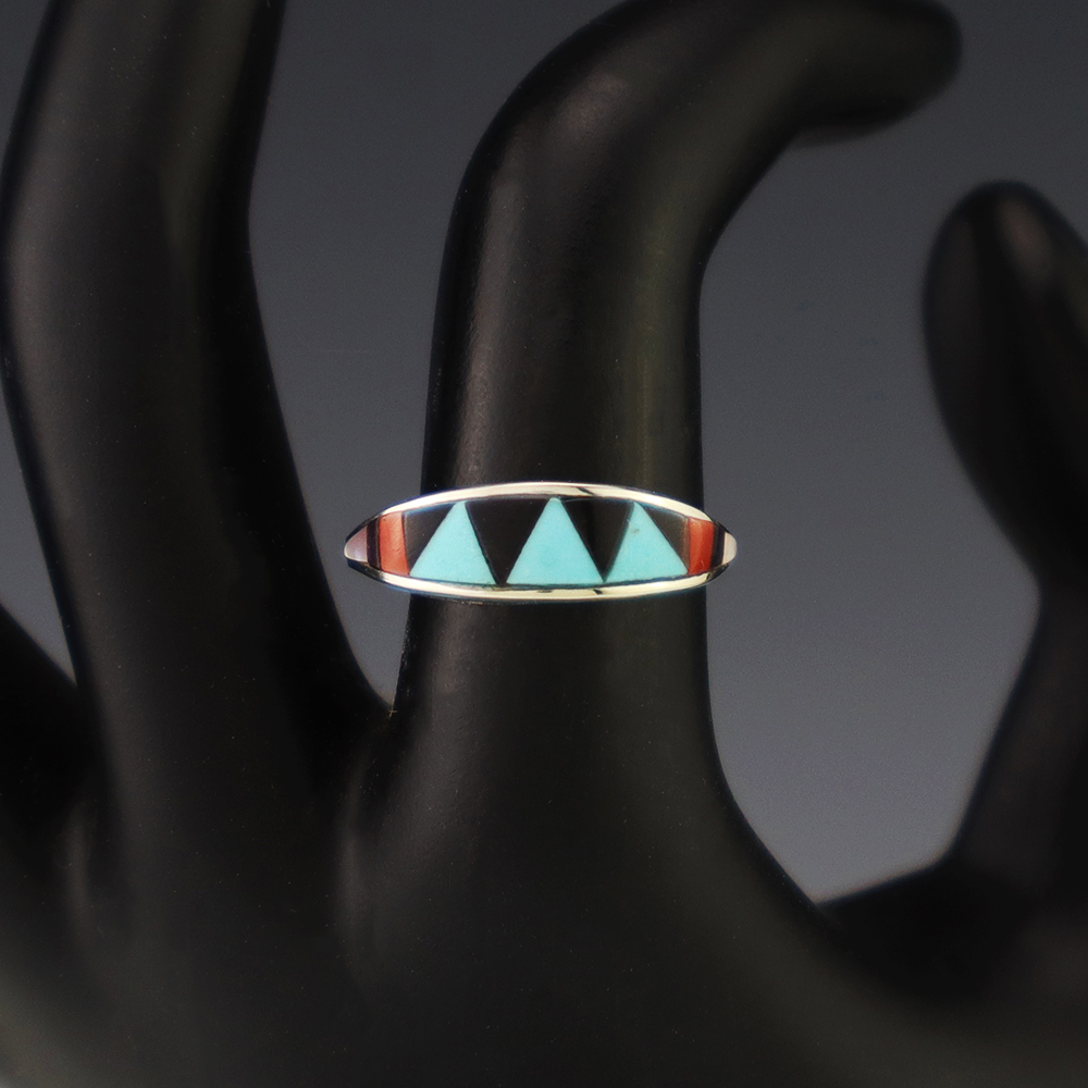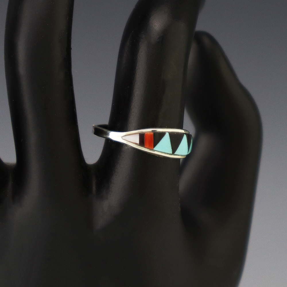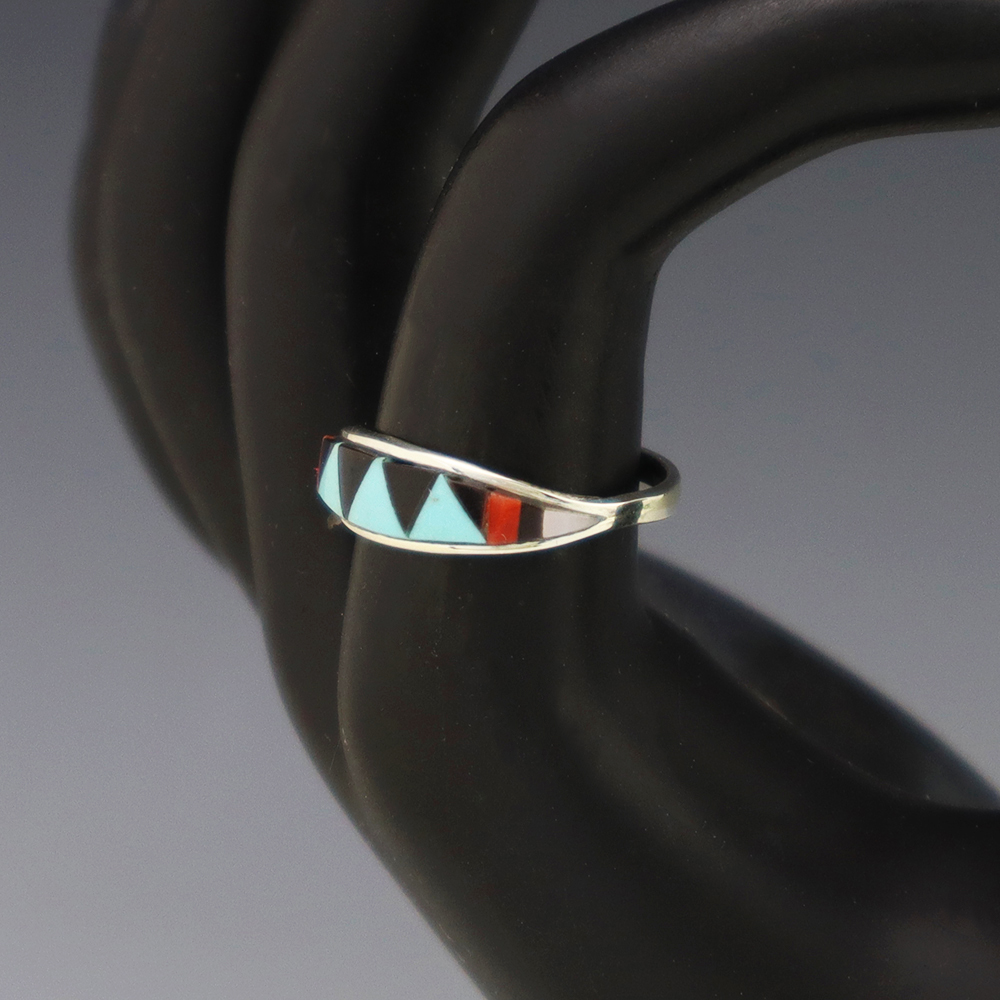 Zuni artists are known for their fine lapidary skills. Each stone is hand cut, polished, and set into a sterling silver setting. The ring is set with Turquoise, Mother of Pearl, Coral, and Jet stones. Hand made by Zuni artist Tammie Qualo. Weighs 2 grams. Size 8. Signed