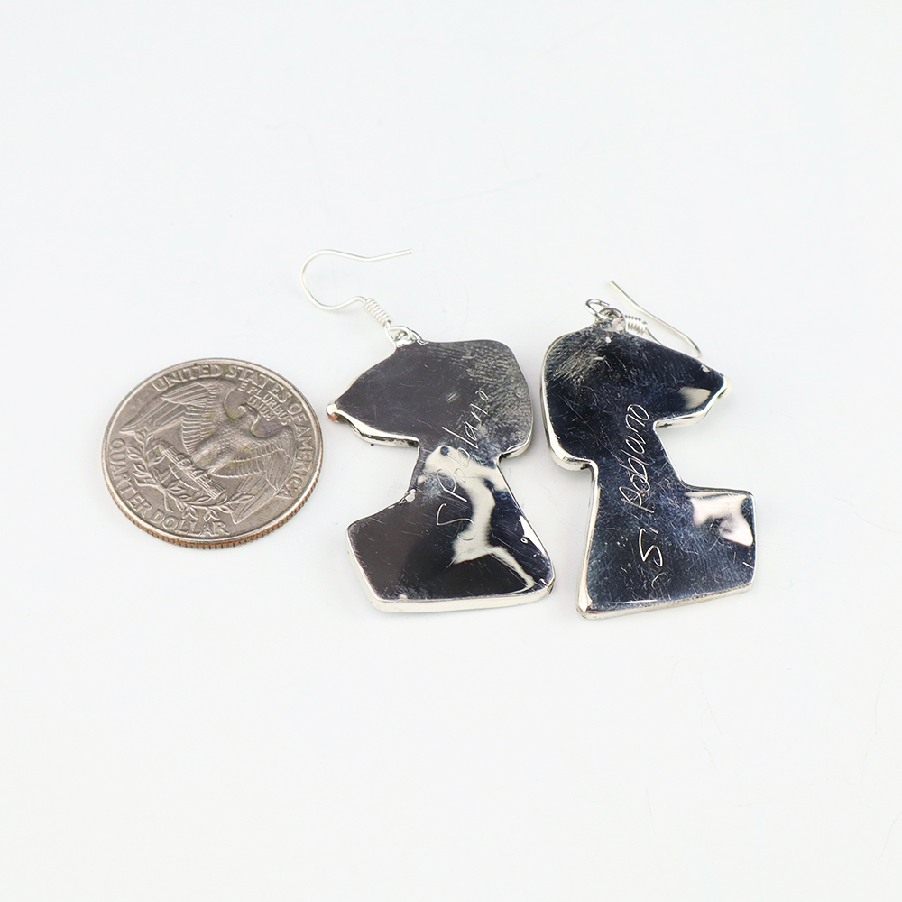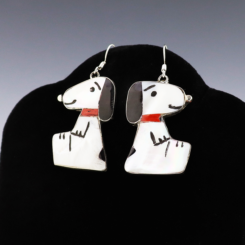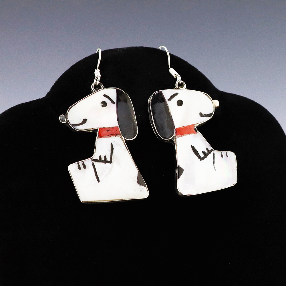Zuni artist Shenel Poblano made these adorable Snoopy earrings. Made out of sterling silver and inlaid with Coral, Mother of Pearl Shell, and Jet. Zuni artists are known for their lapidary work. Weighs 8 grams. Signed