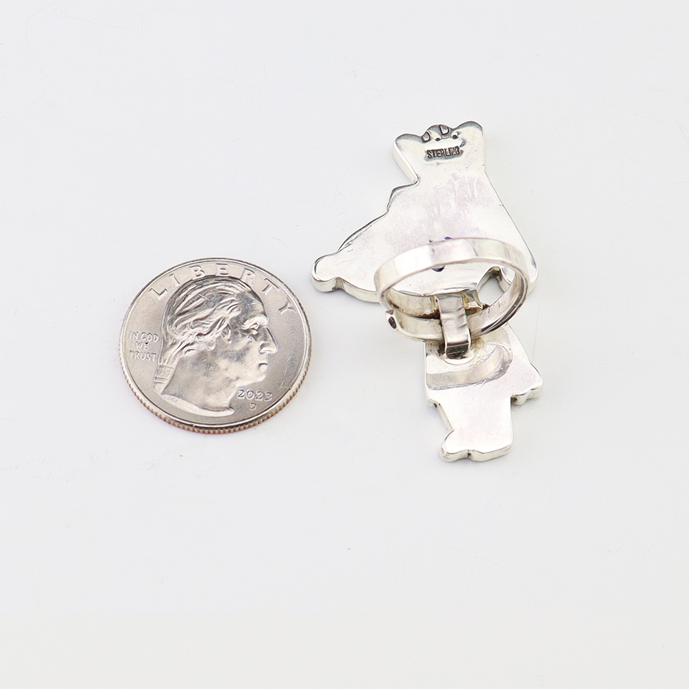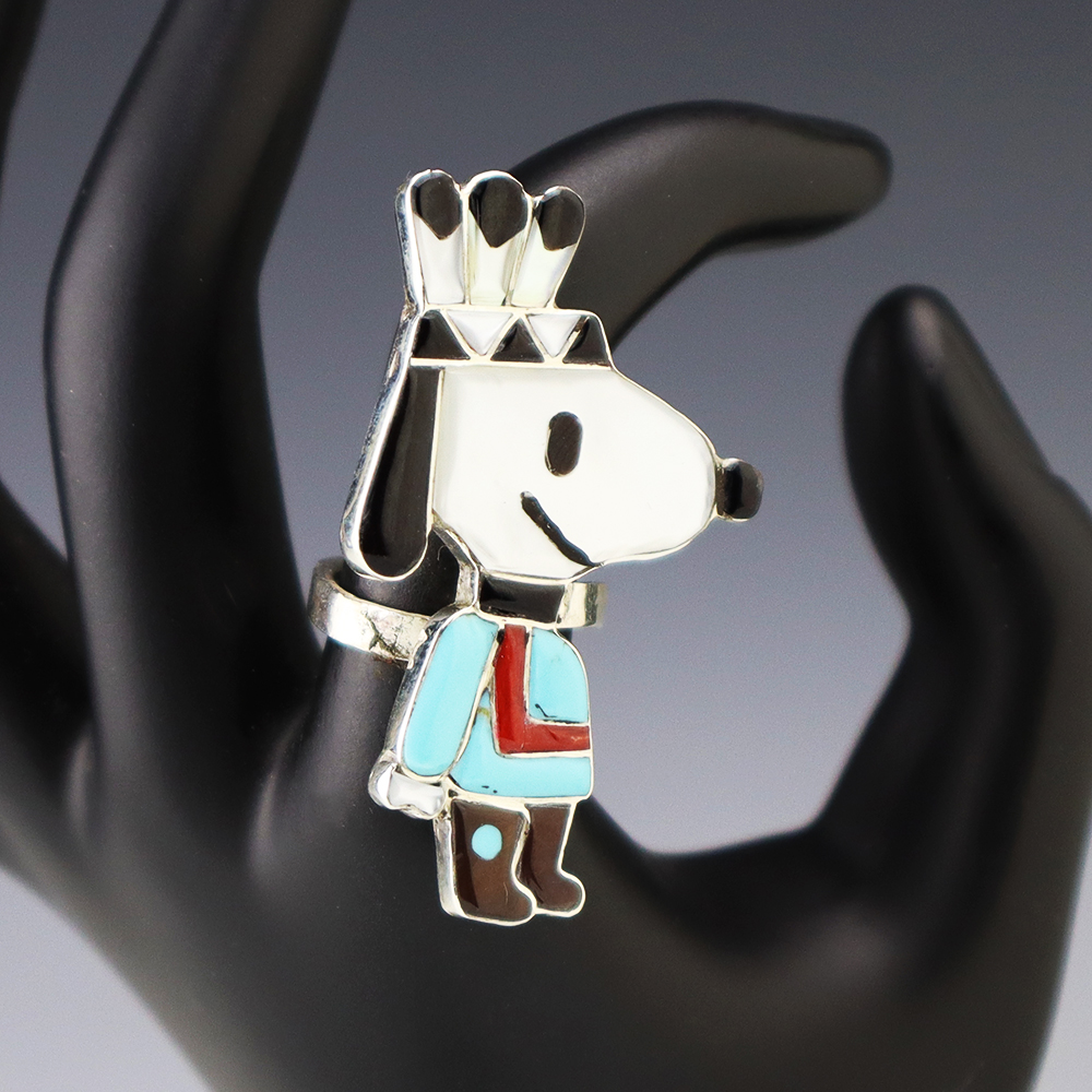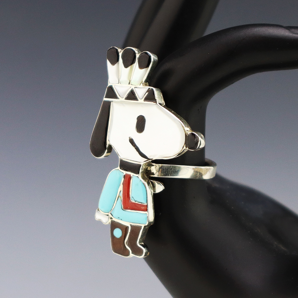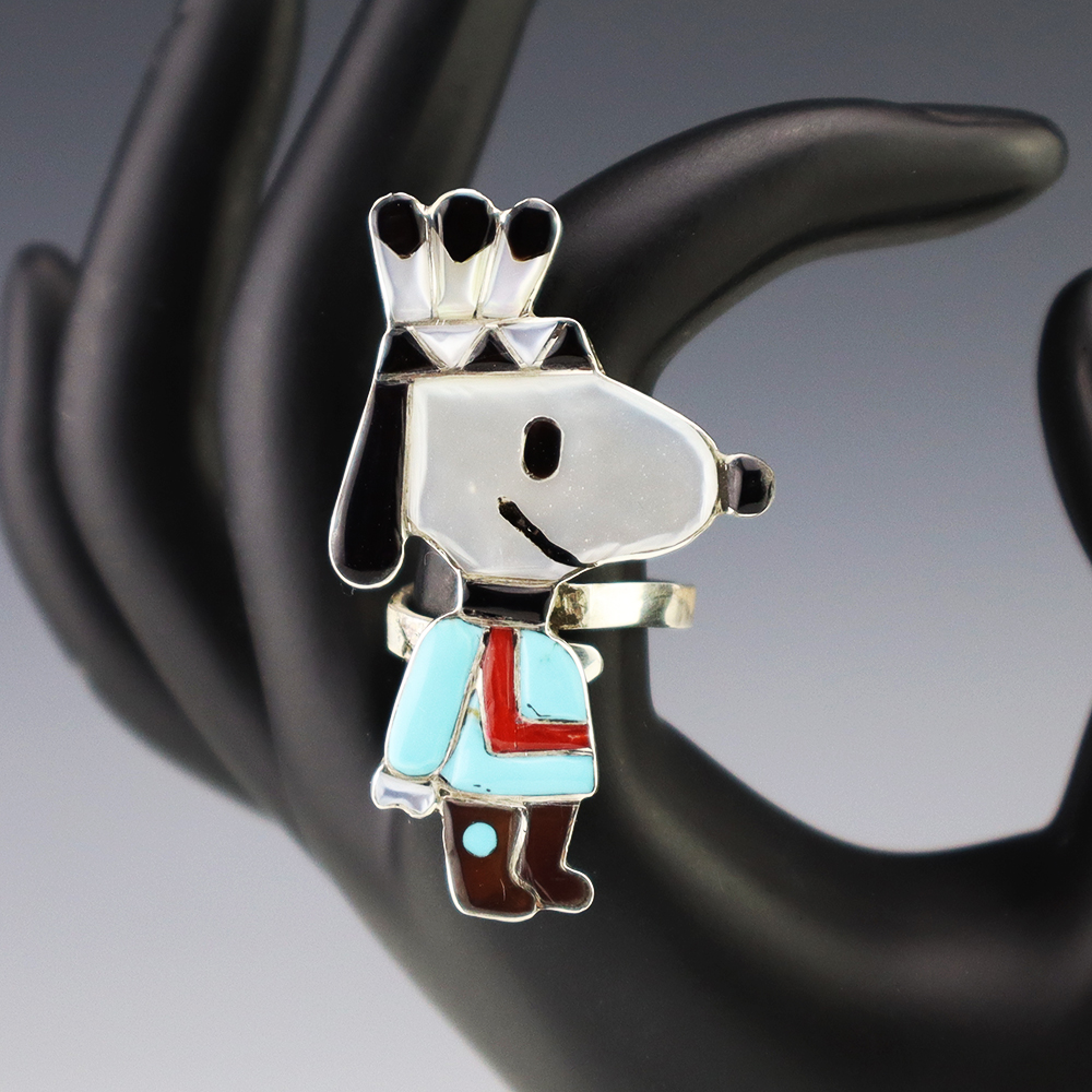 Zuni artist Don Dewa made this stellar Yosemite Sam ring. Zuni artists are known for their fine lapidary skills. Each stone is hand cut, polished, and set into a sterling silver setting. The ring is inlaid with Turquoise, Penn Shell, Mother of Pearl Shell, Coral, and Jet. Weighs 12 grams. Size 7 1/2 and is slightly adjustable. Signed