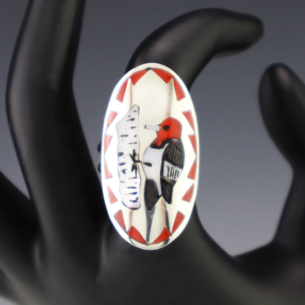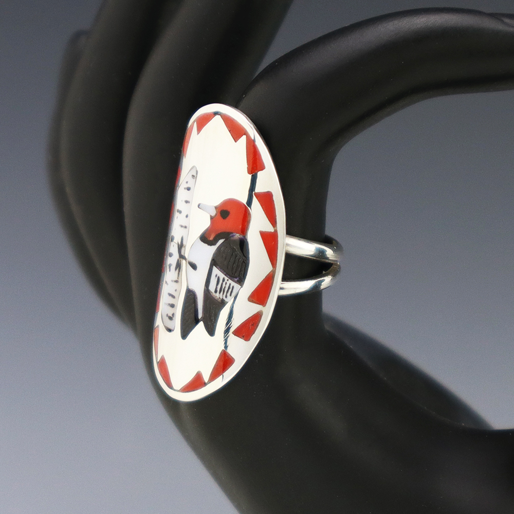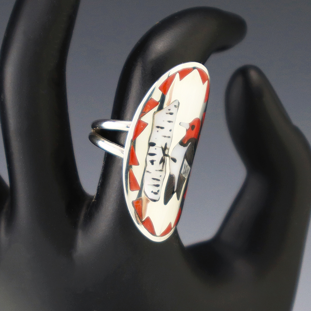 Amazing inlay work! Zuni jewelry makers, Nancy and Sheldon Westika created this magnificent ring. Made out of sterling silver and inlaid with Kingman Turquoise and Jet. Zuni artists are known for their lapidary work. The Westikas have been making jewelry since the 1970’s and they are known for their fine...