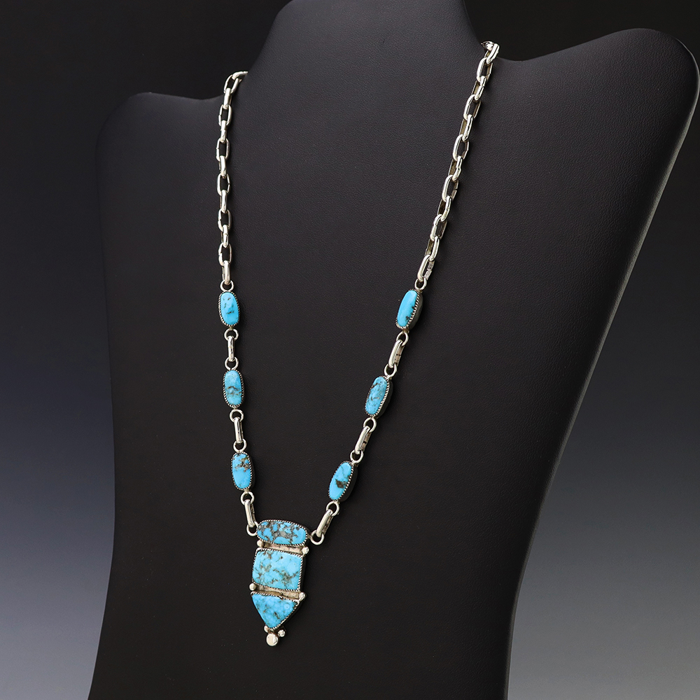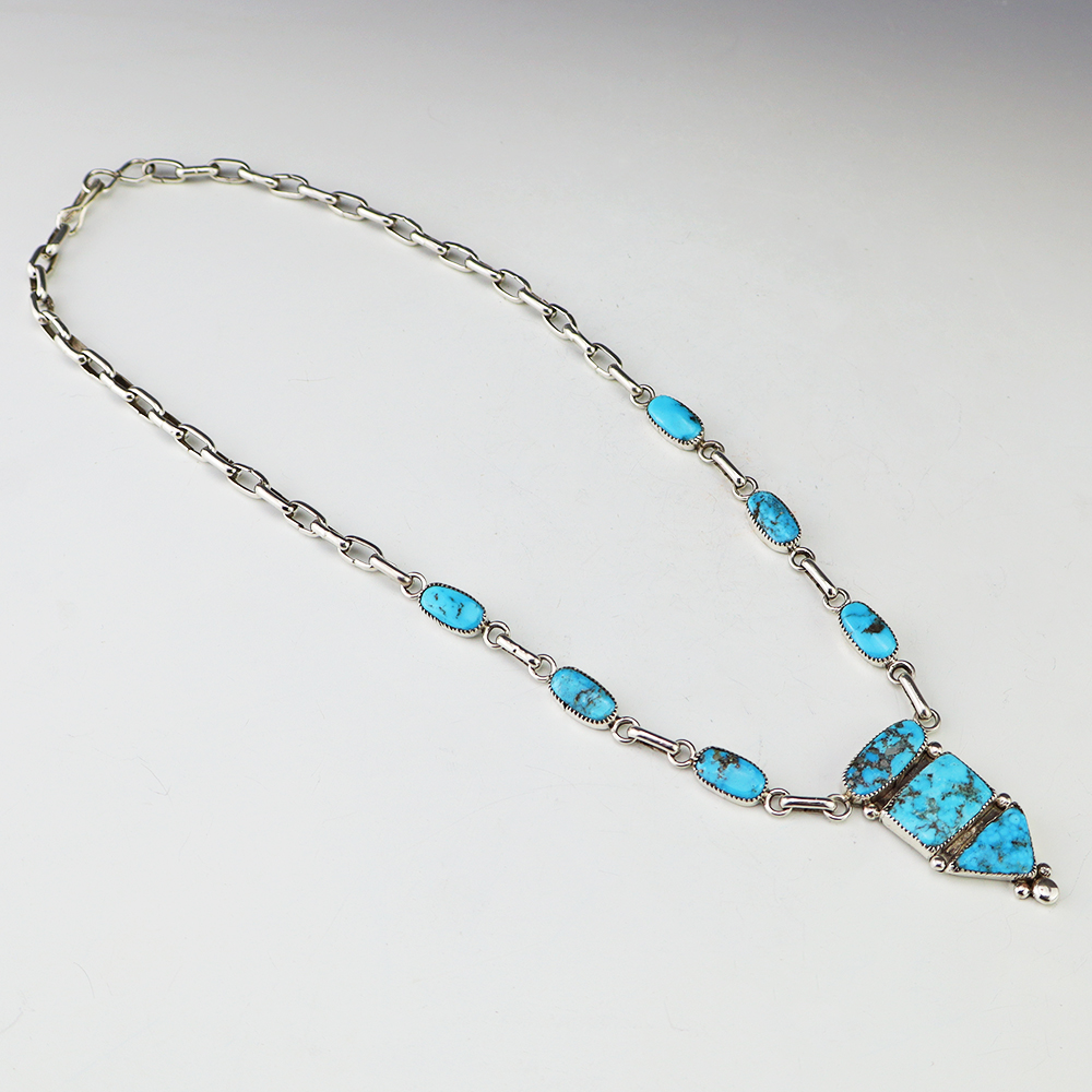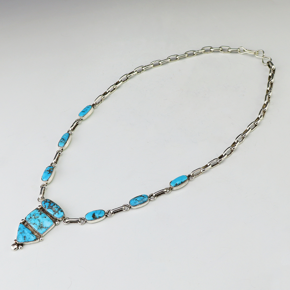 Zuni artists are known for their fine lapidary skills. Each stone is hand cut, polished, and set into a sterling silver setting. Zuni jeweler Diane Lonjose made this gorgeous necklace. Sterling silver with natural Kingman Turquoise. The components are all hand fabricated, and the stones are all natural. Diane comes from a family of Zuni jewelers. She is the daughter of Alice and Duane Quam, and grandchild of Doris and Warren Ondelacy. It weighs 30 grams. Signed