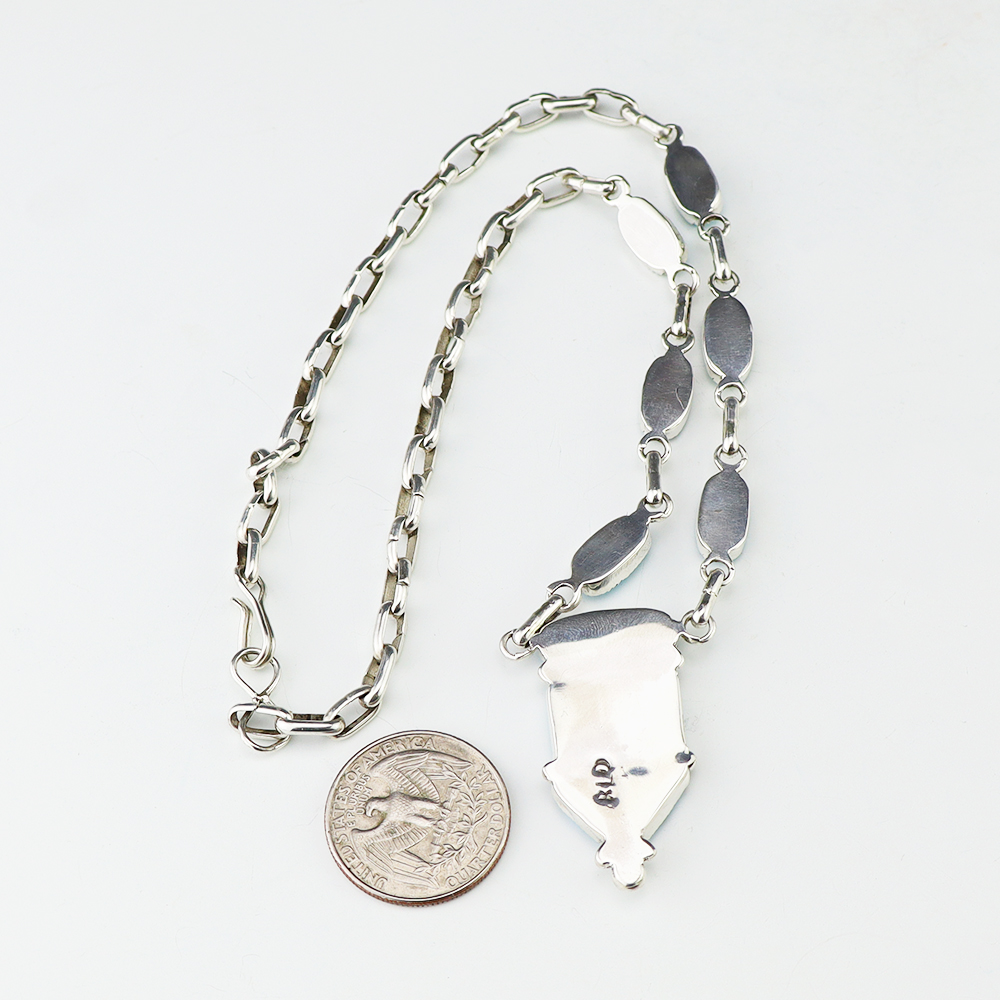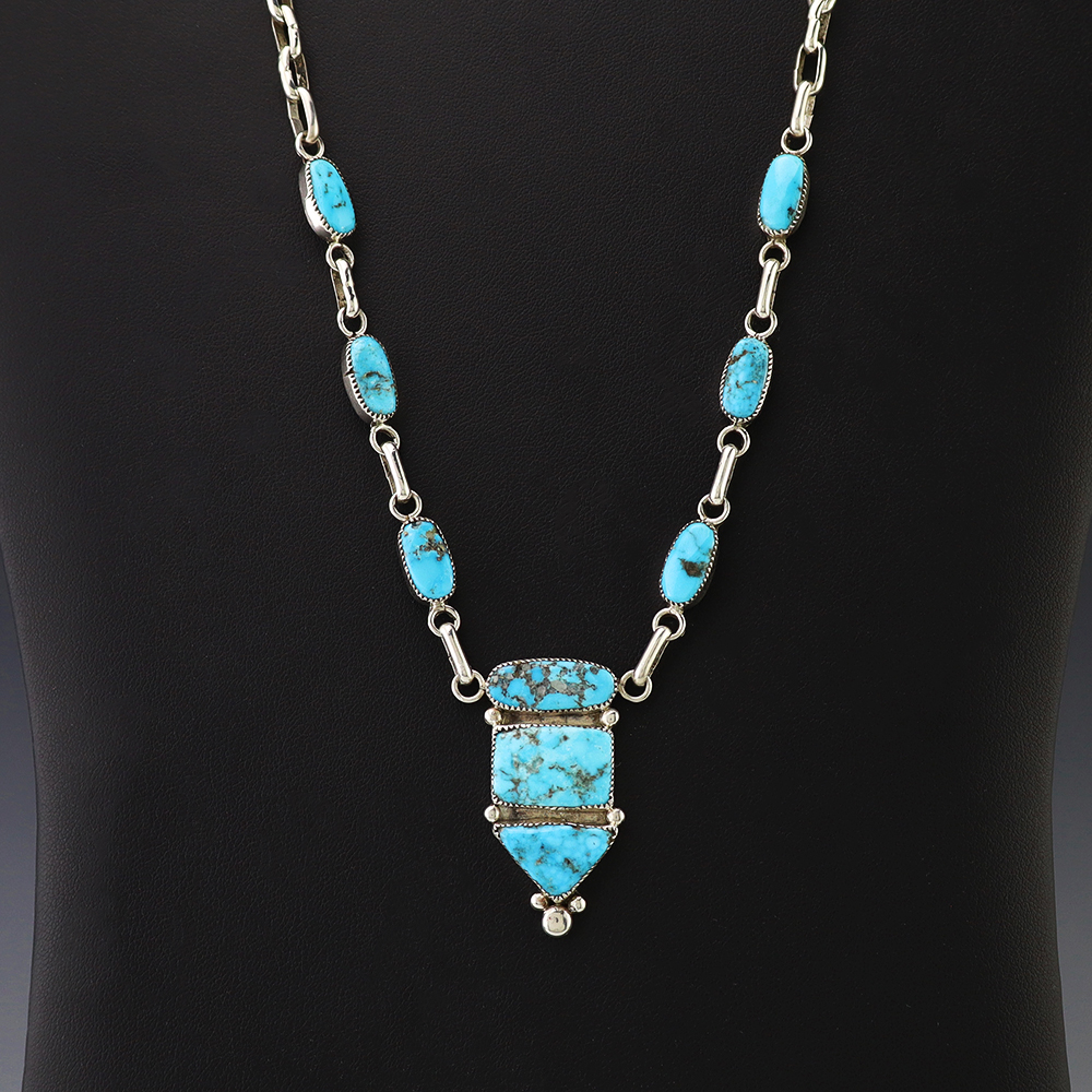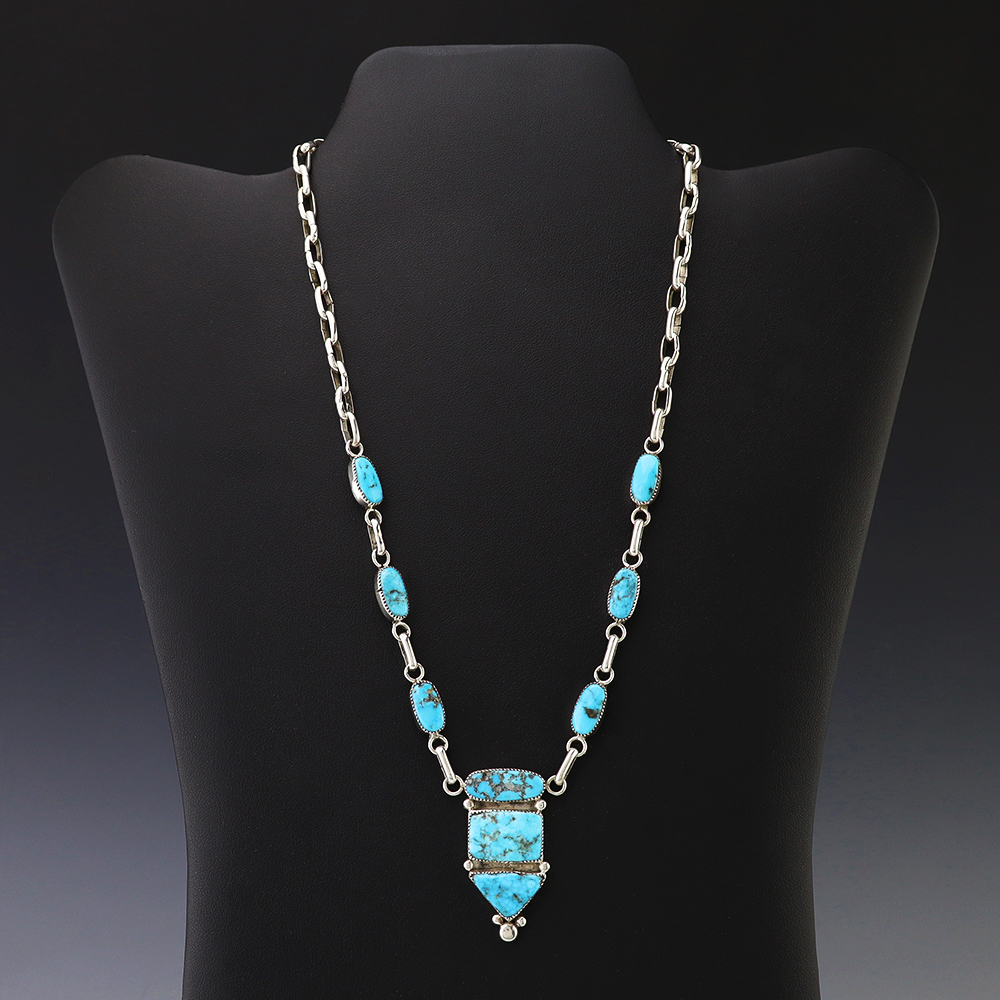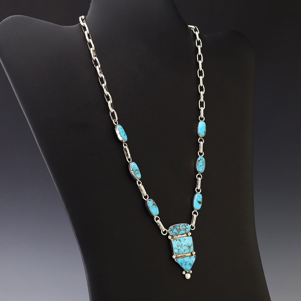 Zuni artists are known for their fine lapidary skills. Each stone is hand cut, polished, and set into a sterling silver setting. Zuni jeweler Diane Lonjose made this gorgeous necklace. Sterling silver with natural Kingman Turquoise. The components are all hand fabricated, and the stones are all natural. Diane comes from a family of Zuni jewelers. She is the daughter of Alice and Duane Quam, and grandchild of Doris and Warren Ondelacy. It weighs 30 grams. Signed