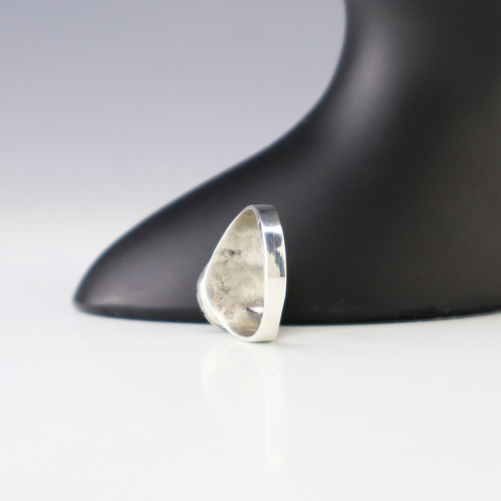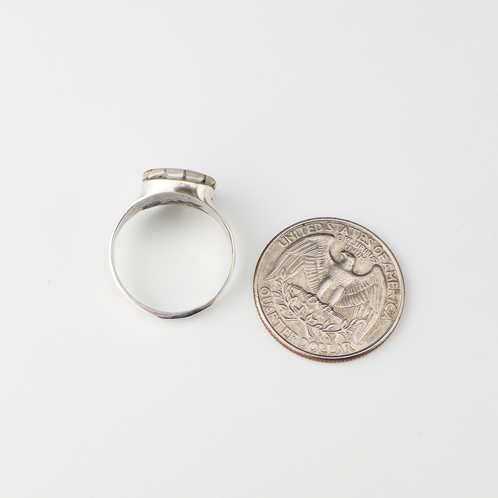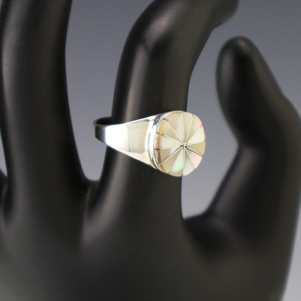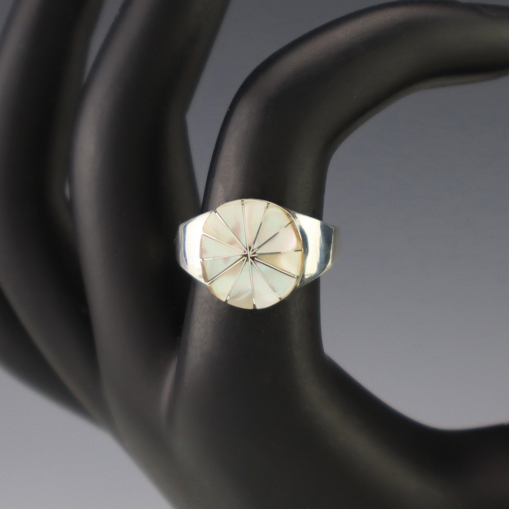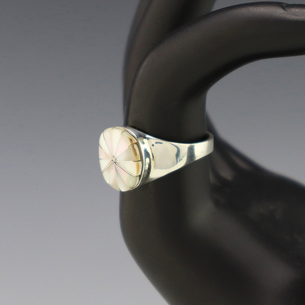 Zuni artist Johnson Laweka made this lovely ring out of sterling silver and Mother of Pearl Shell. Weighs 6 grams. Size 7 1/2. Signed