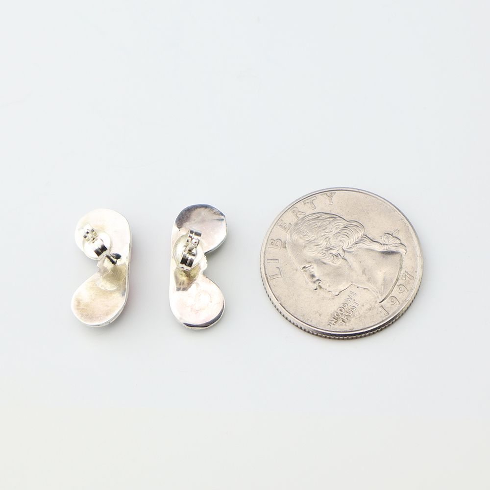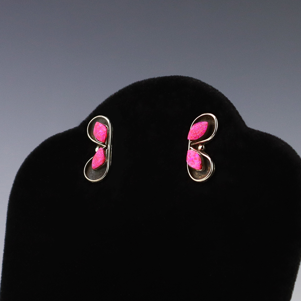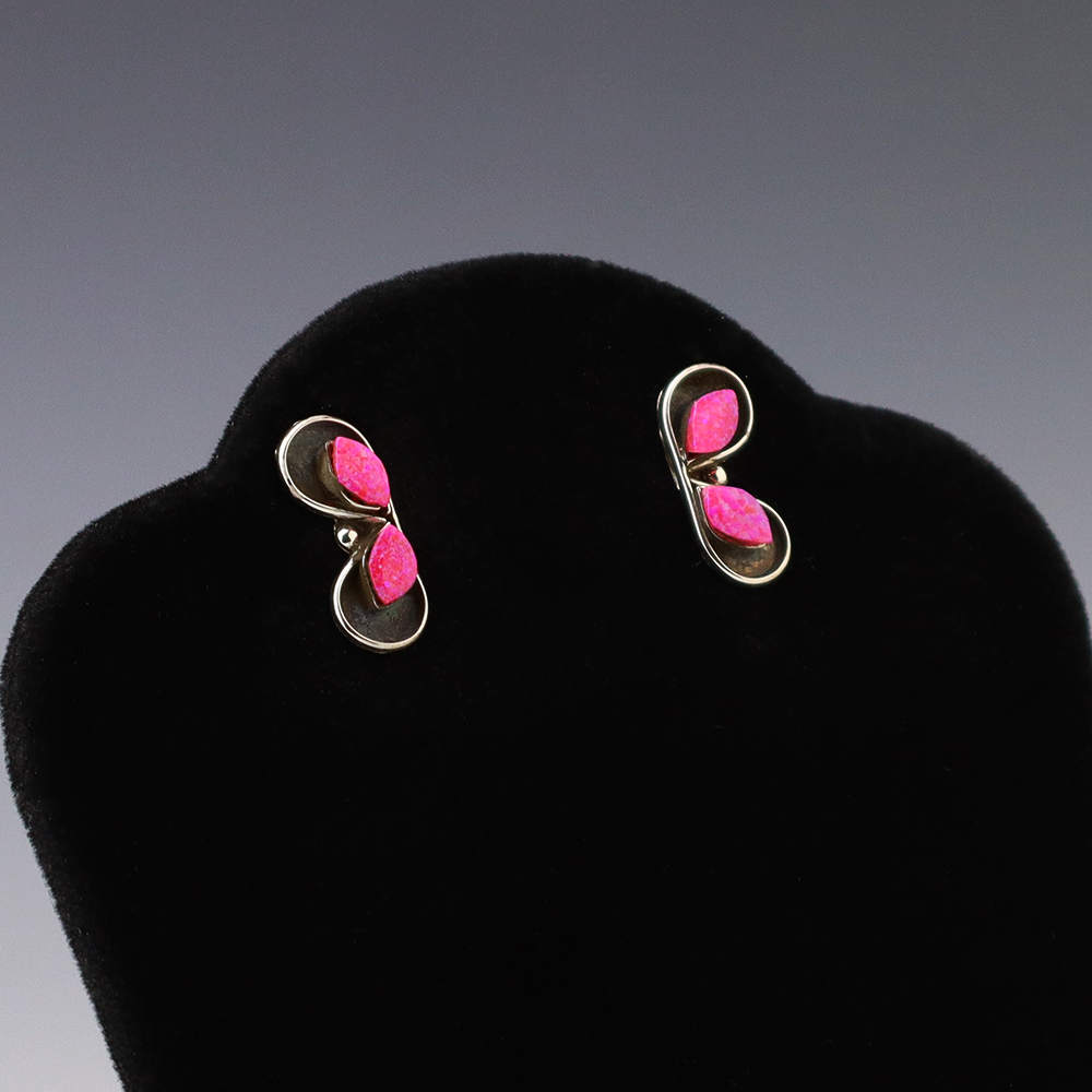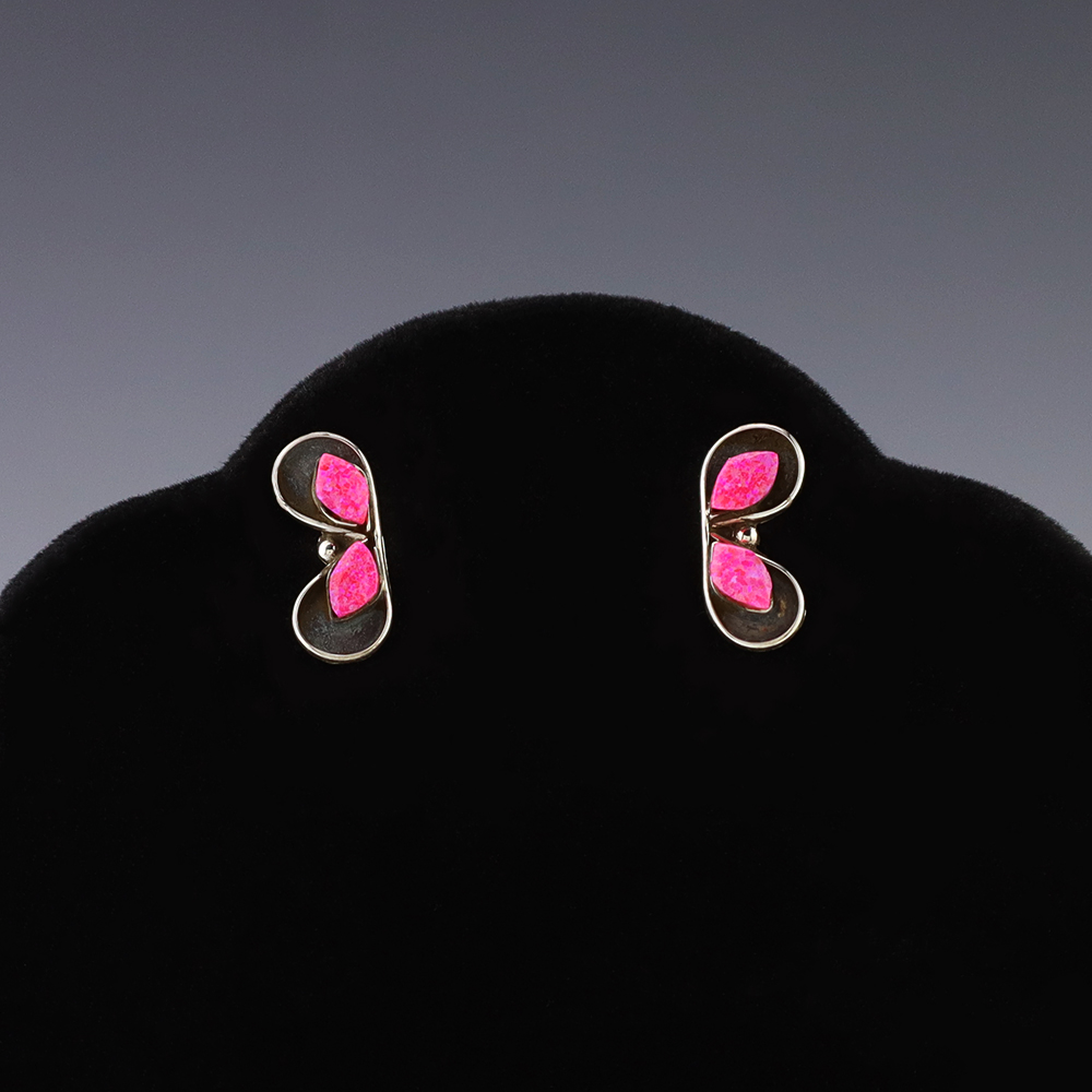 Each earring features Laboratory Opal stones inlaid into a sterling silver setting. Hand made by Zuni jeweler Charlotte Natewa. These gorgeous earrings will become a versatile accessory in your jewelry collection. Weighs 2 grams.